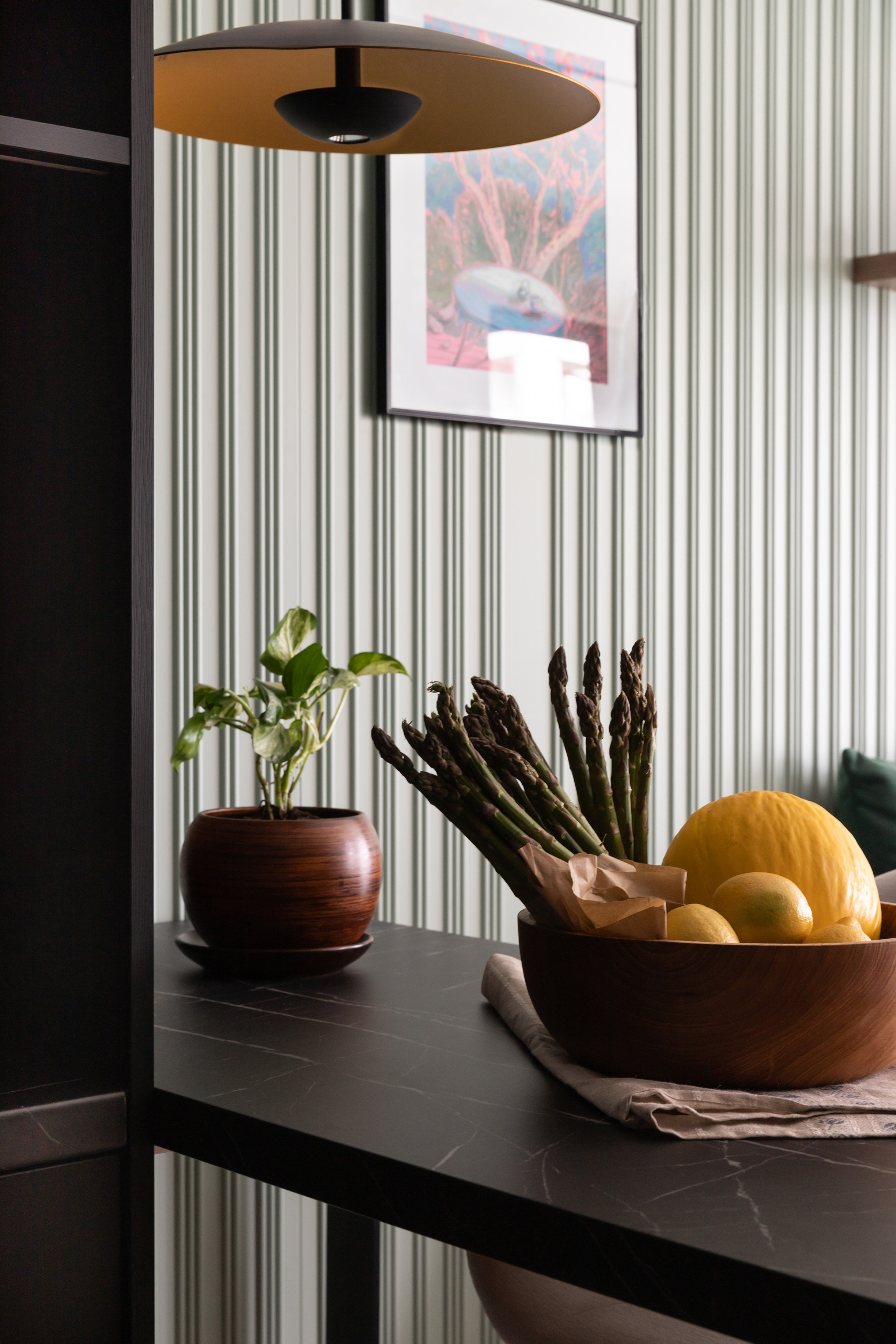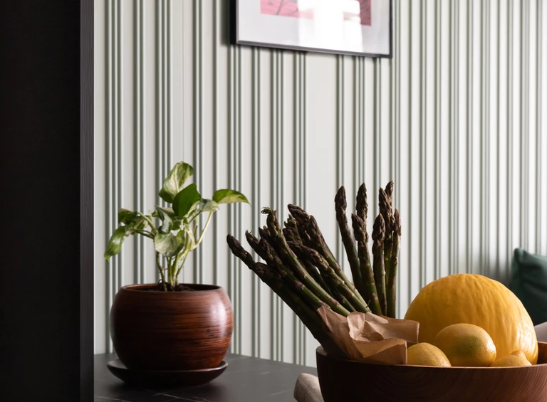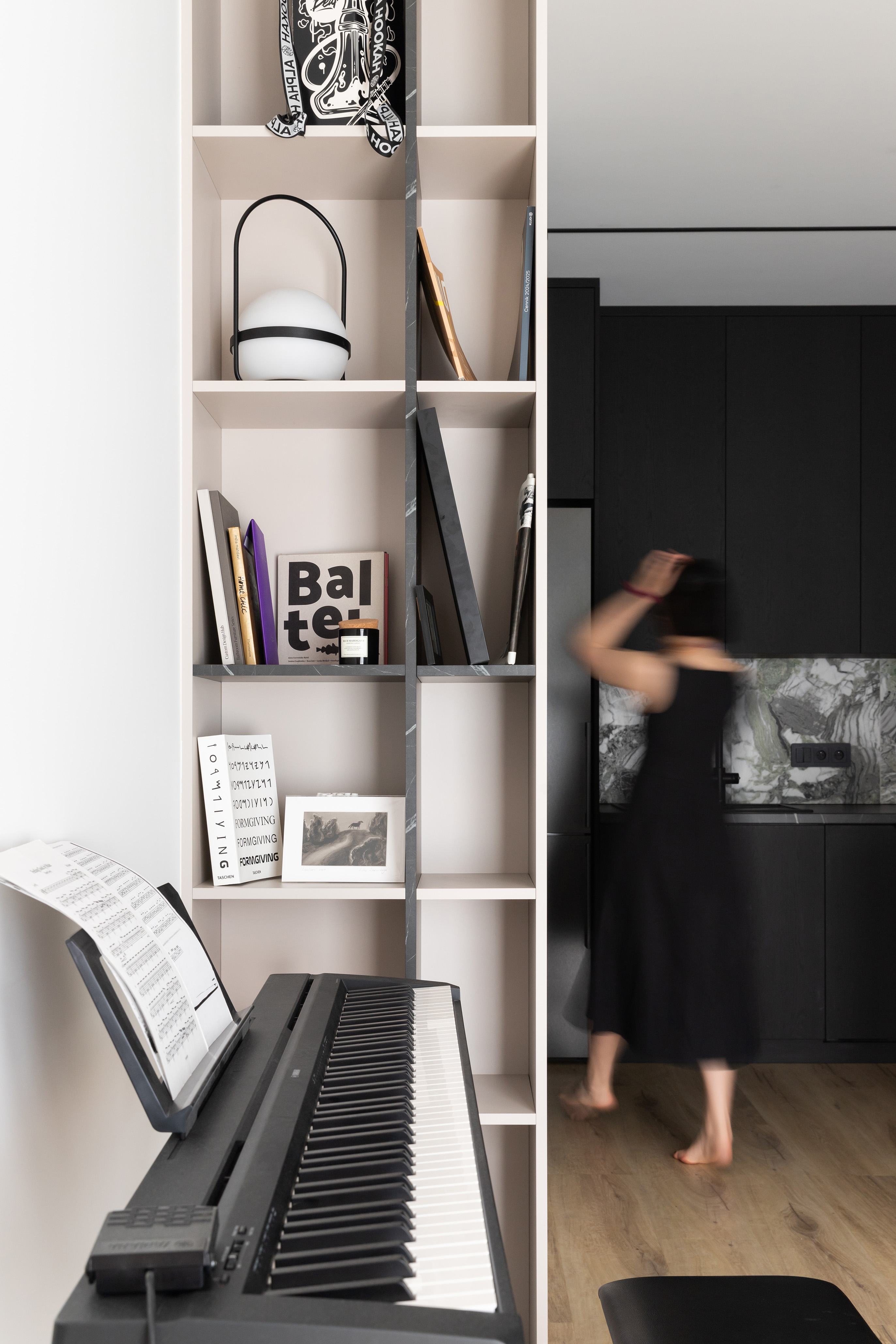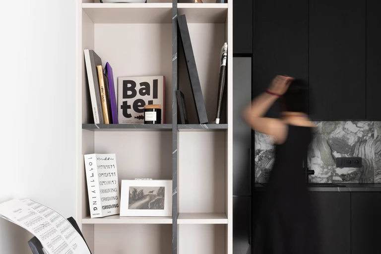 Obie strefy – kuchnię i salon – łączy nie tylko otwarta przestrzeń, ale przede wszystkim kompozycja. Mebel o reliefowej, rytmicznej powierzchni płynnie przechodzi z aneksu kuchennego do części wypoczynkowej, wizualnie scalając te dwa obszary. Rytm ten jest subtelnym hołdem dla muzyki, przywodząc na myśl klawisze pianina.