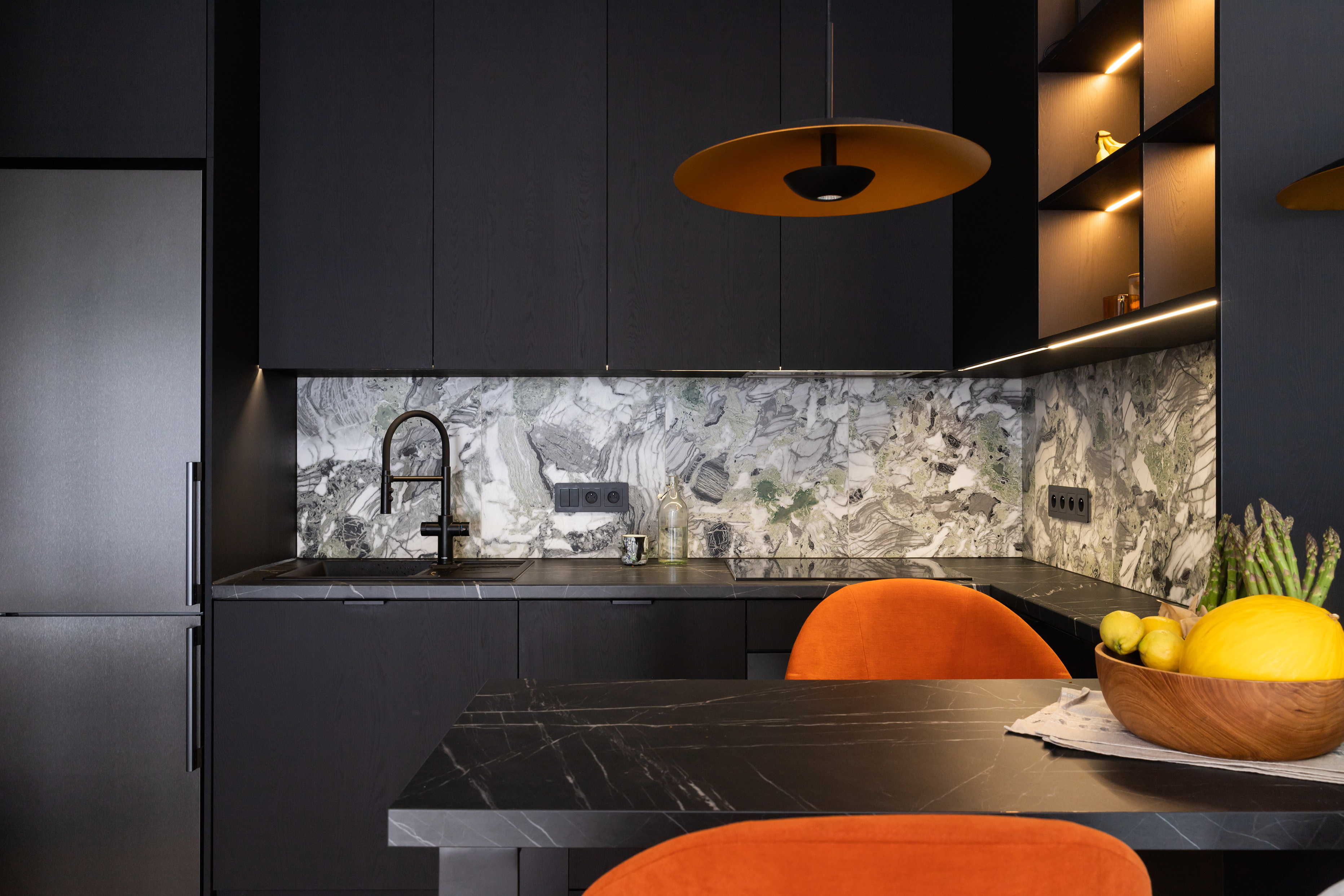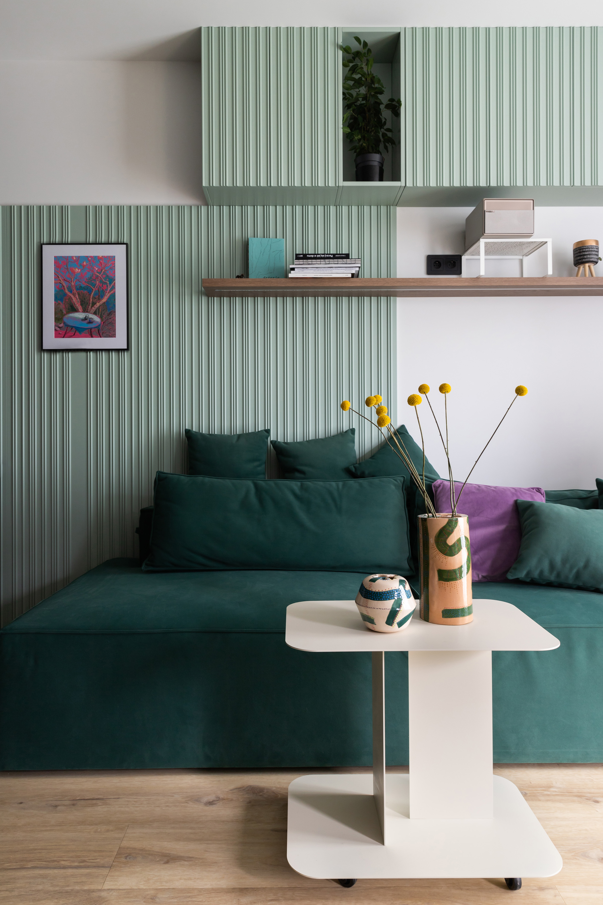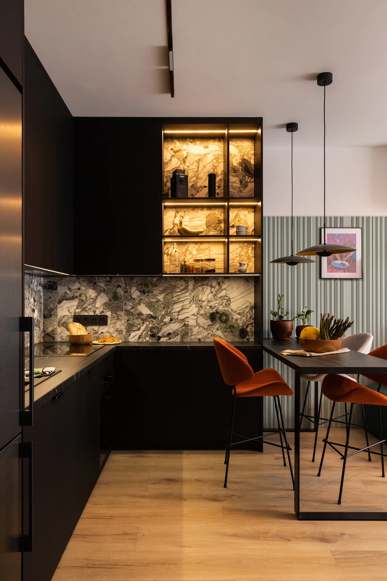 Obie strefy – kuchnię i salon – łączy nie tylko otwarta przestrzeń, ale przede wszystkim kompozycja. Mebel o reliefowej, rytmicznej powierzchni płynnie przechodzi z aneksu kuchennego do części wypoczynkowej, wizualnie scalając te dwa obszary. Rytm ten jest subtelnym hołdem dla muzyki, przywodząc na myśl klawisze pianina.