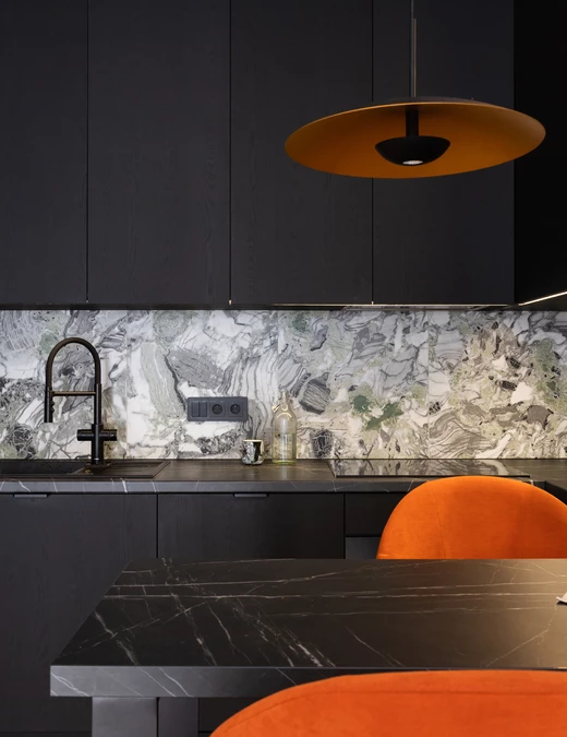 Centralnym punktem, który definiuje charakter części dziennej, jest kuchnia. Jej fronty, wykonane z materiału Egger PerfectSense Feelwood, mają szlachetną, matową fakturę, która doskonale oddaje charakter naturalnego drewna, pozostając przy tym odporną na odciski palców. Tłem dla tej stolarskiej precyzji są płyty gresu Fioranese Ceramica z kolekcji Sound of Marbles Screziato Vivace. Ich powierzchnia, pełna naturalnych żyłek i kontrastów, wizualnie nawiązuje do górskich krajobrazów – skał porośniętych mchem, minerałów i gry światła.