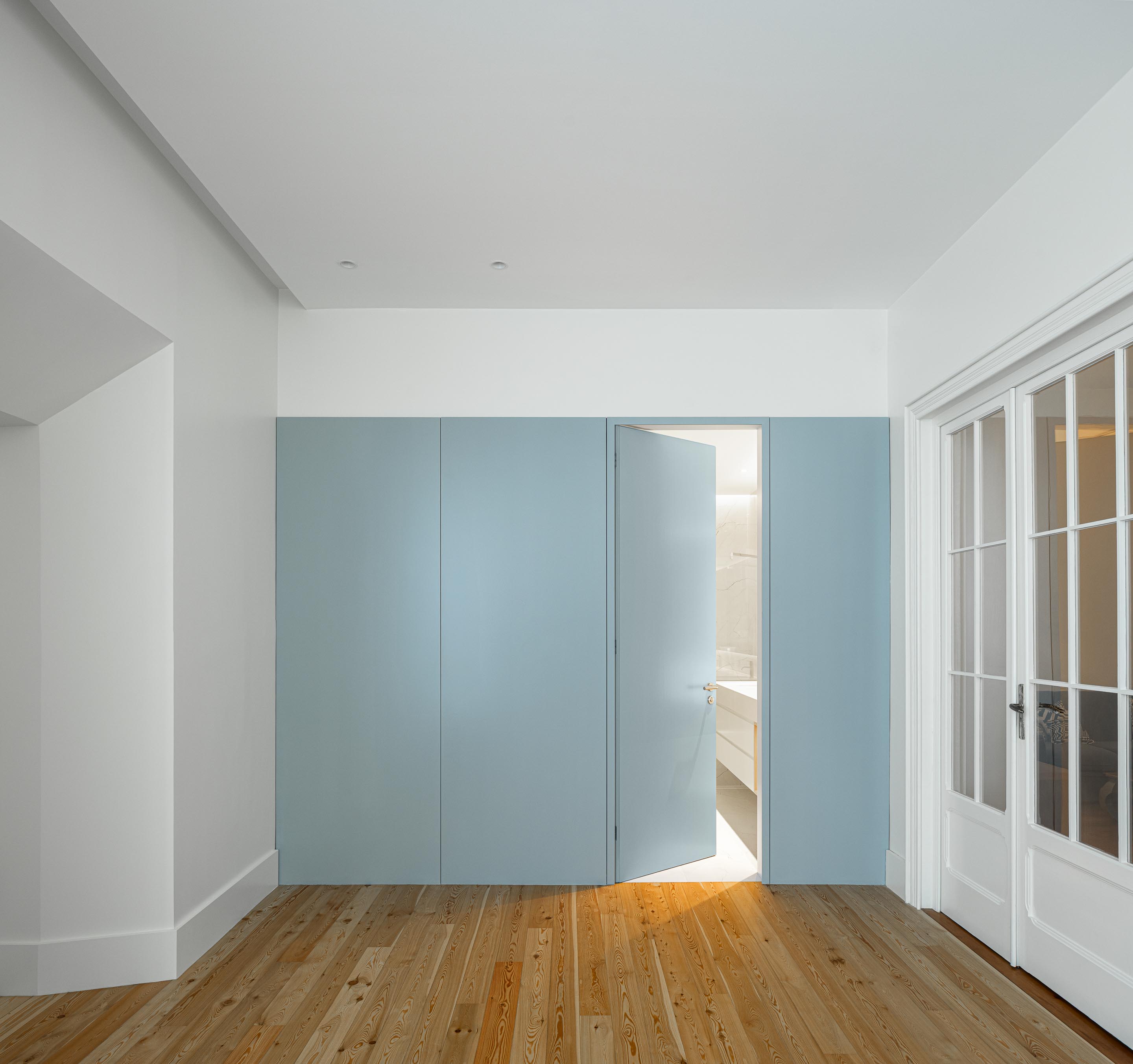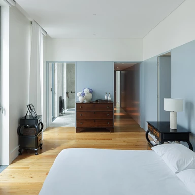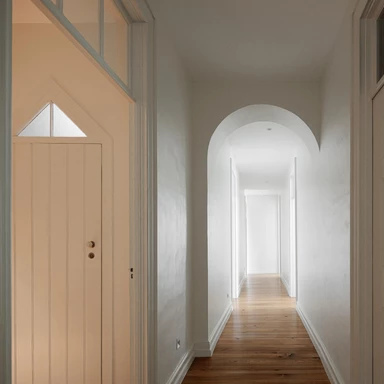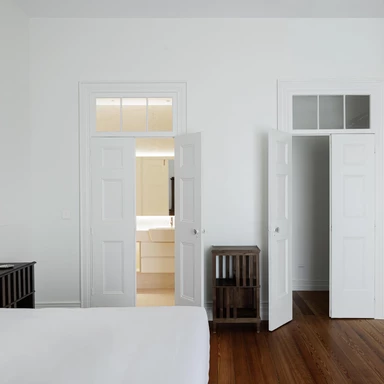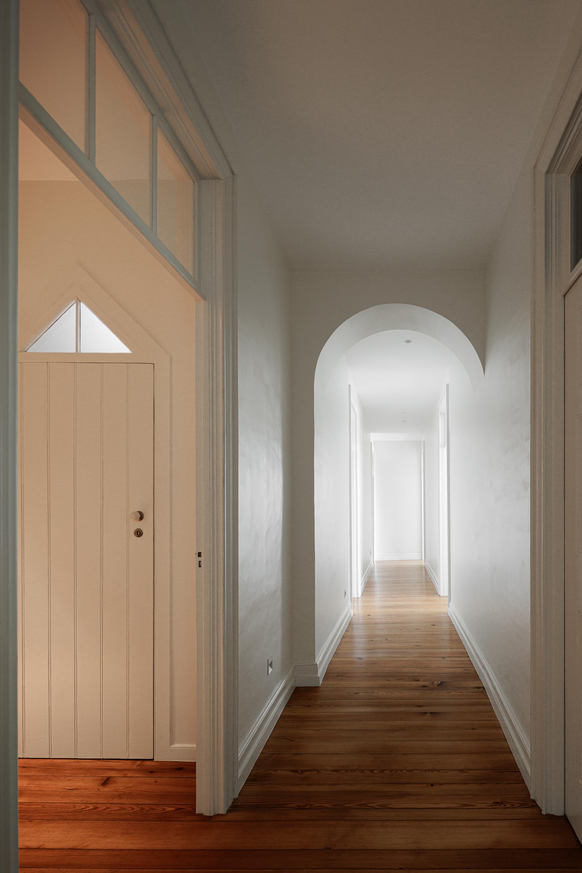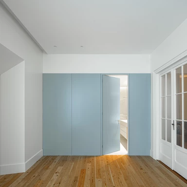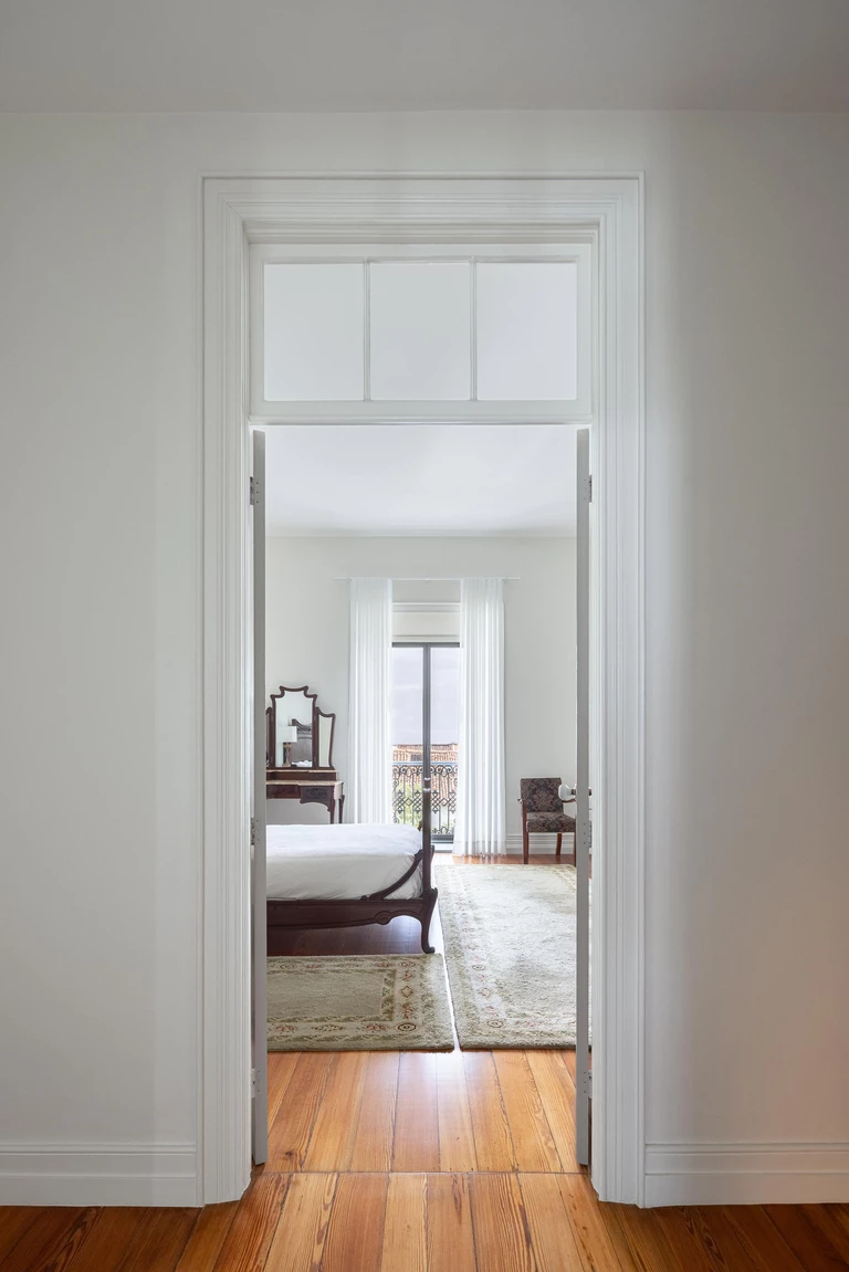 Istotną rolę we wnętrzu odgrywa światło dzienne, wprowadzane przez istniejące otwory i wzmacniane tam, gdzie codzienne życie skupia się najintensywniej. We wnętrzach przywrócono, tam gdzie było to możliwe, oryginalne podłogi drewniane, stolarkę i klatkę schodową, a część prywatna zyskała większą autonomię dzięki własnym łazienkom, podczas gdy strefy wspólne stały się bardziej płynne i otwarte wizualnie.