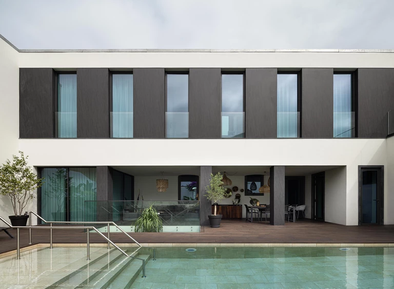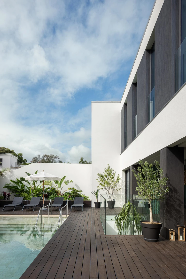 Centralnym punktem tej części domu stał się basen osadzony na podniesionej drewnianej konstrukcji. Ten detal nie służy jedynie kompozycji, lecz pozwala zachować przepuszczalność gruntu i zostawia terenowi możliwość „oddychania”. Drewniane patio wydłuża przestrzeń wnętrz, prowadząc ją miękko ku ogrodowi, a otwarte spoiny wzmacniają wrażenie lekkości; równolegle zachowano istniejące kamienne patia z kamienia wulkanicznego, które pozostają materialnym śladem miejsca.