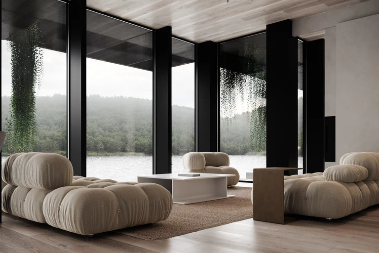 To, co sprawia, że wnętrze jest tak harmonijne, to fakt, że siedlisko – mimo że ma powierzchnię 250 m2 – jest pozbawione podziałów. Przestronną strefę dzienną tworzy strefa wypoczynkowa z sofami o fantazyjnych, obłych kształtach z widokiem na jezioro i las. Ta część zdaje się zlewać z taflą wody na zewnątrz.