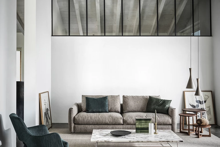 I oto minimalistyczne obramowania drzwi i okien, ściany w białym i szarym kolorze, wysokie sufity z widocznymi deskami stropowymi tworzą powściągliwe tło dla mebli marki Flexform.