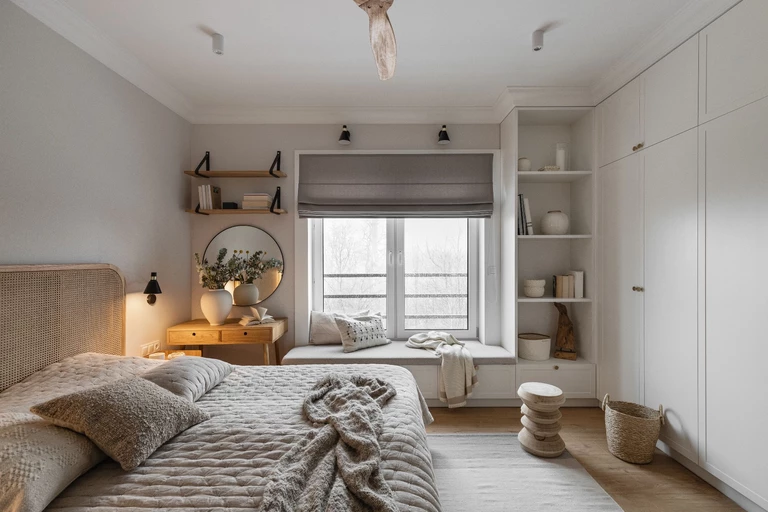 W sypialni królują miękkie, naturalne tkaniny. "Z tego pomieszczenia najlepiej widać pobliski zalew, co jest dodatkowym atutem bez względu na porę roku" – opowiadają projektantki. Rozmiar pomieszczenia pozwolił na umieszczenie biblioteczki oraz toaletki przy łóżku. Na suficie pojawił się wiatrak, który spełnia swoją funkcję w upalne dni.