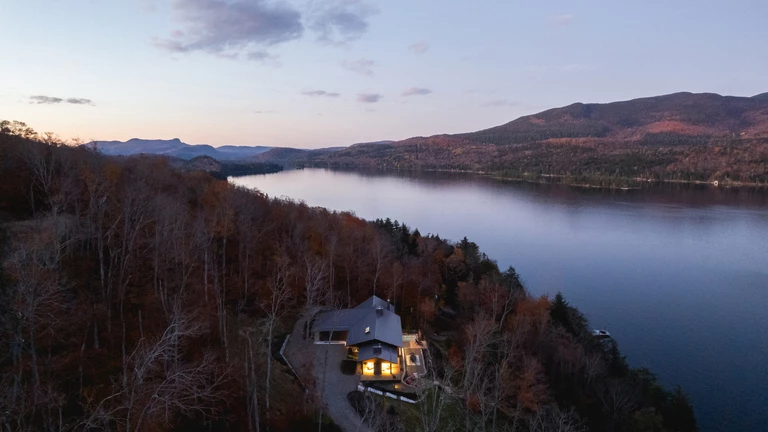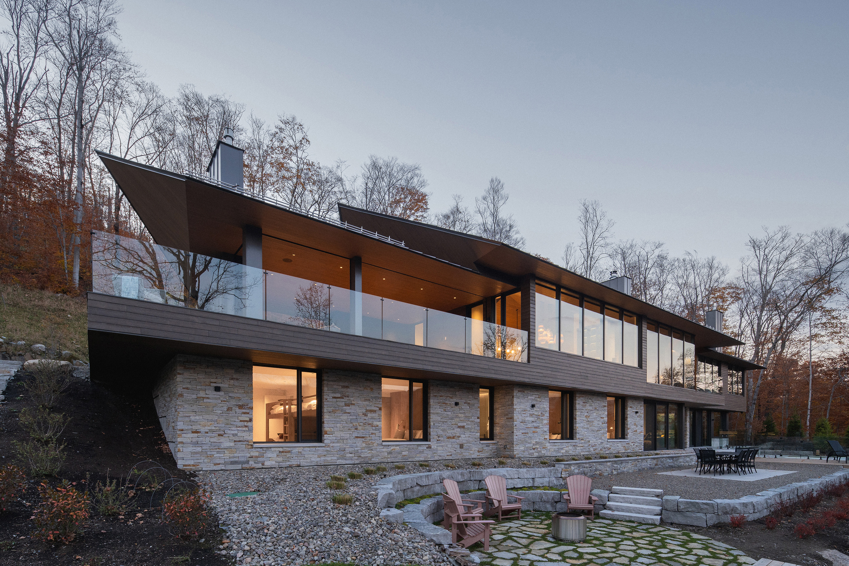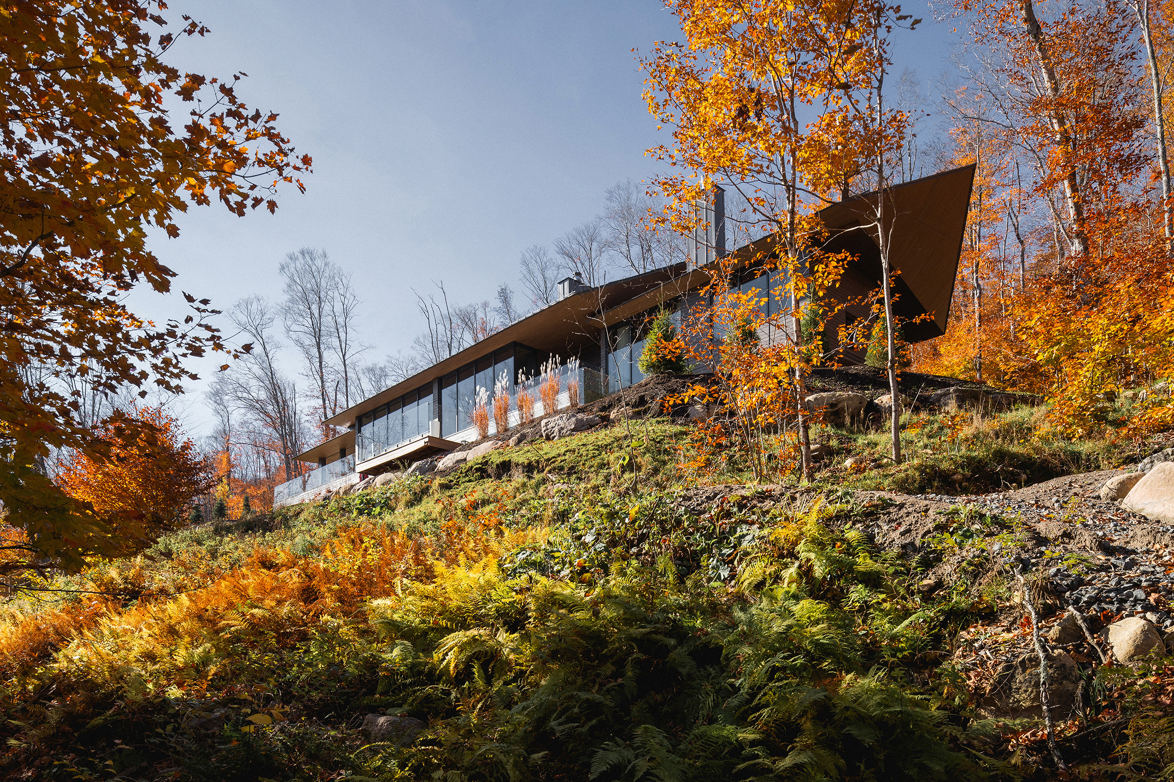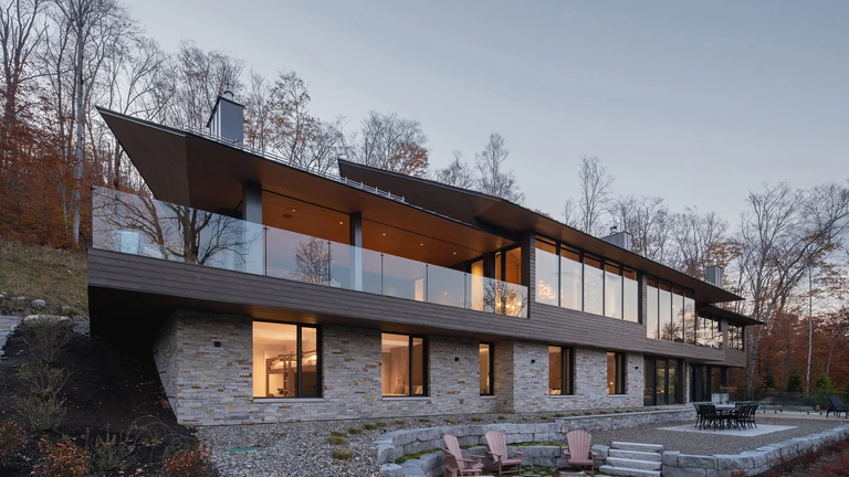 Położona na stromym zboczu nad jeziorem Tremblant, rezydencja wyłania się z leśnego krajobrazu niczym rzeźba. Jej dynamiczna forma, przywodząca na myśl strzałę (fr. la flèche), jest z jednej strony odważnym gestem architektonicznym, z drugiej – hołdem dla otoczenia.