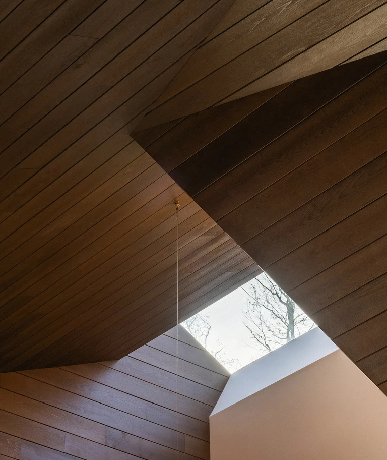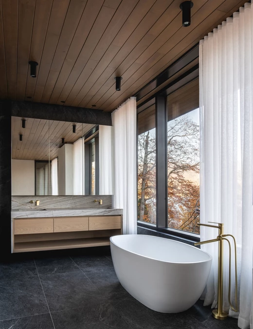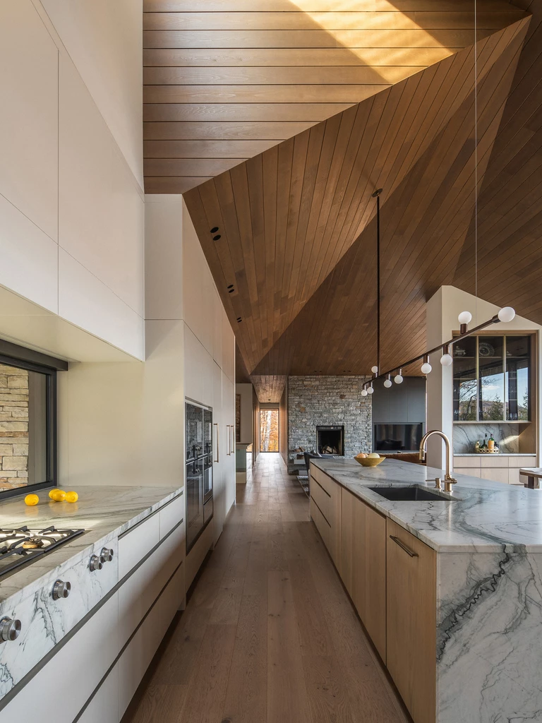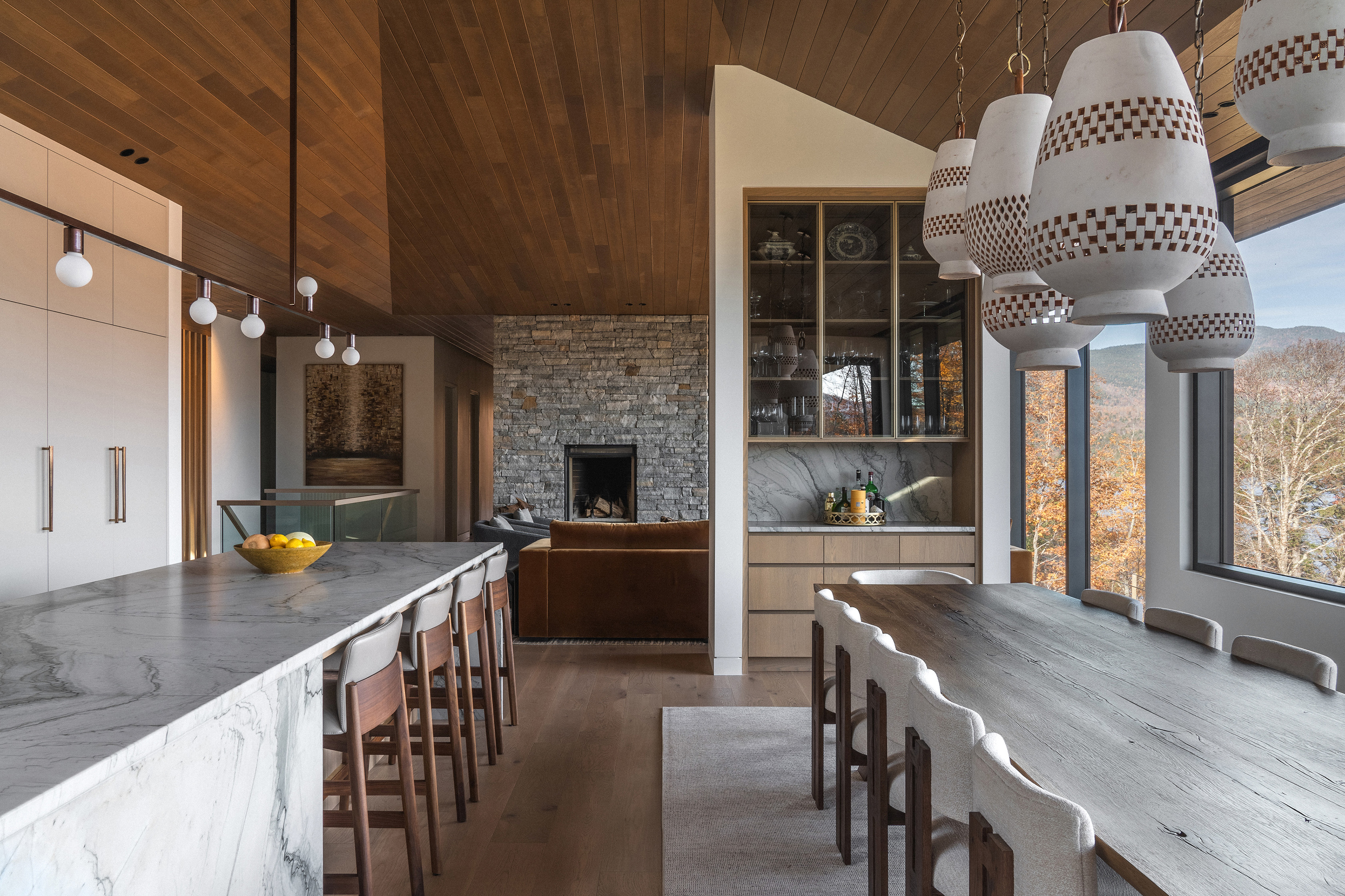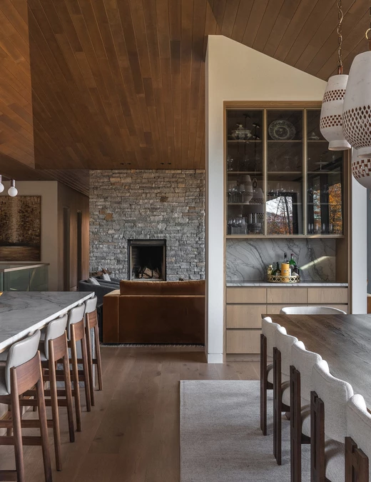 Wnętrze domu to sanktuarium ciepła i spokoju, idealne na długie, jesienne wieczory. W sercu głównej strefy dziennej znajduje się monumentalny, kamienny kominek, a całą przestrzeń otula drewniany sufit o złożonej, triangulacyjnej geometrii. Jego forma moduluje wnętrze – nad salonem jest niższy, bardziej kameralny, by następnie wznieść się nad kuchnią i otworzyć na niebo poprzez dramatyczny świetlik. Ogromne przeszklenia kadrują spektakularne widoki na jezioro i górę Mont Tremblant, wpuszczając do środka jesienny pejzaż.