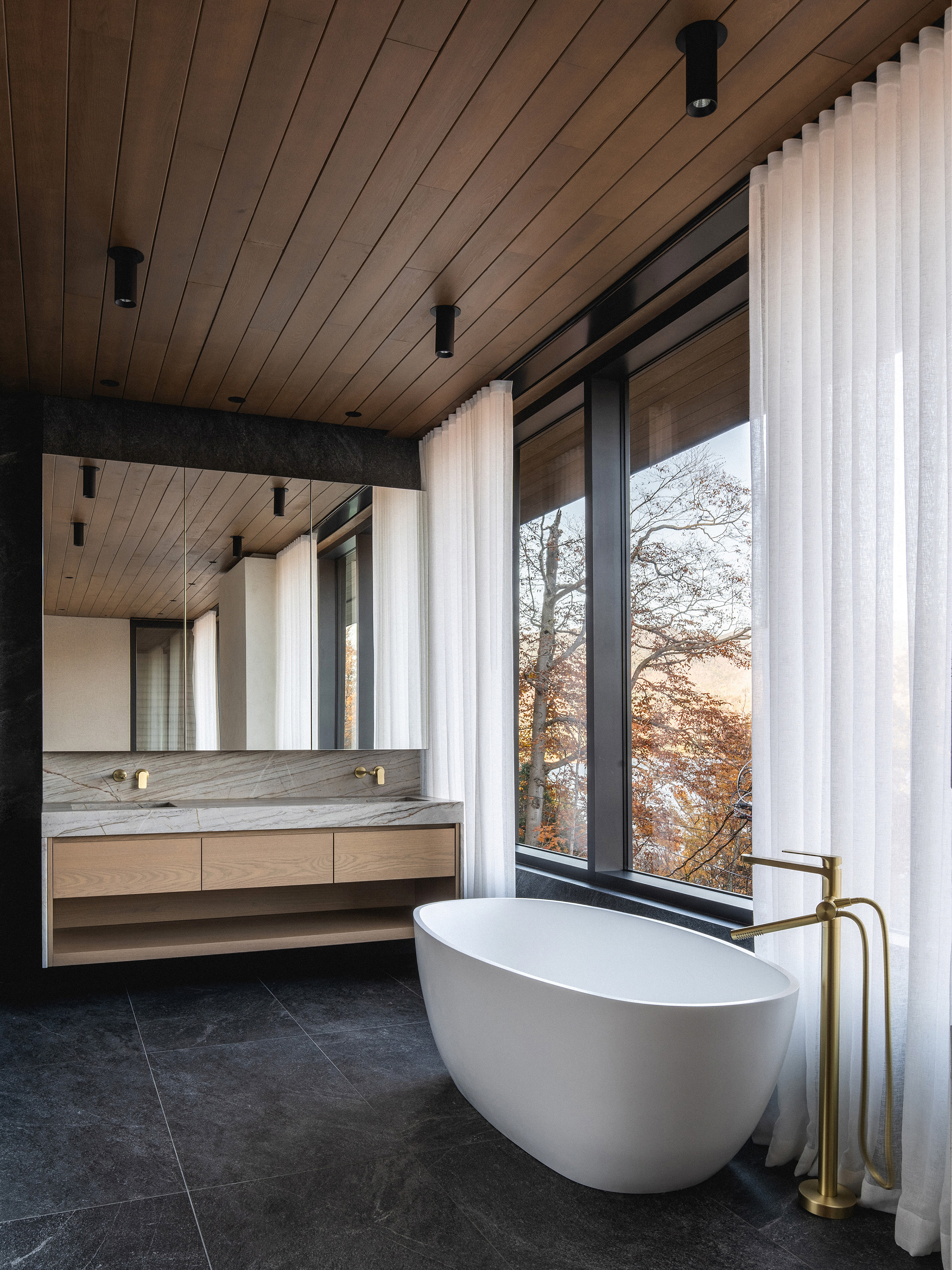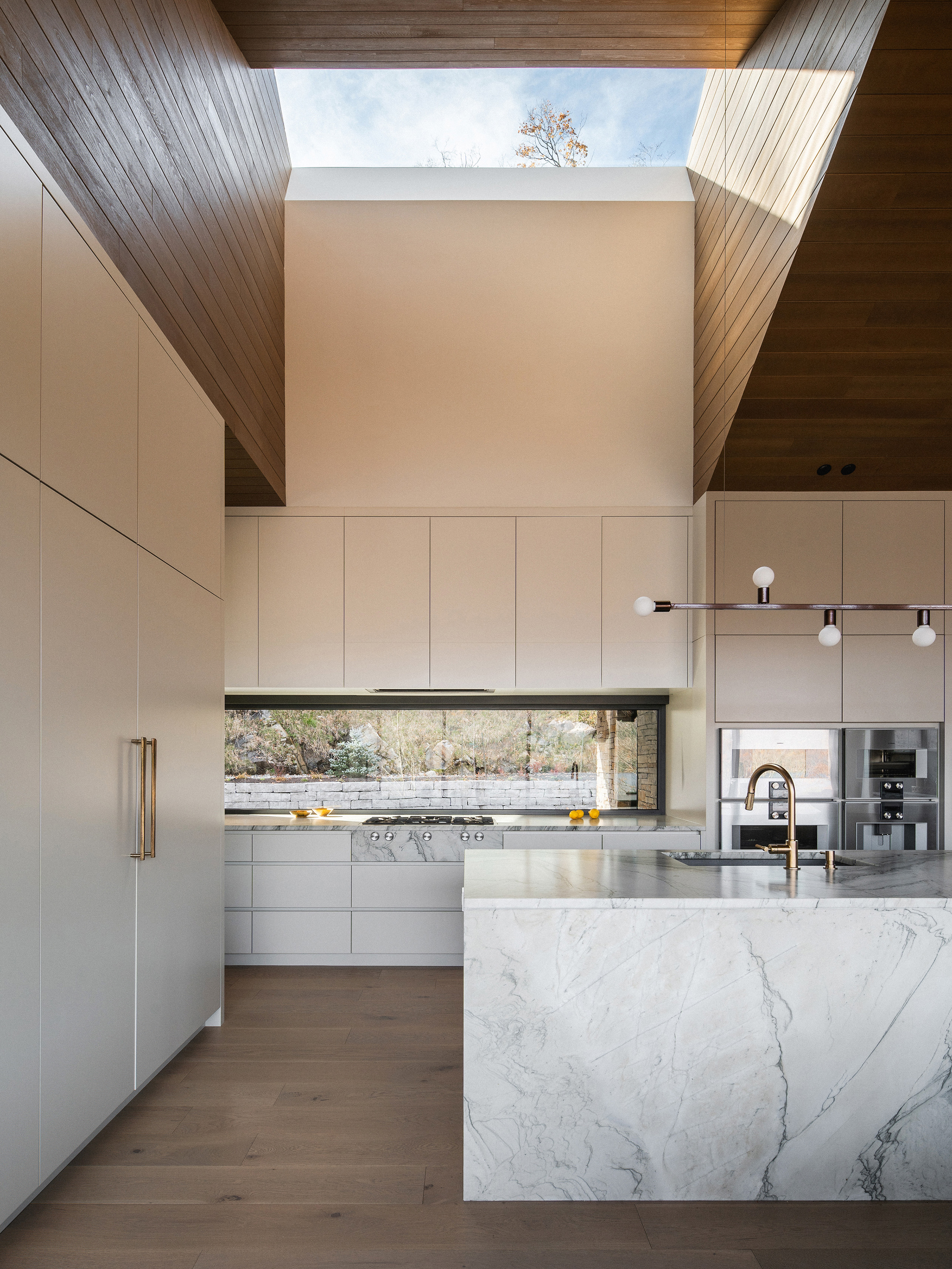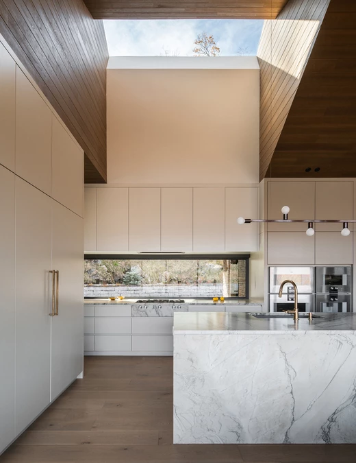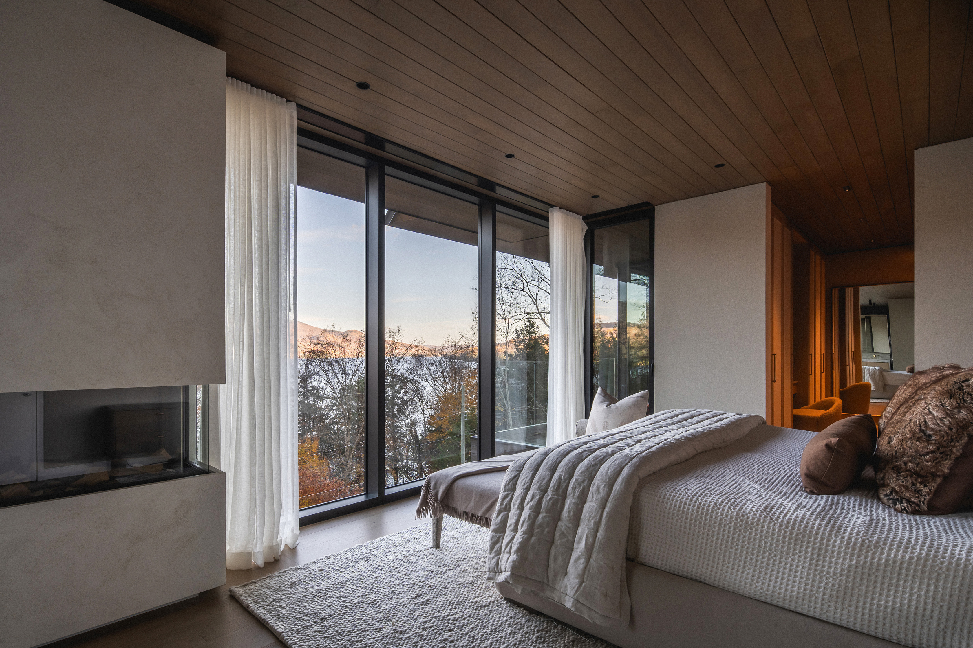 Wnętrze domu to sanktuarium ciepła i spokoju, idealne na długie, jesienne wieczory. W sercu głównej strefy dziennej znajduje się monumentalny, kamienny kominek, a całą przestrzeń otula drewniany sufit o złożonej, triangulacyjnej geometrii. Jego forma moduluje wnętrze – nad salonem jest niższy, bardziej kameralny, by następnie wznieść się nad kuchnią i otworzyć na niebo poprzez dramatyczny świetlik. Ogromne przeszklenia kadrują spektakularne widoki na jezioro i górę Mont Tremblant, wpuszczając do środka jesienny pejzaż.