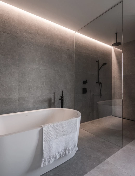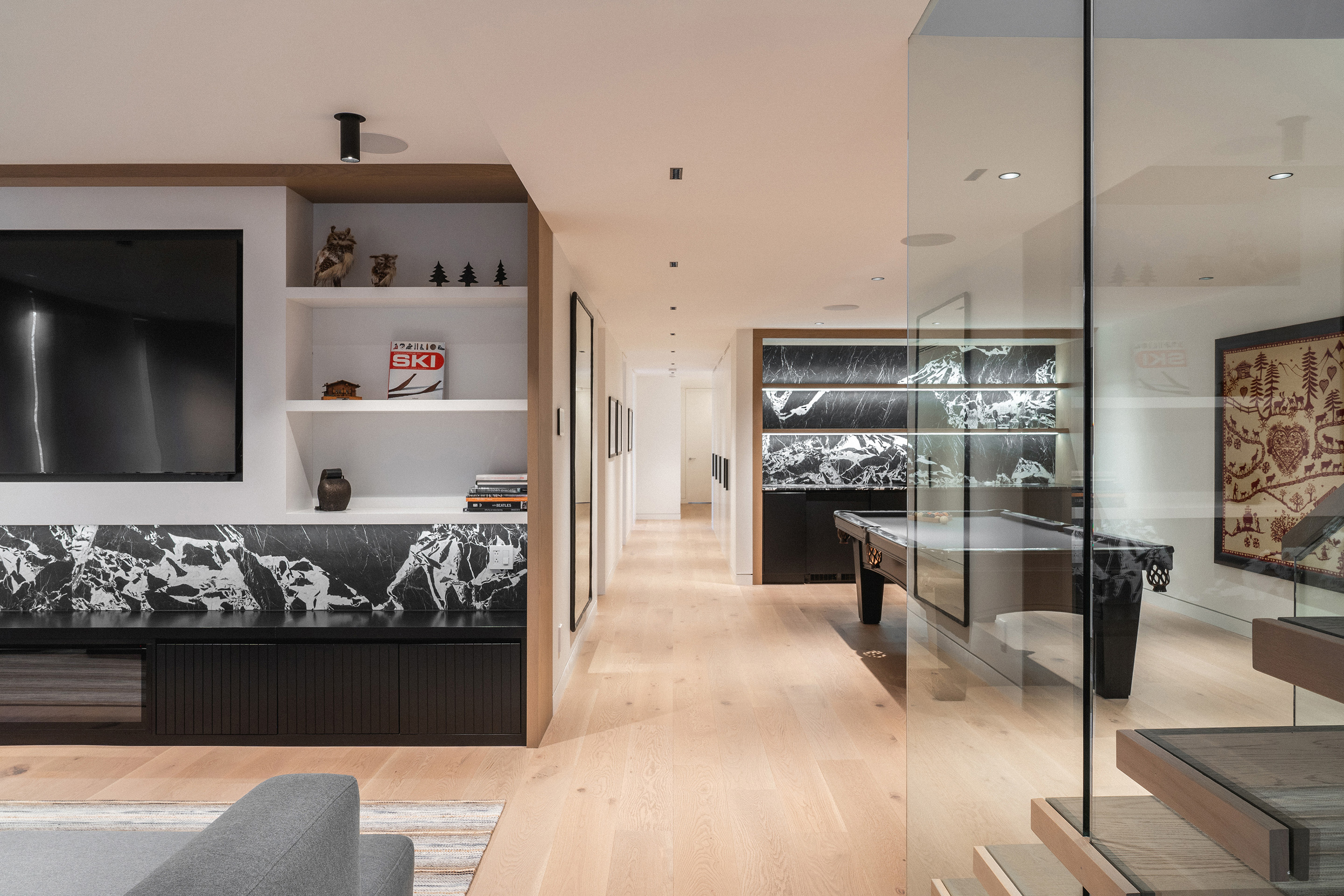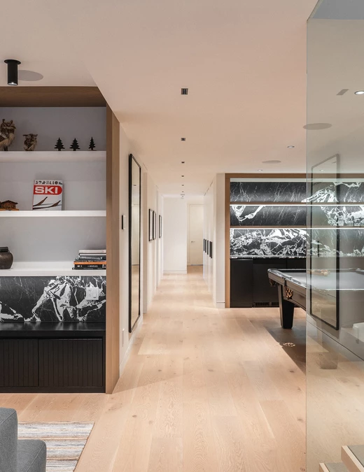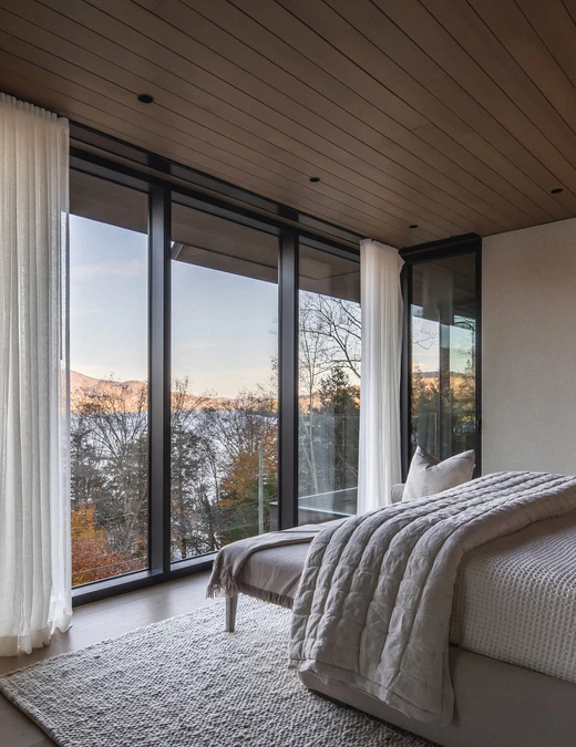 Nawet w najbardziej prywatnych strefach domu natura pozostaje głównym bohaterem. Główna sypialnia, z własnym kominkiem, oferuje rozległe widoki na jezioro. W otwartej na sypialnię łazience prysznic o kamiennej fakturze przypomina grotę, a lustro zostało umieszczone tak, by odbijać krajobraz, który można podziwiać również z wolnostojącej wanny. Na niższym, ogrodowym poziomie znajduje się strefa towarzyska z pokojem gier i barem oraz strefa wellness z sauną i siłownią otwartą na zewnątrz.