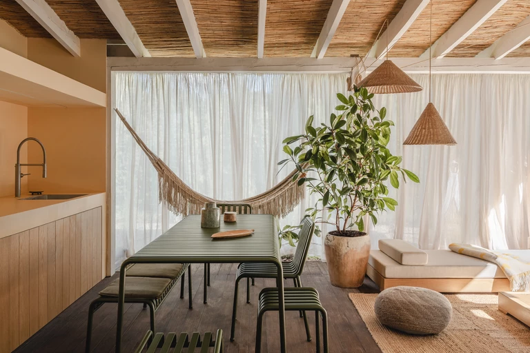 Dom ma dwa piętra i 155 m2 powierzchni. Przylega do niego rozległe patio, w którym architekci zaprojektowali letni salon z kuchnią. Oprócz zabudowy kuchennej, stołu jadalnianego z malowanej stali są też niskie leżanki. Klimat Maroka wprowadzają zadaszenie wykończone bambusem, jutowy dywan, gliniane donice czy rattanowe lampy.