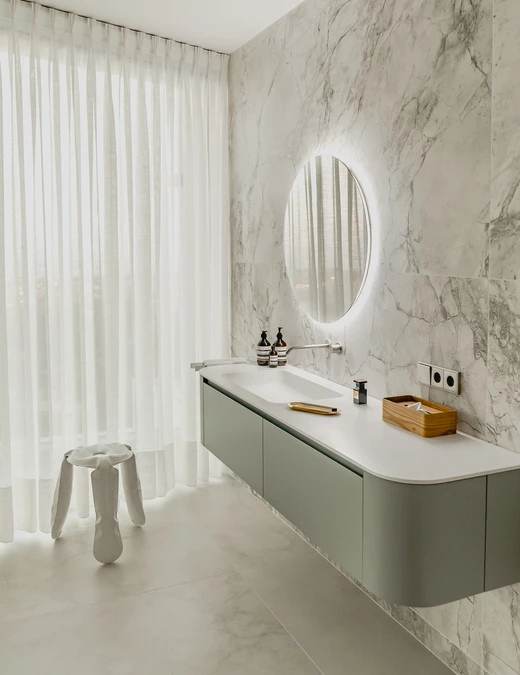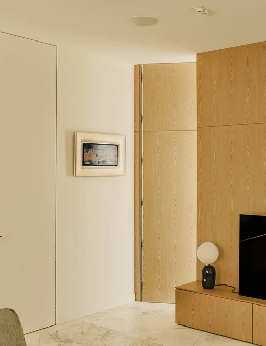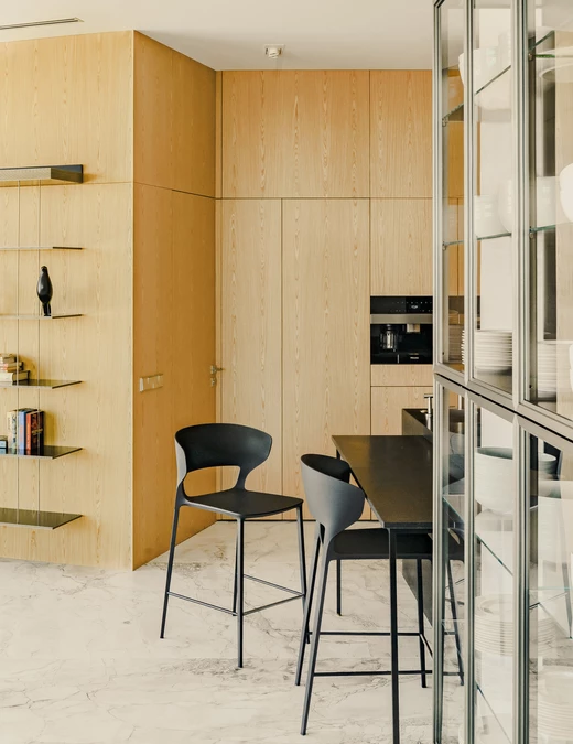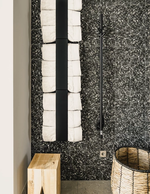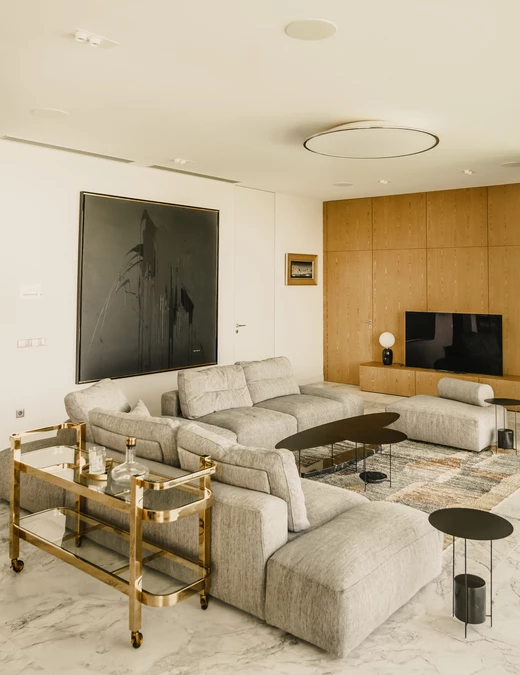 Podłogi i ściany łazienek zostały wykończone spiekami imitującymi kamień naturalny. W celu dodania wnętrzu ciepła, szczególnie w przestrzeni wspólnej, którą stanowi salon, zastosowano fornir dębowy. Odcienie szarości, beżu, delikatnego błękitu i naturalnego dębu kontrastują z mocnymi akcentami antracytowymi.