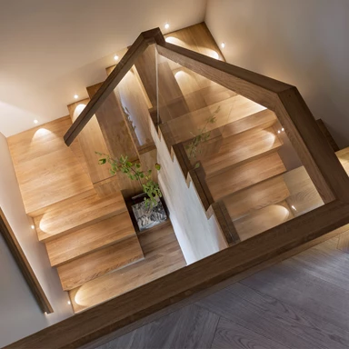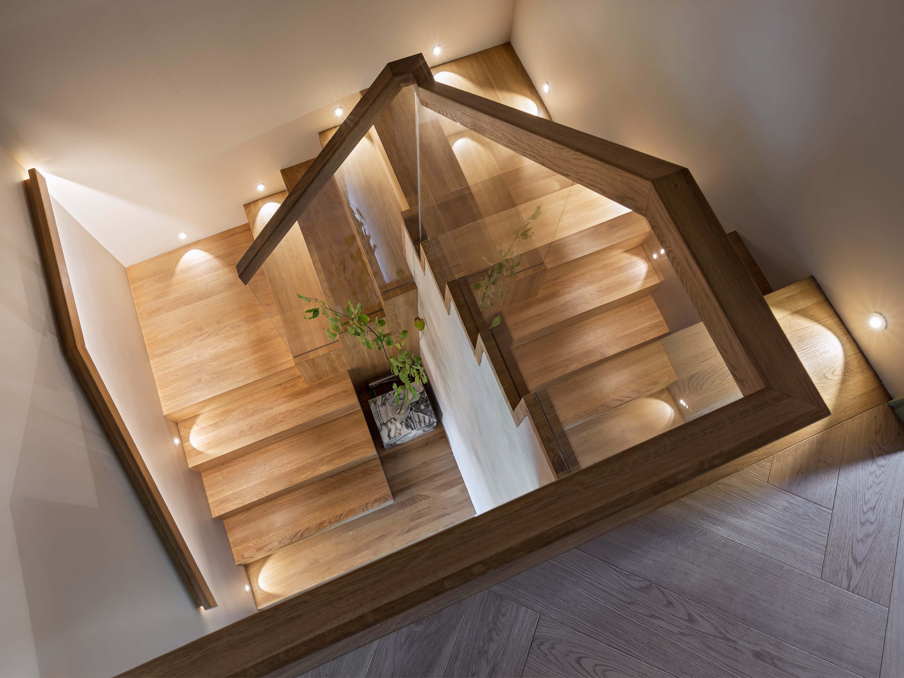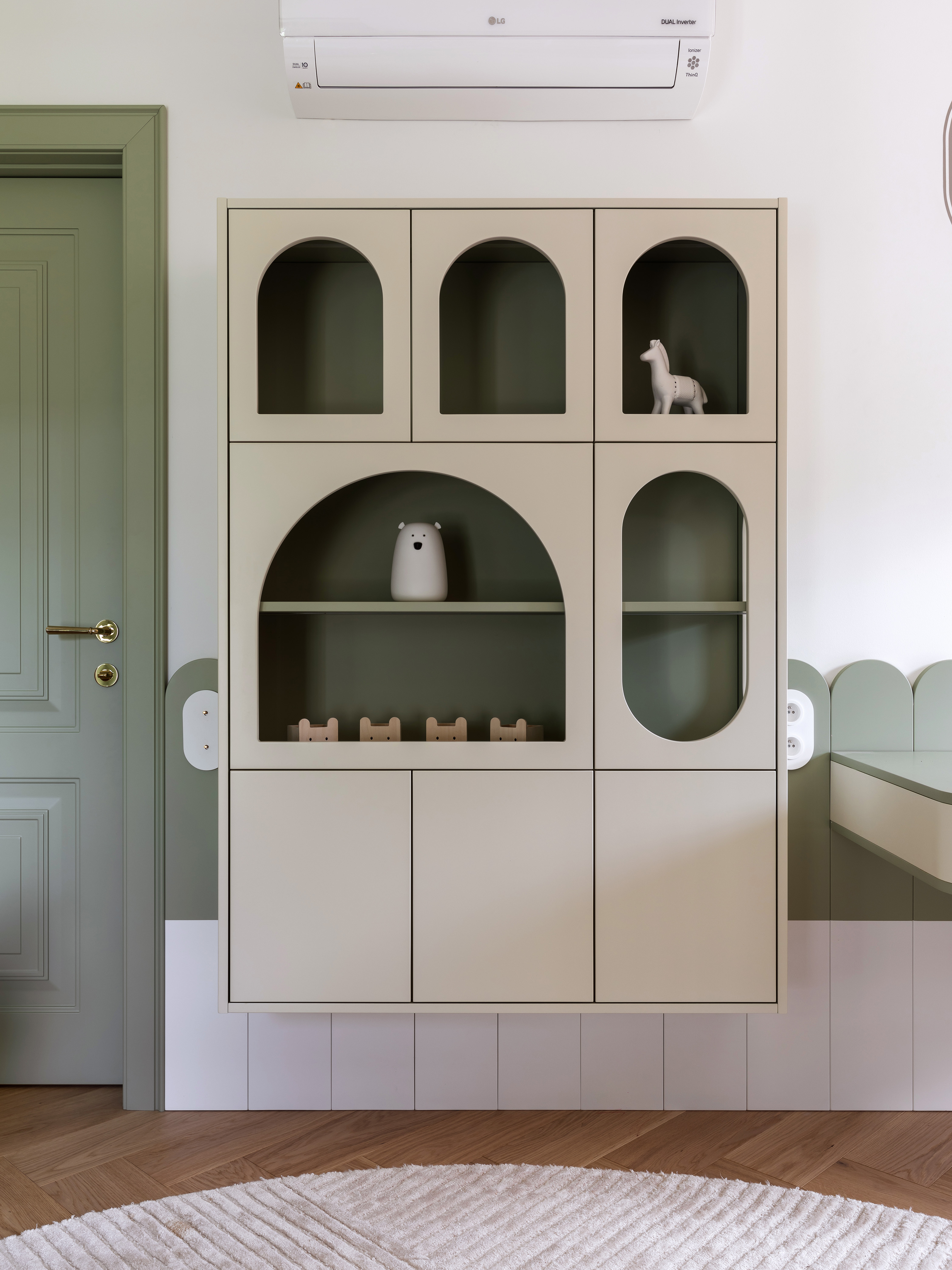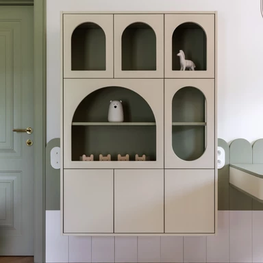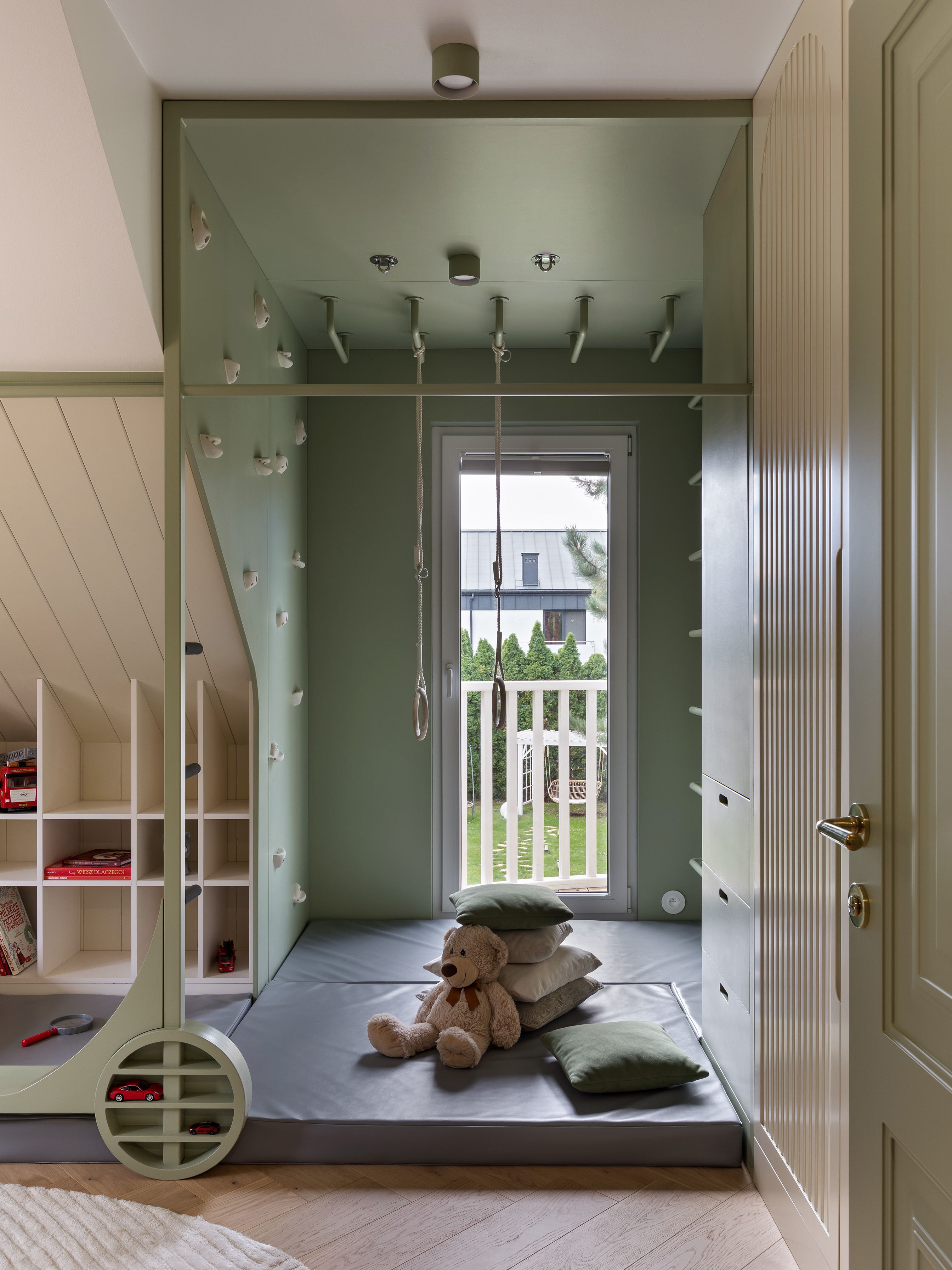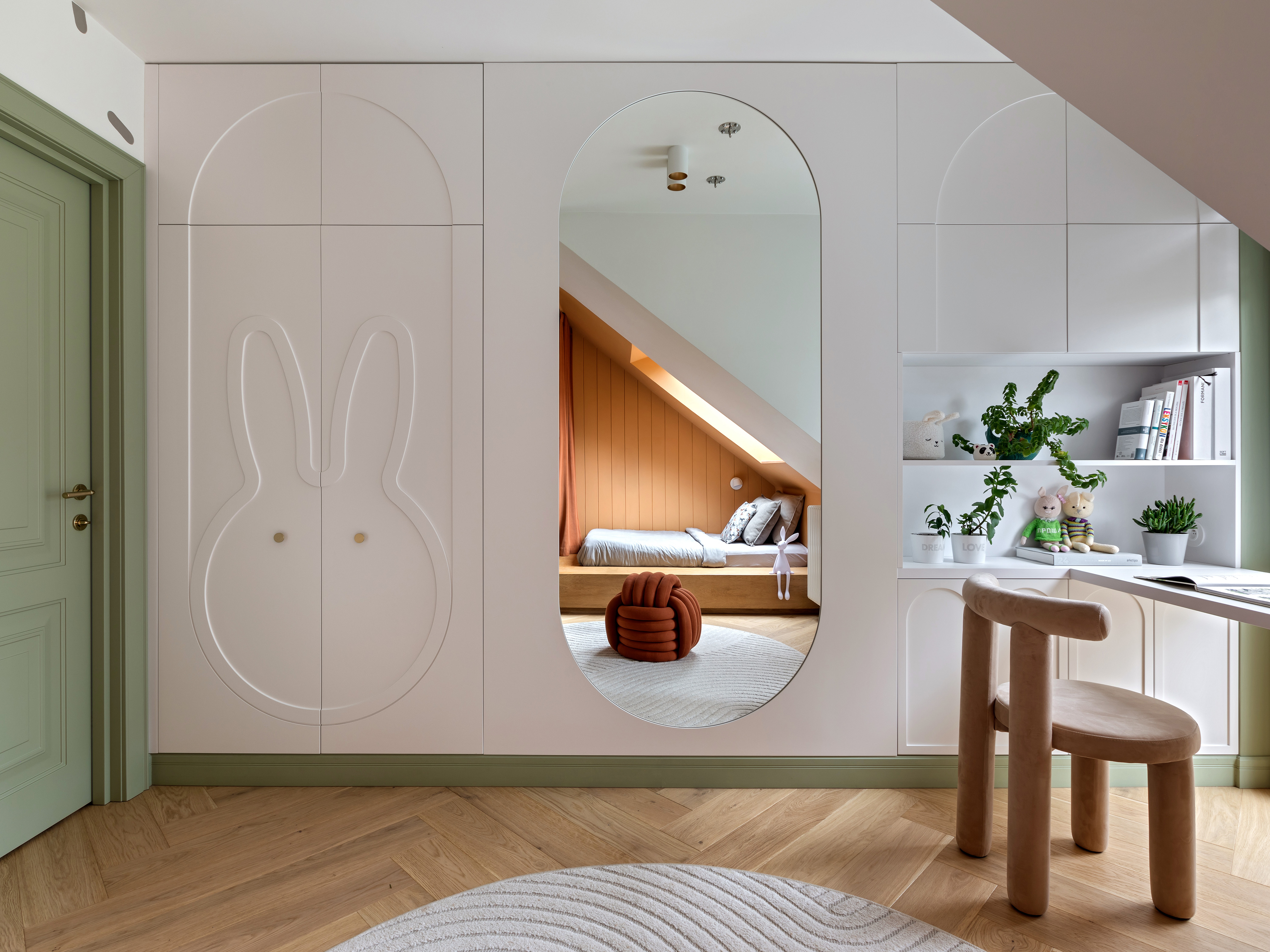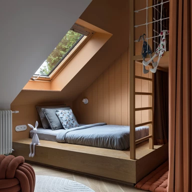 Piętro domu, ulokowane na poddaszu, skrywa rozwiązania skrojone pod potrzeby najmłodszych mieszkańców. W zabudowie szafy ukryto tajne przejście łączące pokoje dzieci, co wprowadza do wnętrza element zabawy i przygody. Pokój dziewczynki to kraina królików z dwupoziomowym domkiem ukrytym w głębi łóżka, natomiast sypialnia chłopca została wyposażona w konstrukcję inspirowaną hulajnogą, która łączy miejsce do spania z drabinką gimnastyczną.