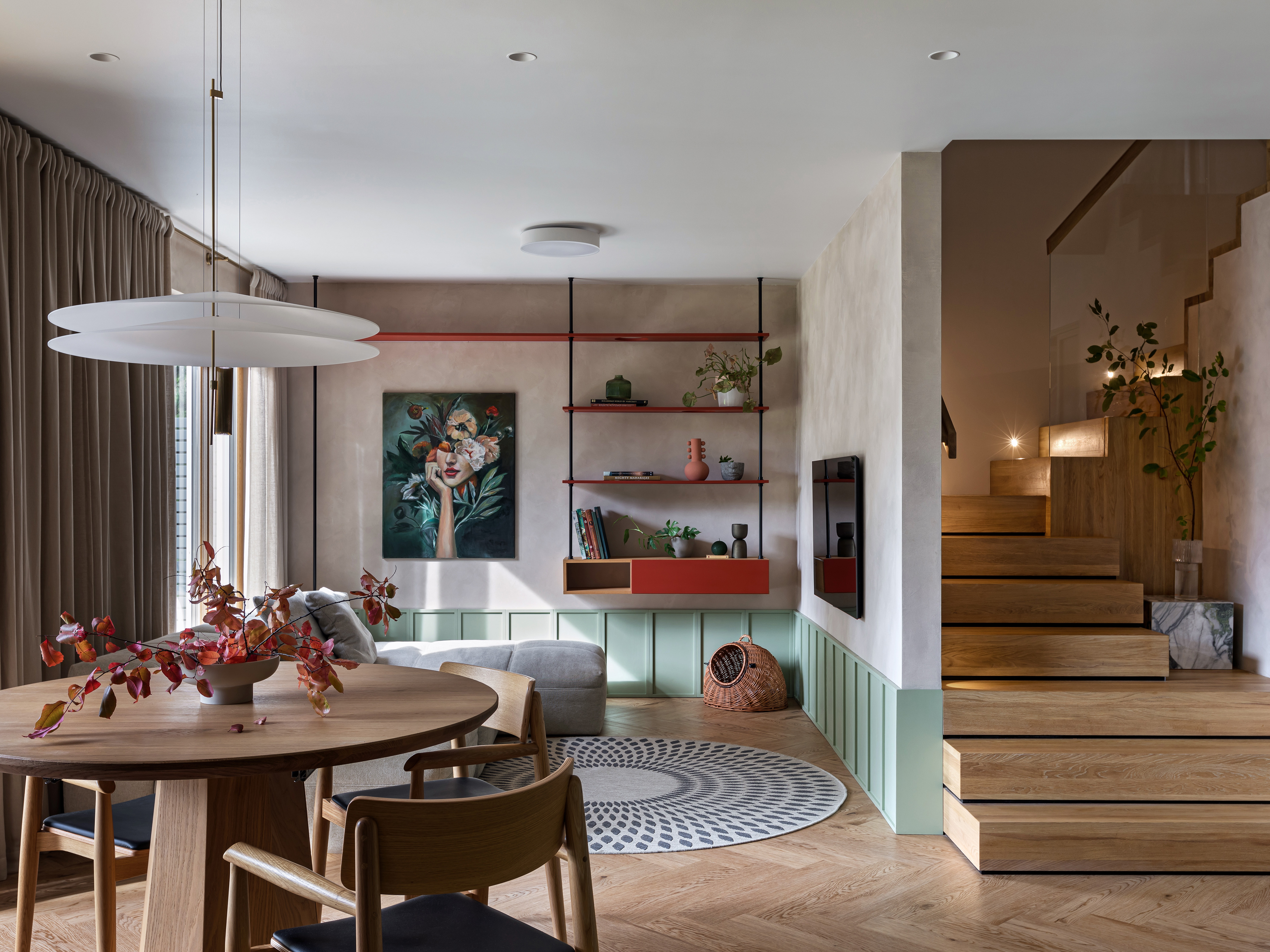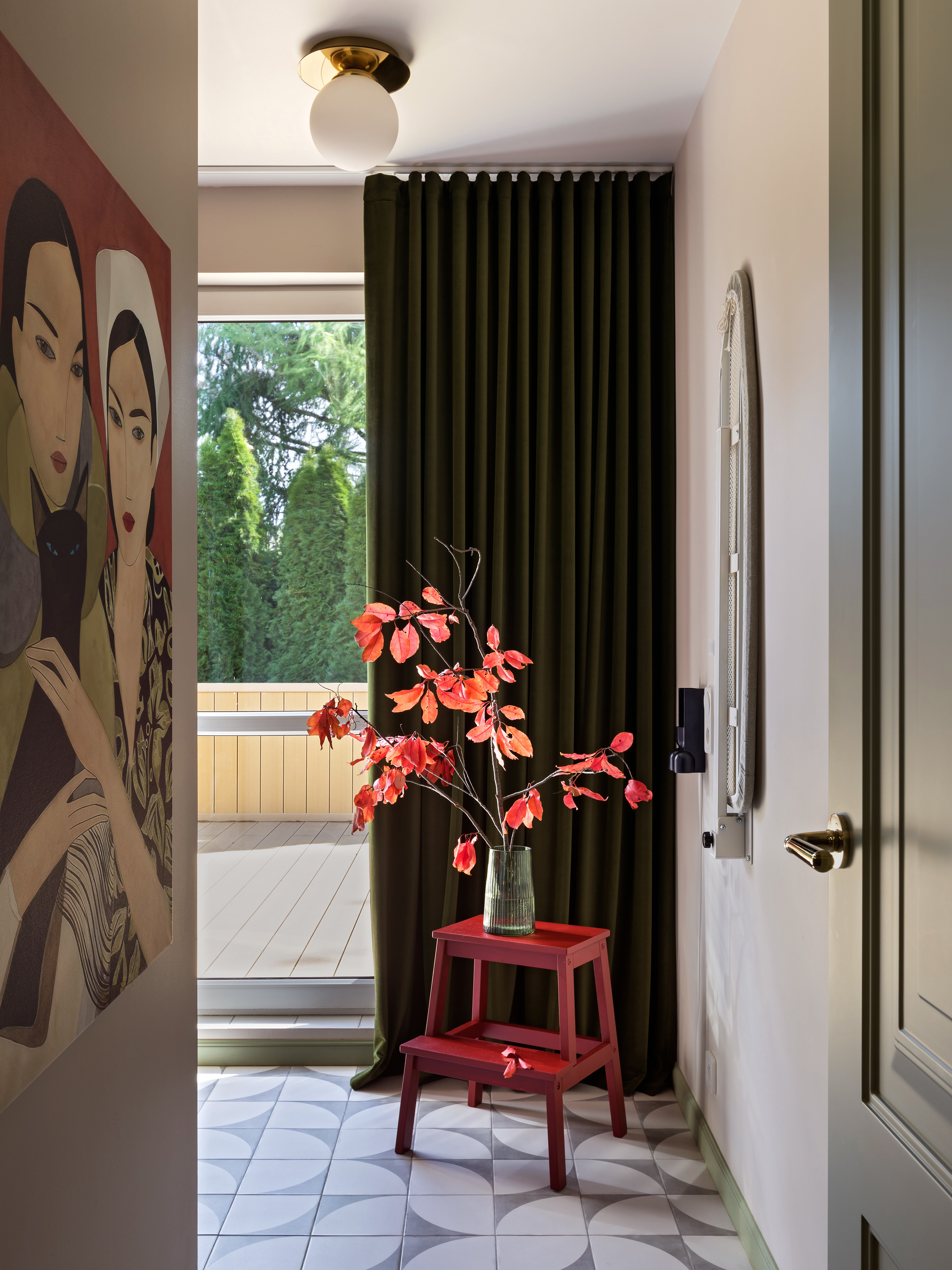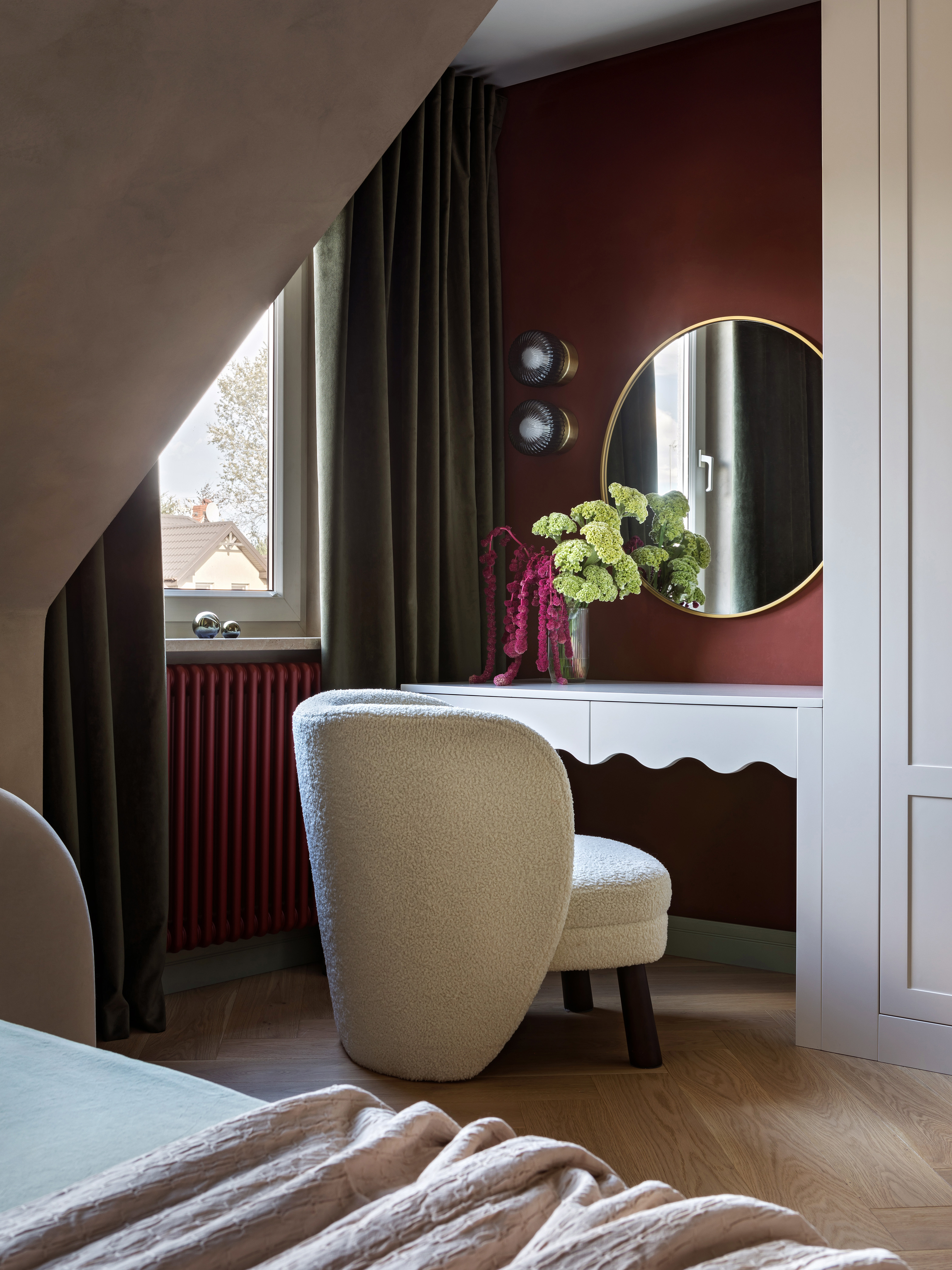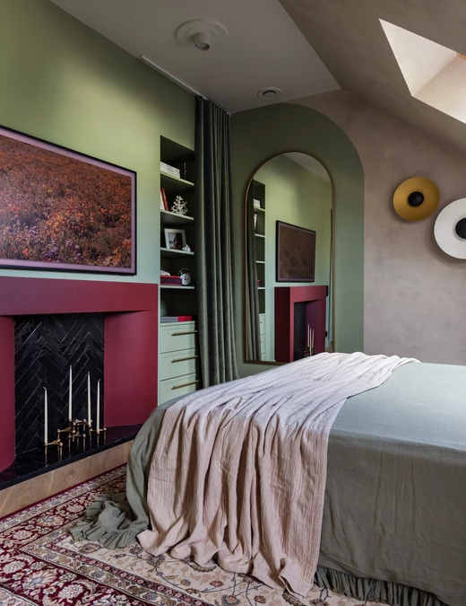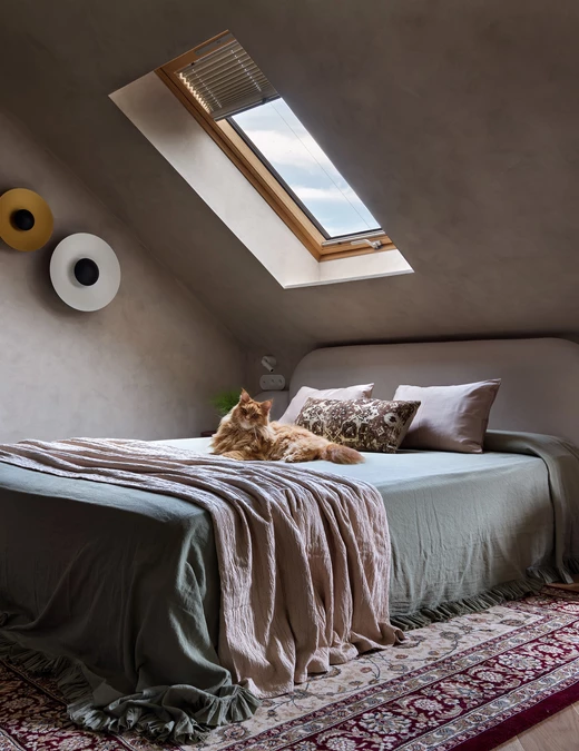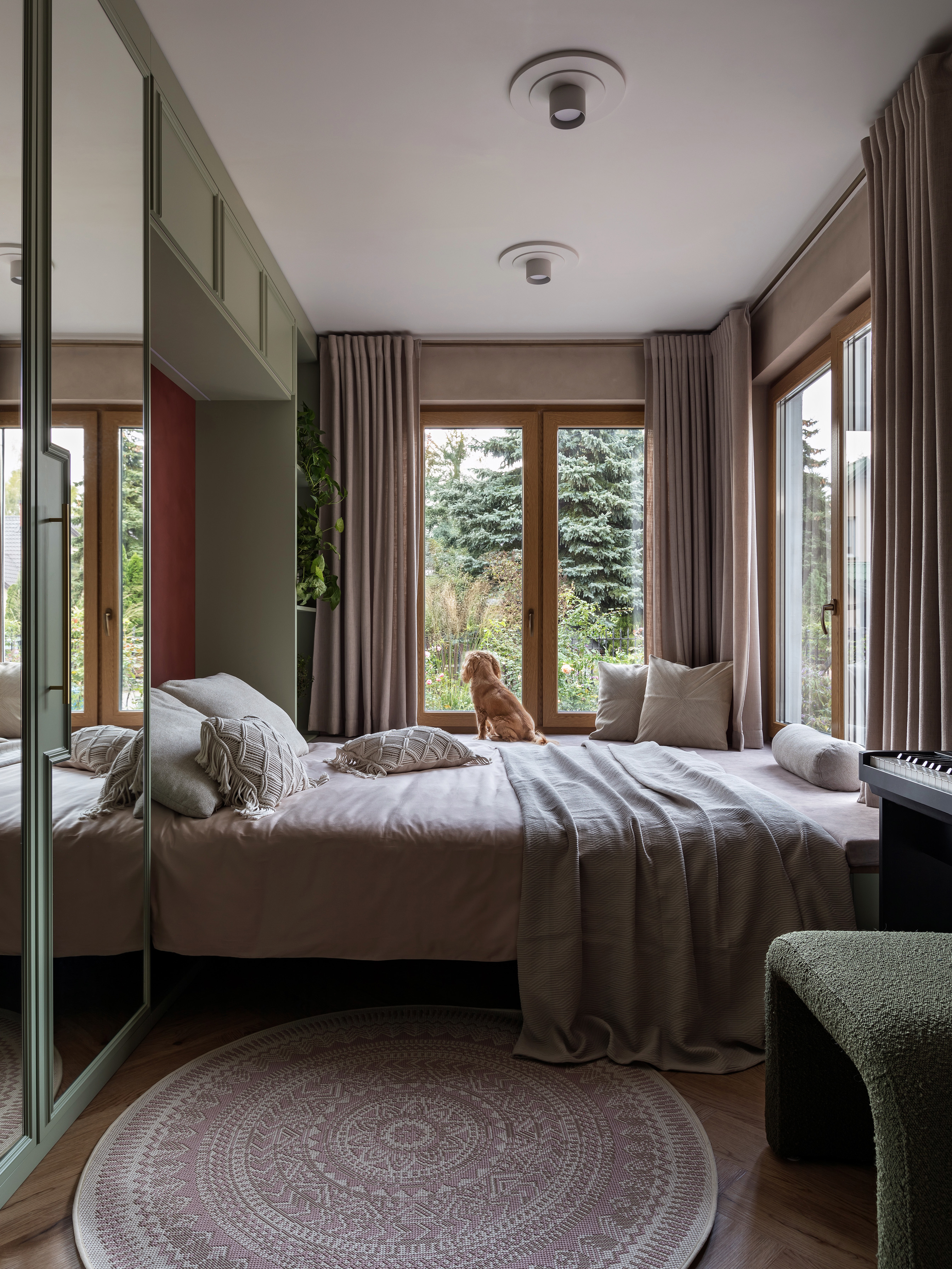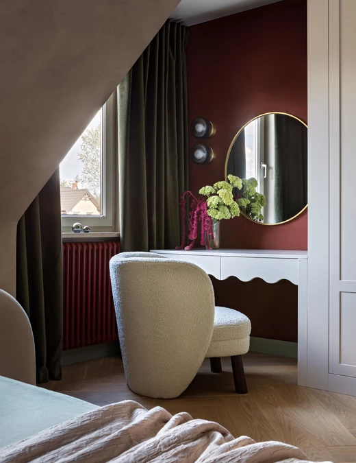 Sypialnia rodziców pozostaje przestrzenią wyciszenia, wzbogaconą o kominek na świece oraz ciepłe tekstury naturalnego rattanu. Nawet pomieszczenia techniczne, takie jak pralnia, zyskały przemyślaną oprawę, nie zdradzając swojej funkcji i przepuszczając światło na klatkę schodową. Łazienkę zdominowały ciemnozielone płytki, które stanowią tło dla czerwonej umywalki i grzejnika, domykając barwną opowieść o codzienności bliskiej naturze.