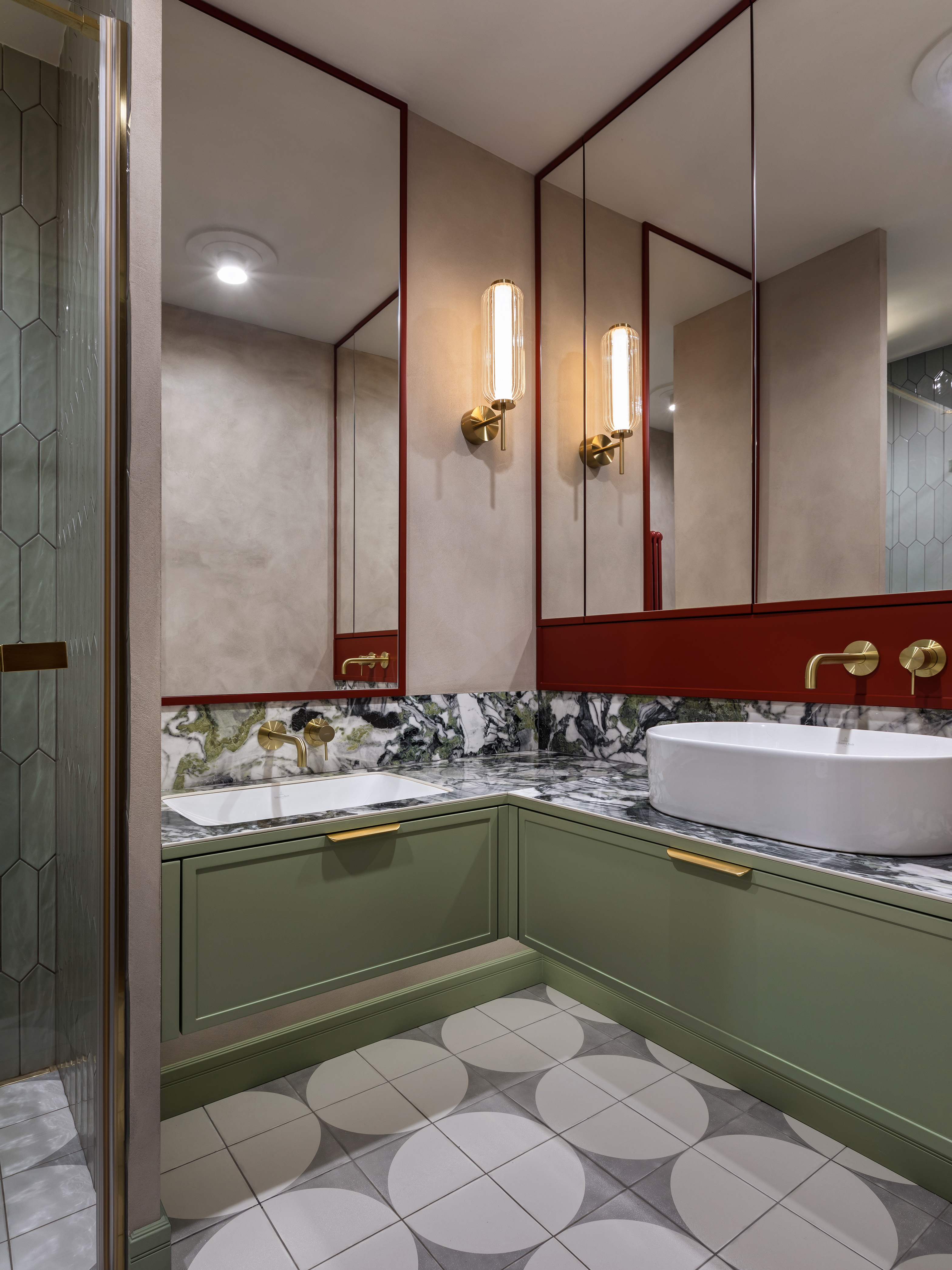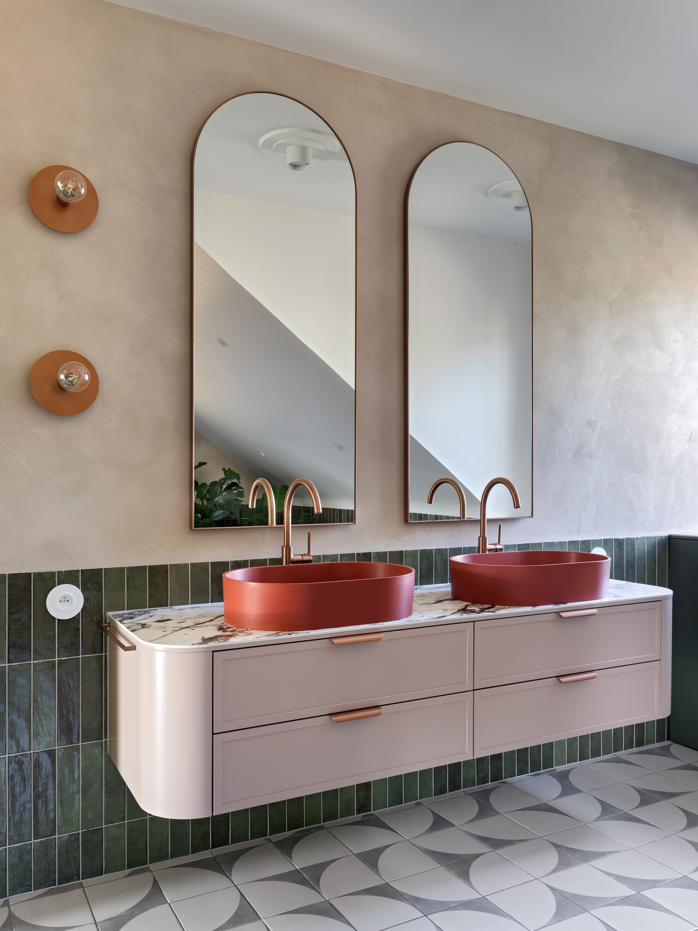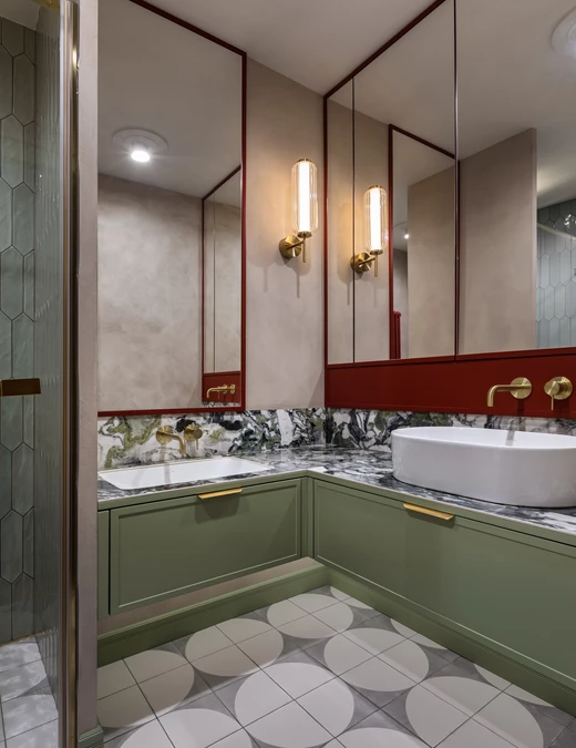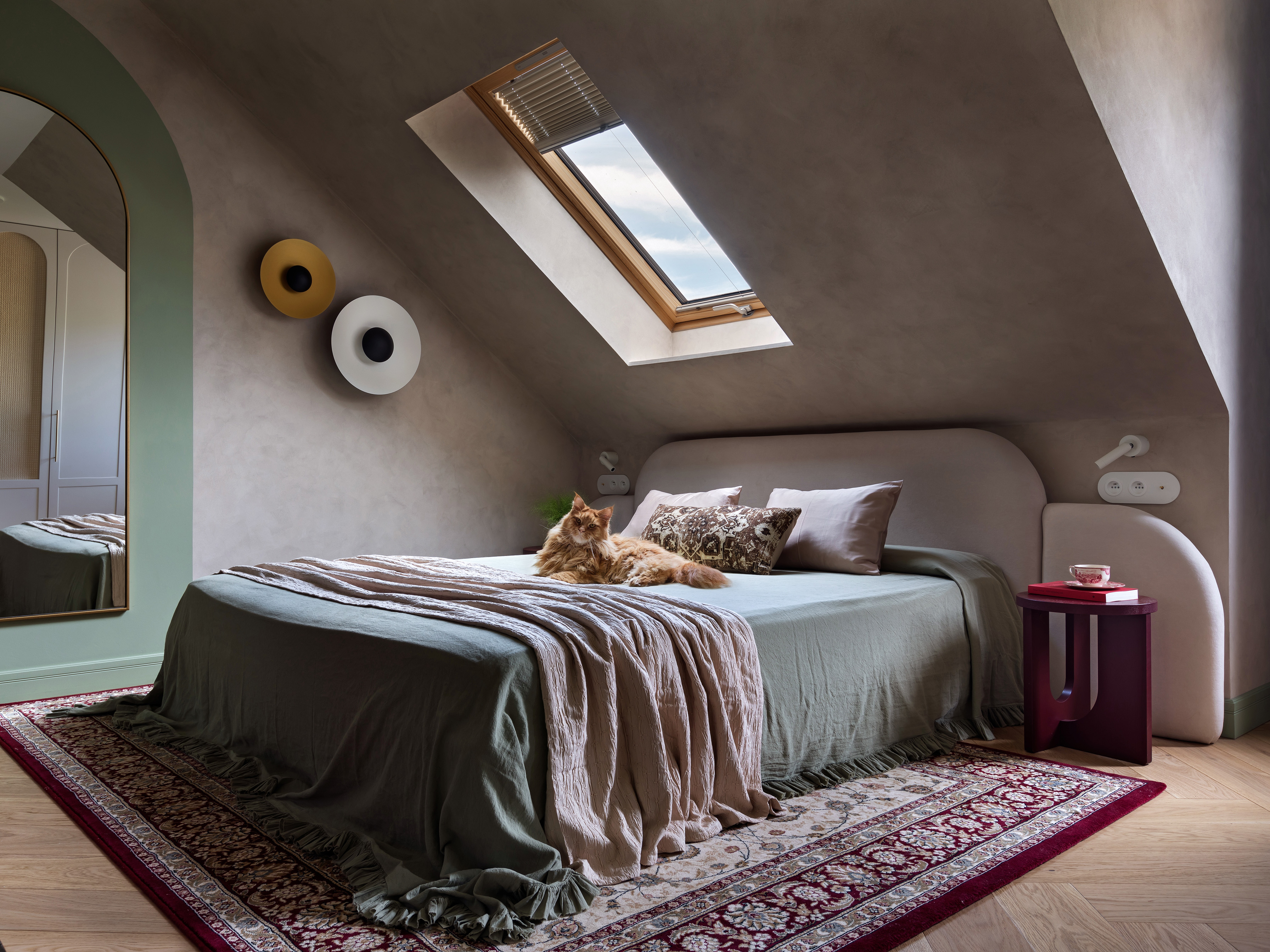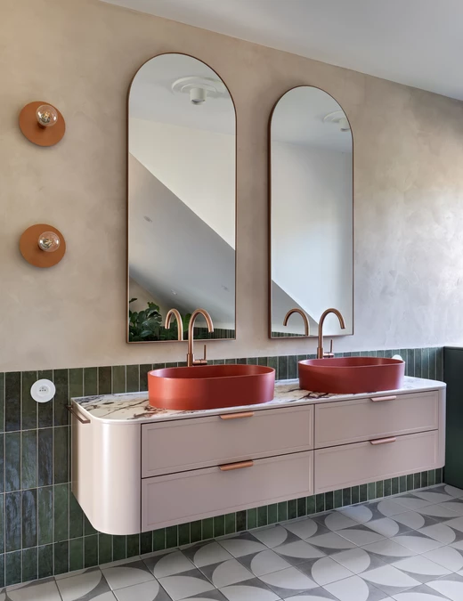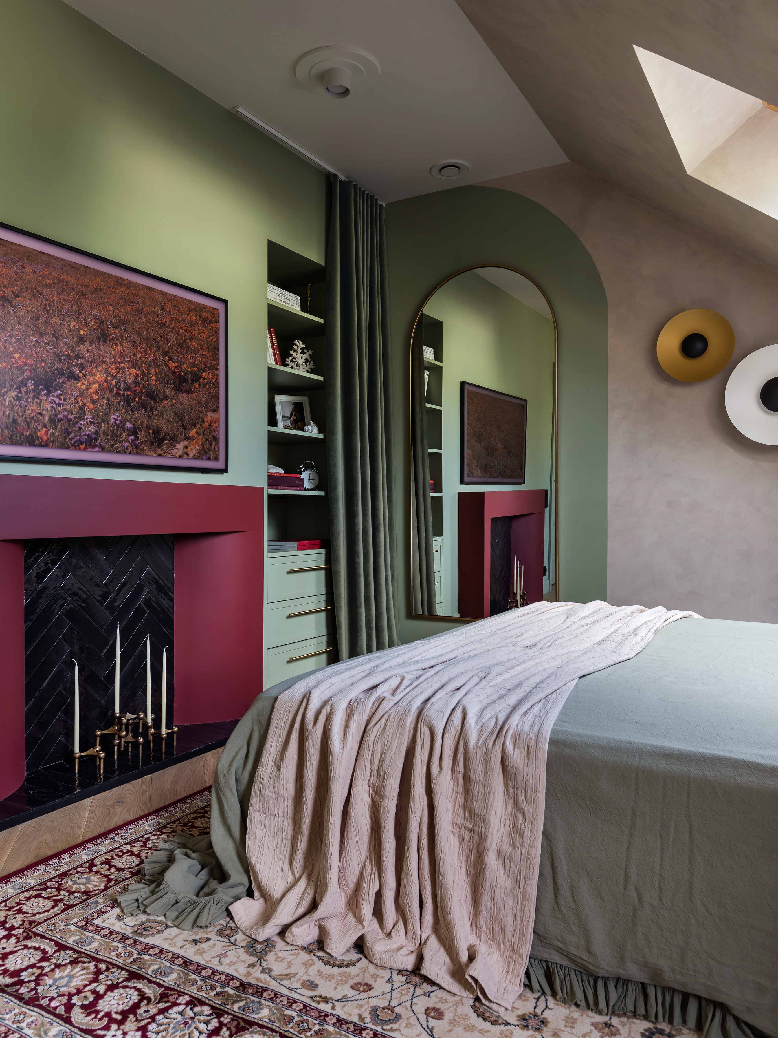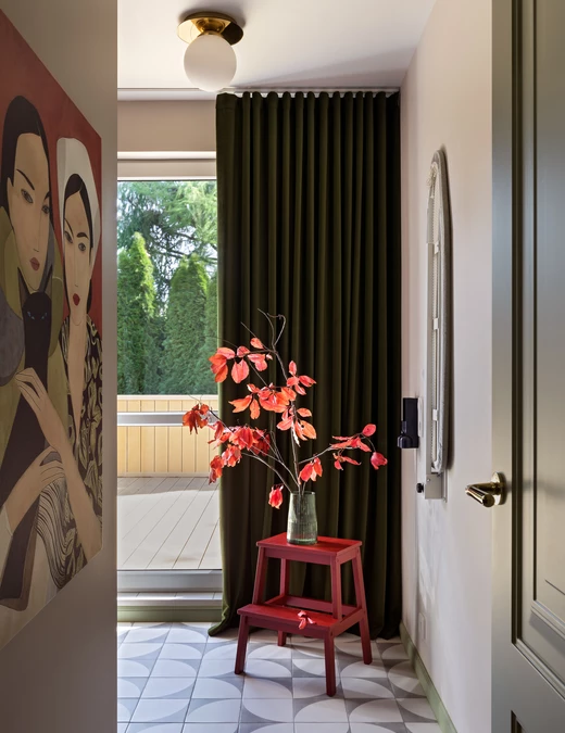Sypialnia rodziców pozostaje przestrzenią wyciszenia, wzbogaconą o kominek na świece oraz ciepłe tekstury naturalnego rattanu. Nawet pomieszczenia techniczne, takie jak pralnia, zyskały przemyślaną oprawę, nie zdradzając swojej funkcji i przepuszczając światło na klatkę schodową. Łazienkę zdominowały ciemnozielone płytki, które stanowią tło dla czerwonej umywalki i grzejnika, domykając barwną opowieść o codzienności bliskiej naturze.