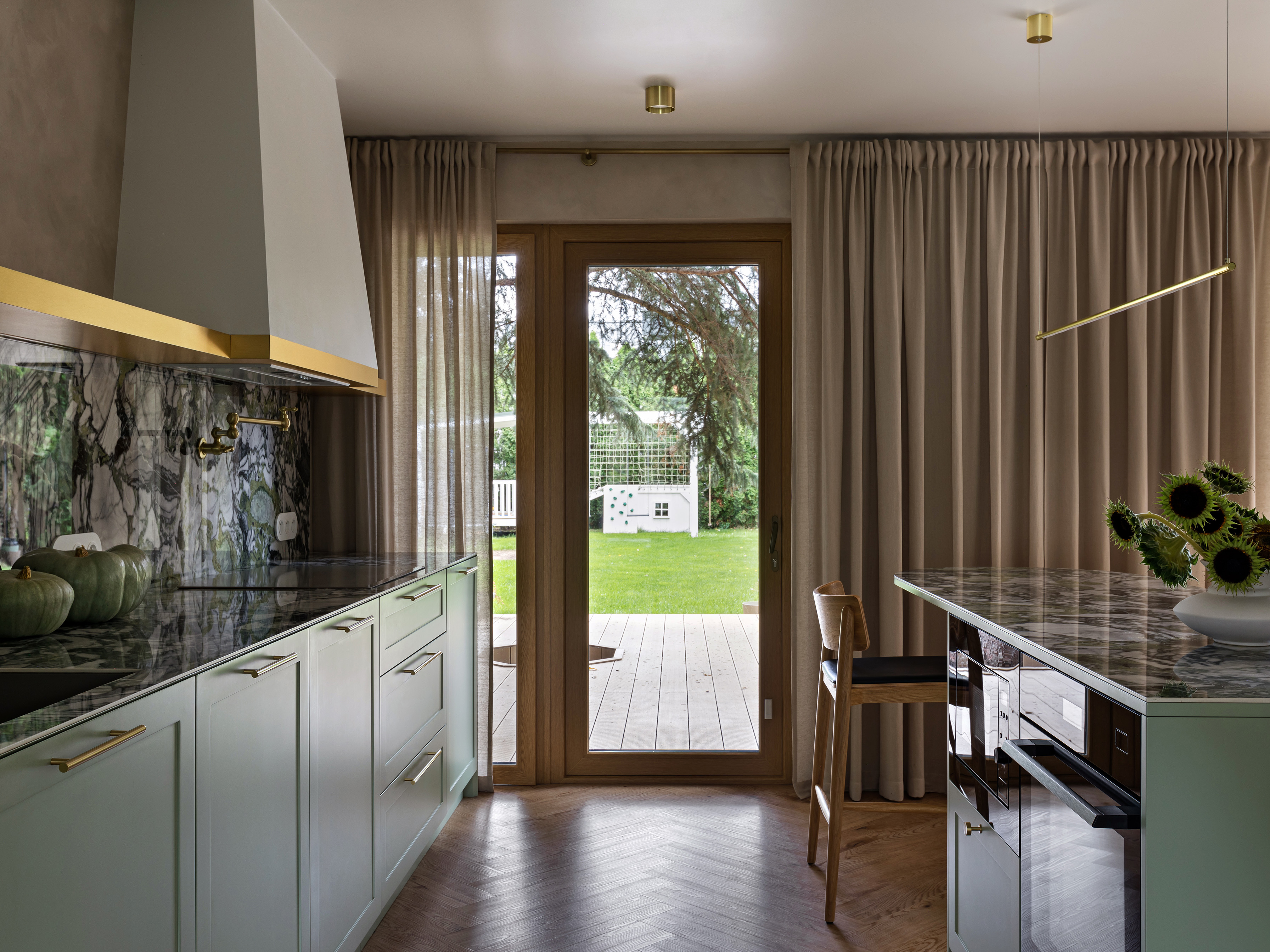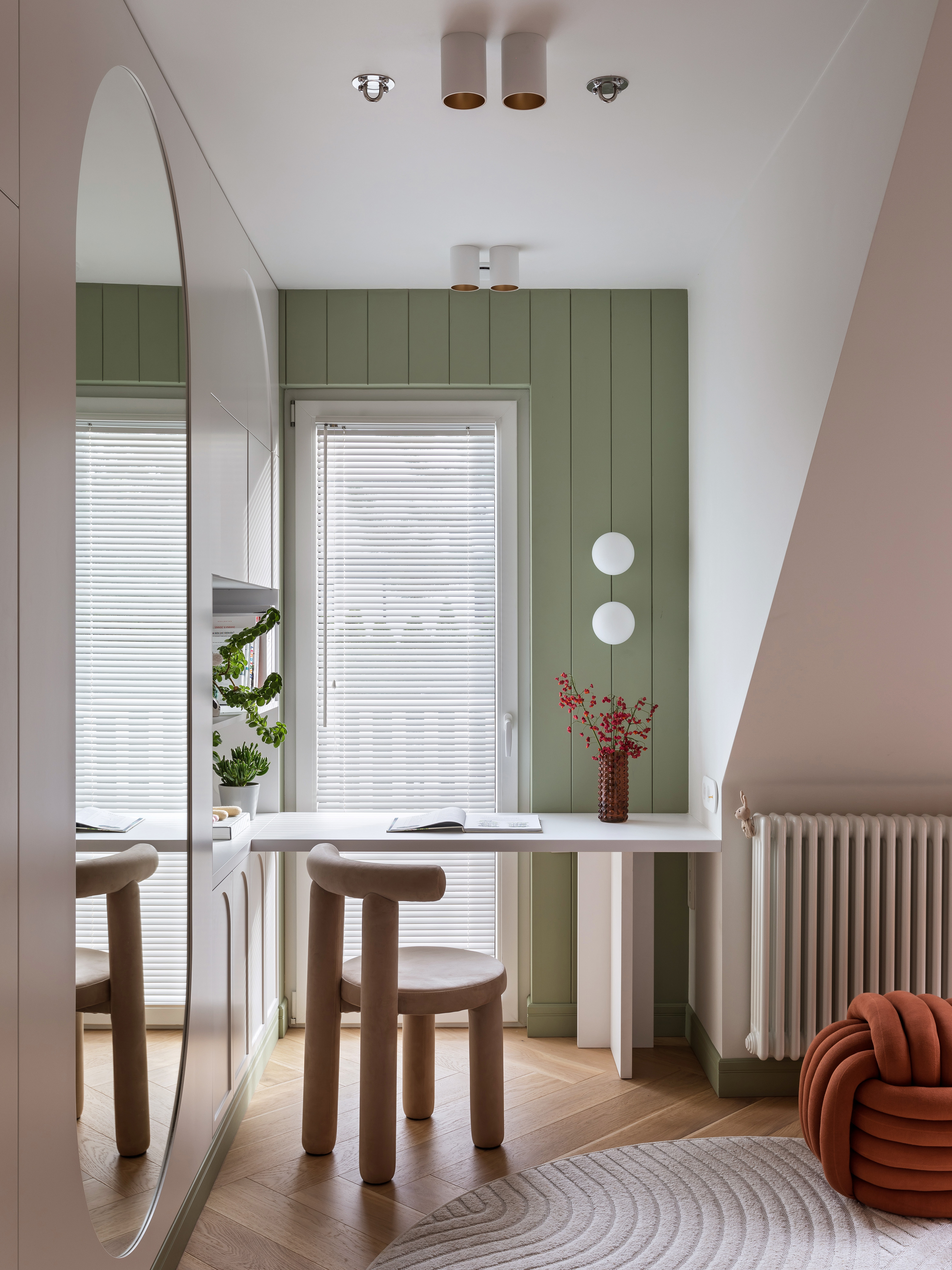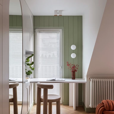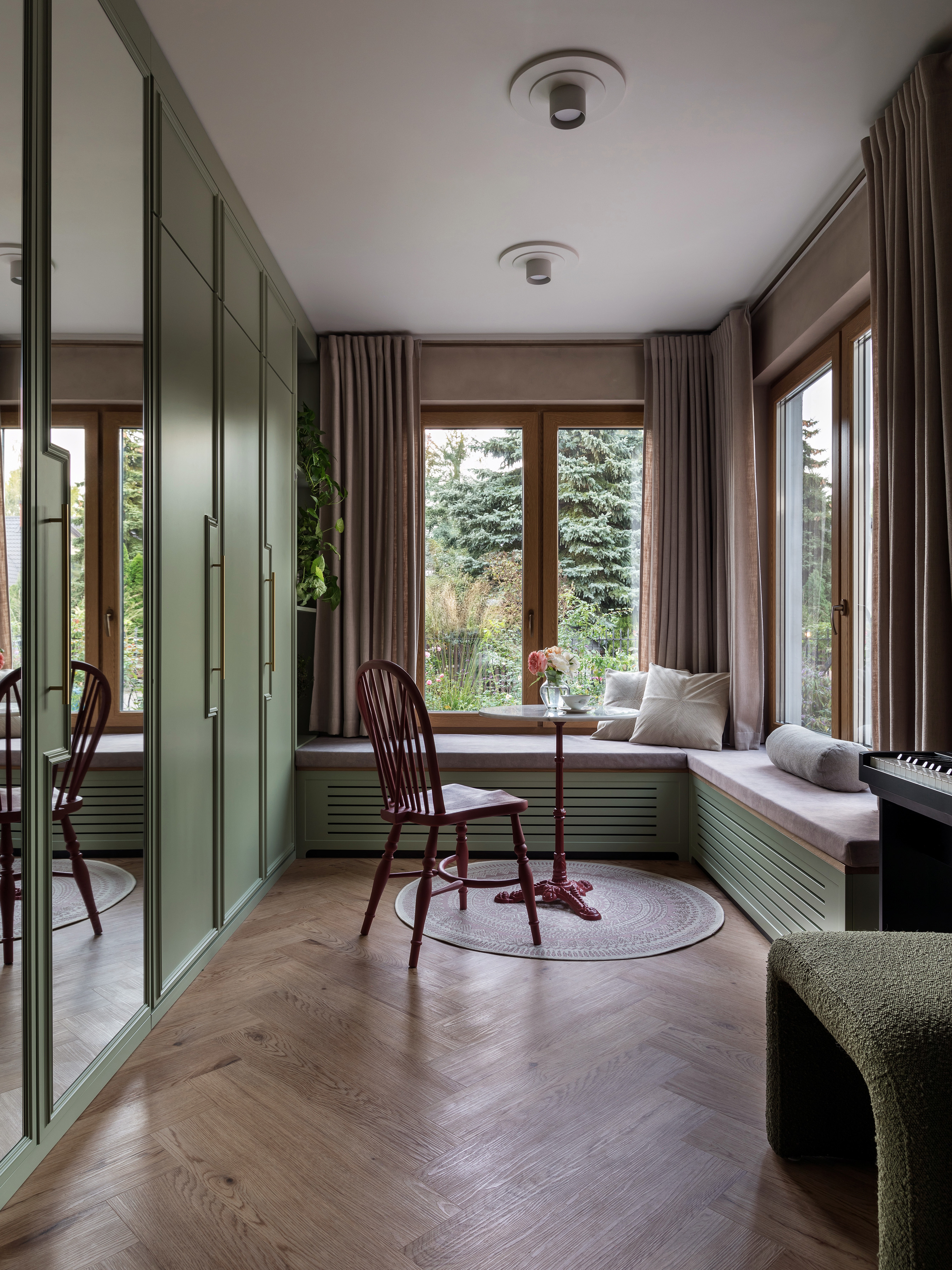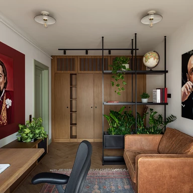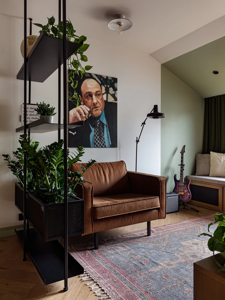 W pobliżu wejścia zaprojektowano gabinet o męskim charakterze, inspirowany filmową estetyką, gdzie dębowy stół i wygodny fotel służą nie tylko pracy, ale i odpoczynkowi domowych zwierząt. Parter uzupełnia wielofunkcyjny pokój kreatywny, który dzięki mobilnym meblom i ukrytemu łóżku może w każdej chwili zmienić się z pracowni muzycznej w sypialnię dla gości.