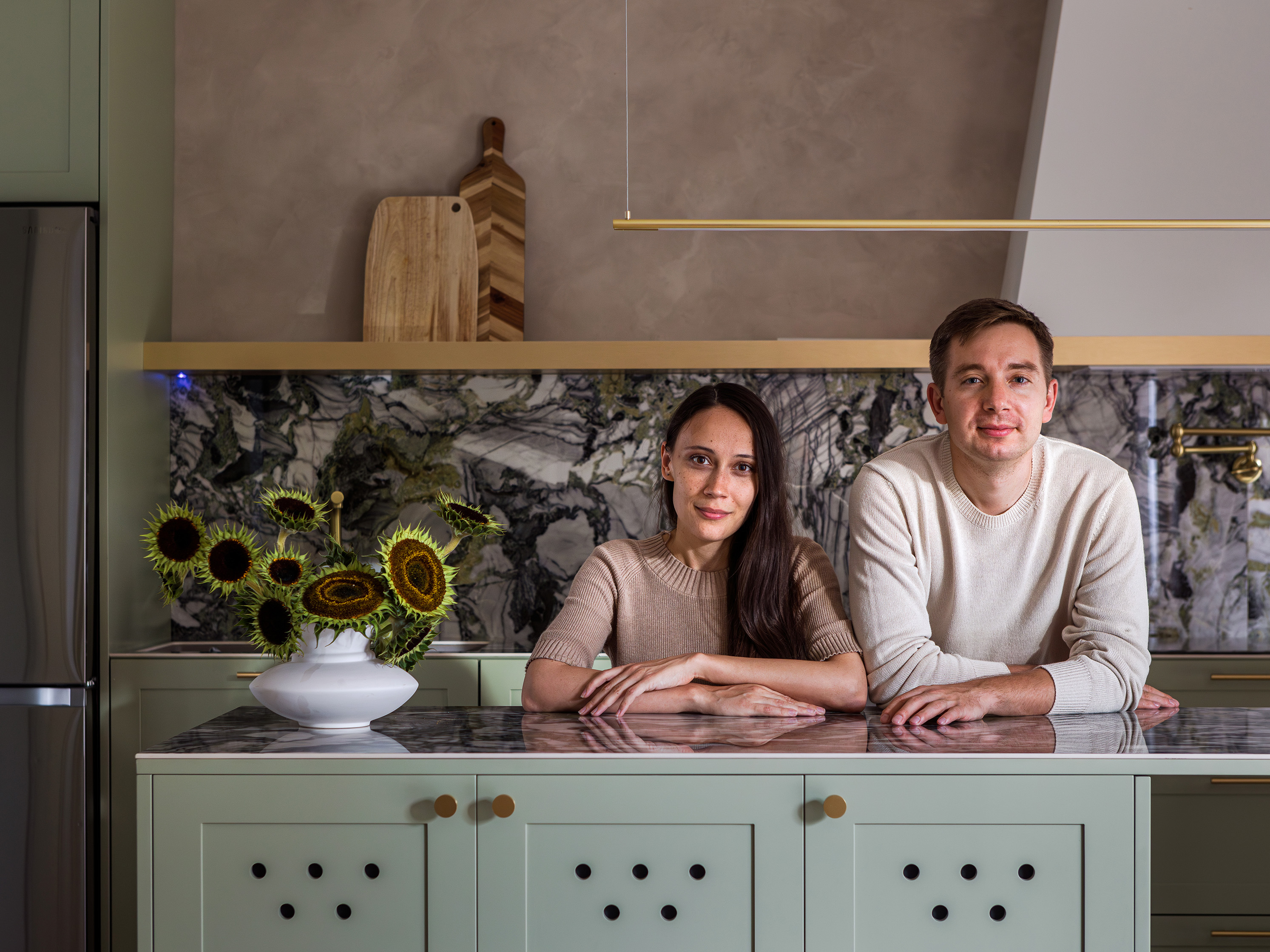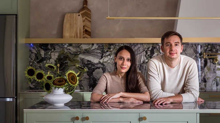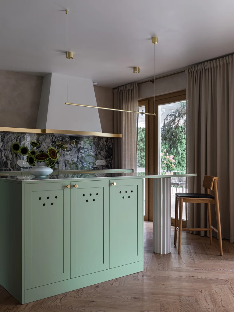 Kuchnię wyróżnia zielona zabudowa oraz kamienne wykończenia na wyspie, a naprzeciwko stołu znalazło się miejsce na witrynę z ceramiką, którą kolekcjonuje właścicielka.