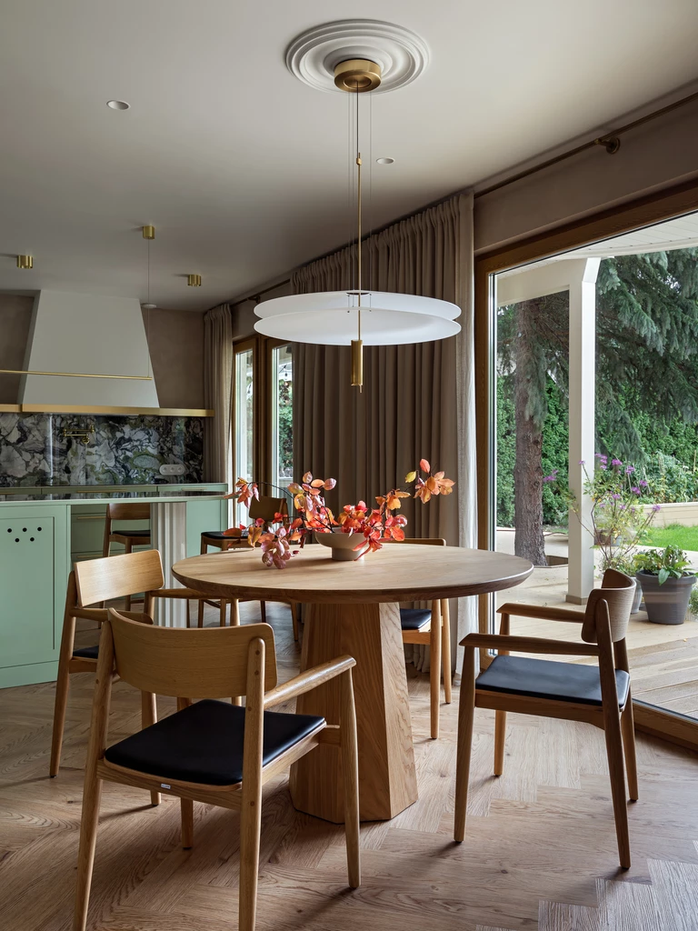 Parter stanowi centrum życia rodzinnego, gdzie otwarta strefa dzienna łączy salon, jadalnię oraz przestronną kuchnię. Centralnym punktem wypoczynkowym jest miękka sofa idealna do wspólnych rozmów, a w części jadalnianej stanął okrągły, drewniany stół z widokiem na ogród.