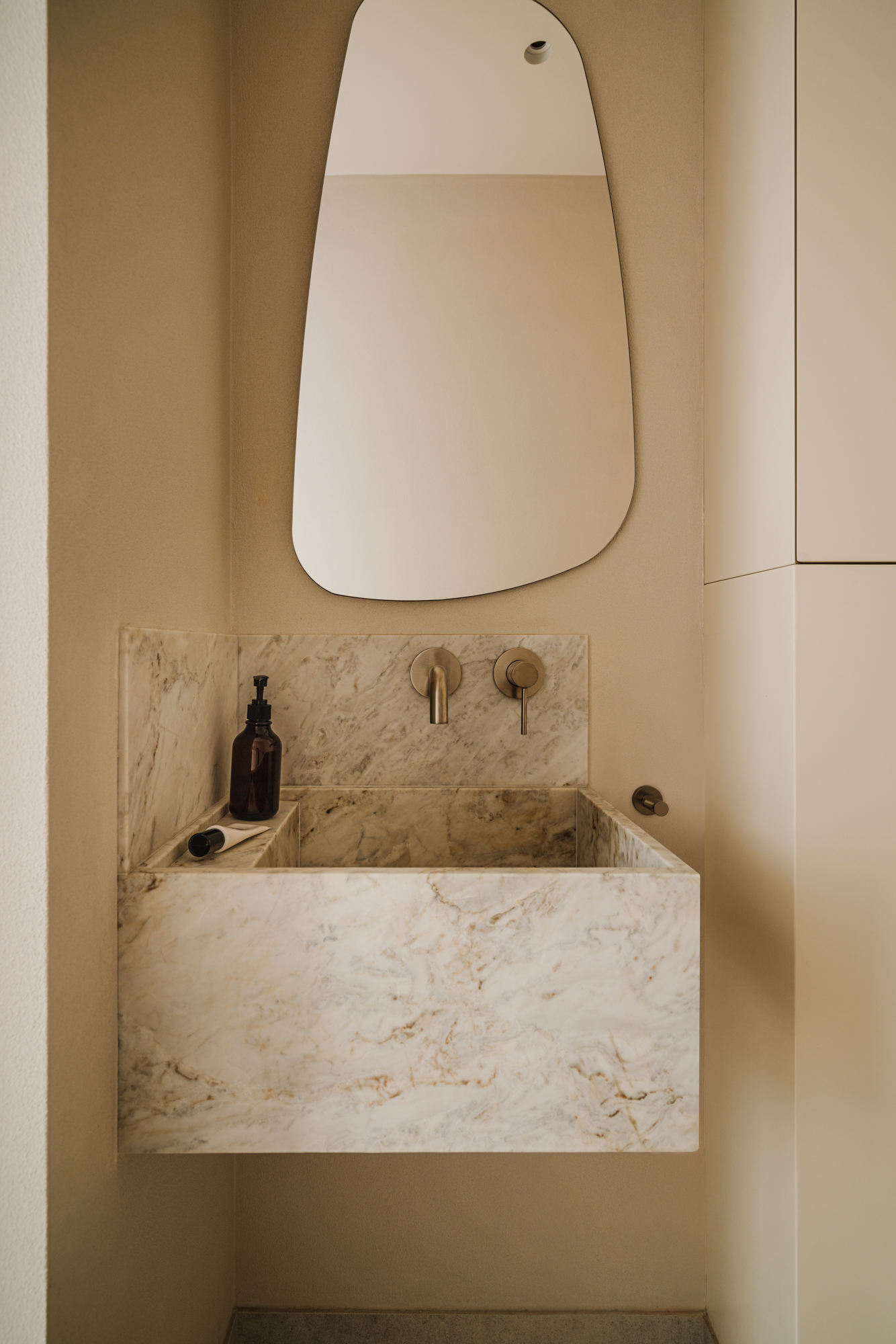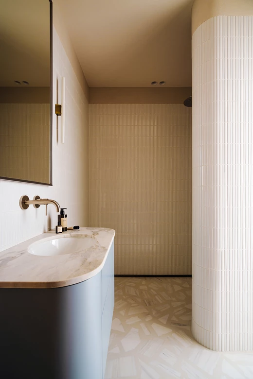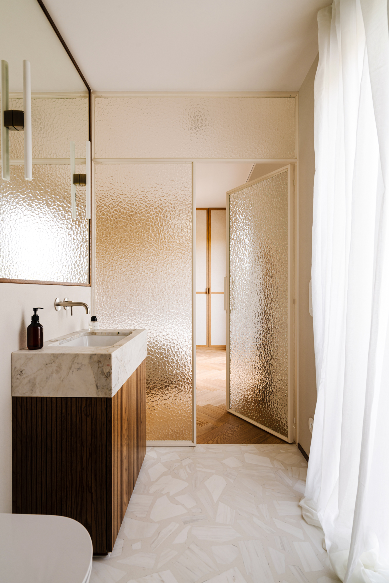 W łazienkach pojawiła się podłoga w stylu terrazzo – rozwiązanie, które natychmiast przywołuje obraz śródziemnomorskich kamienic i ponadczasowego włoskiego wzornictwa.