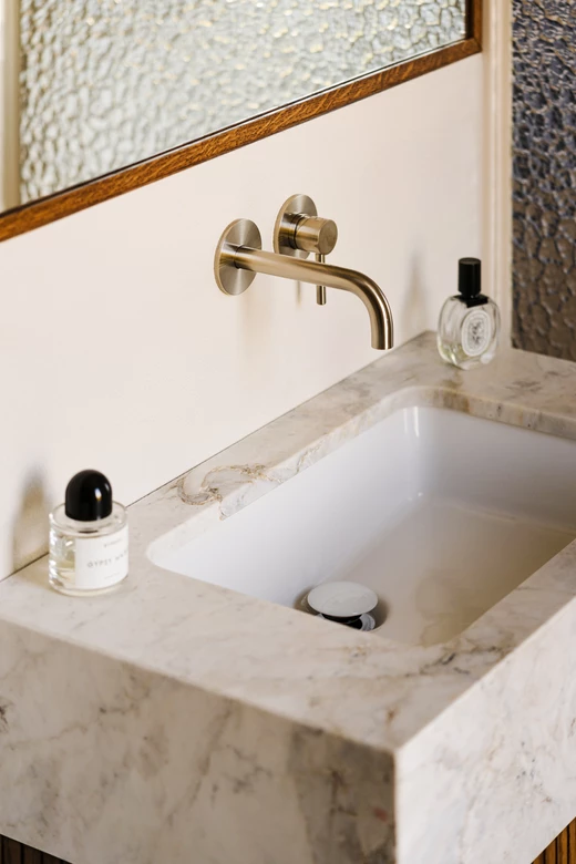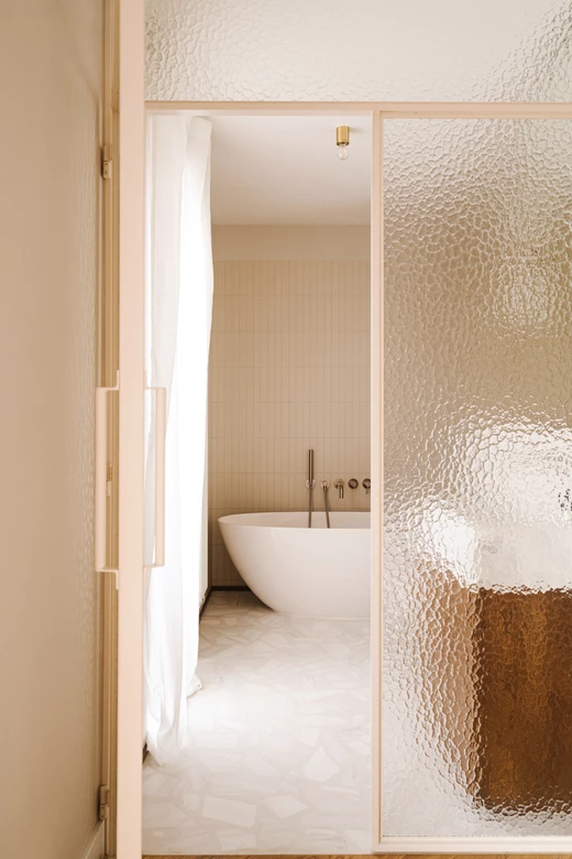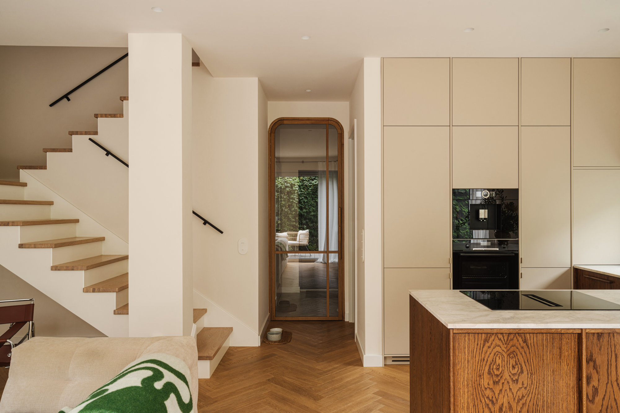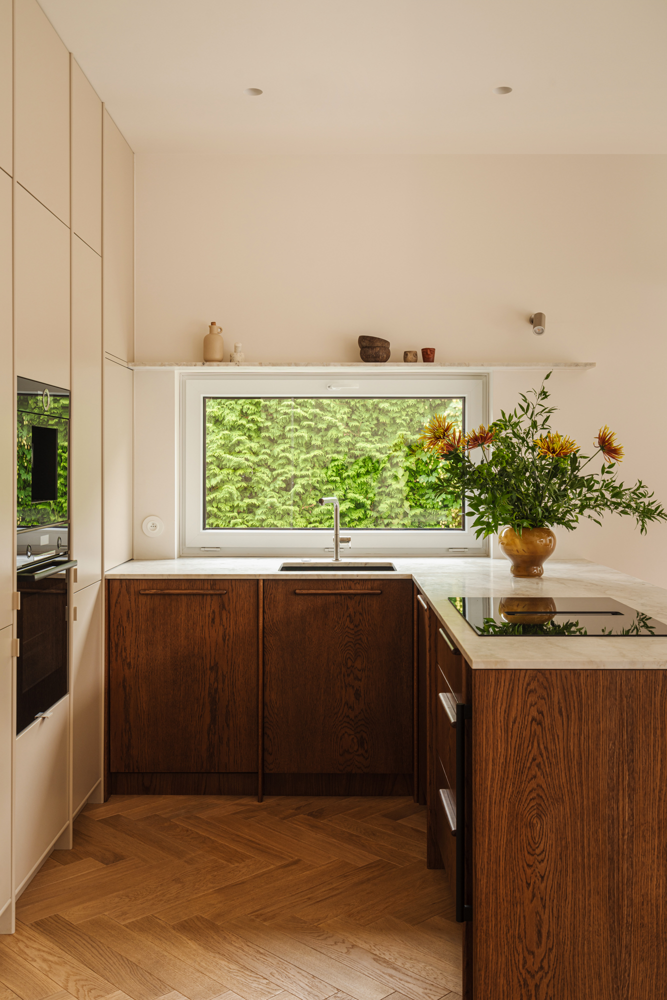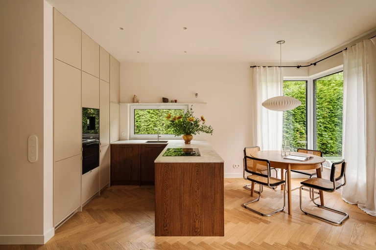 Naturalna baza wnętrza to pochwała prostoty i szlachetności materiałów: drewniana kuchnia, klasyczna jodełka, naturalny kamień i miękkie tkaniny budują ciepłą, elegancką narrację. Do niej dopisane zostały akcenty vintage – krzesła Cesca, modernistyczny fotel czy przeszklenia z ornamentem w łazience z wanną, które rozpraszają światło jak biżuteria architektoniczna.