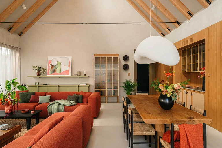 Część mebli została wykonana według projektu autorki przestrzeni, w tym czerwone sofy, szafka rtv, stół jadalniany oraz komody. Witryny – zarówno ta wolnostojąca, jak i szafki wiszące znajdujące w strefie z ekspresem w jadalni – służą do eksponowania pamiątek inwestorów z podróży, w tym kubków, naczyń, drobiazgów.