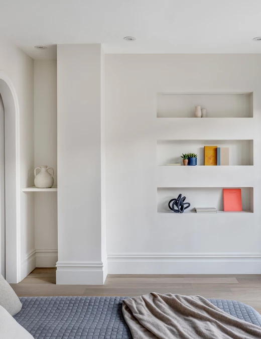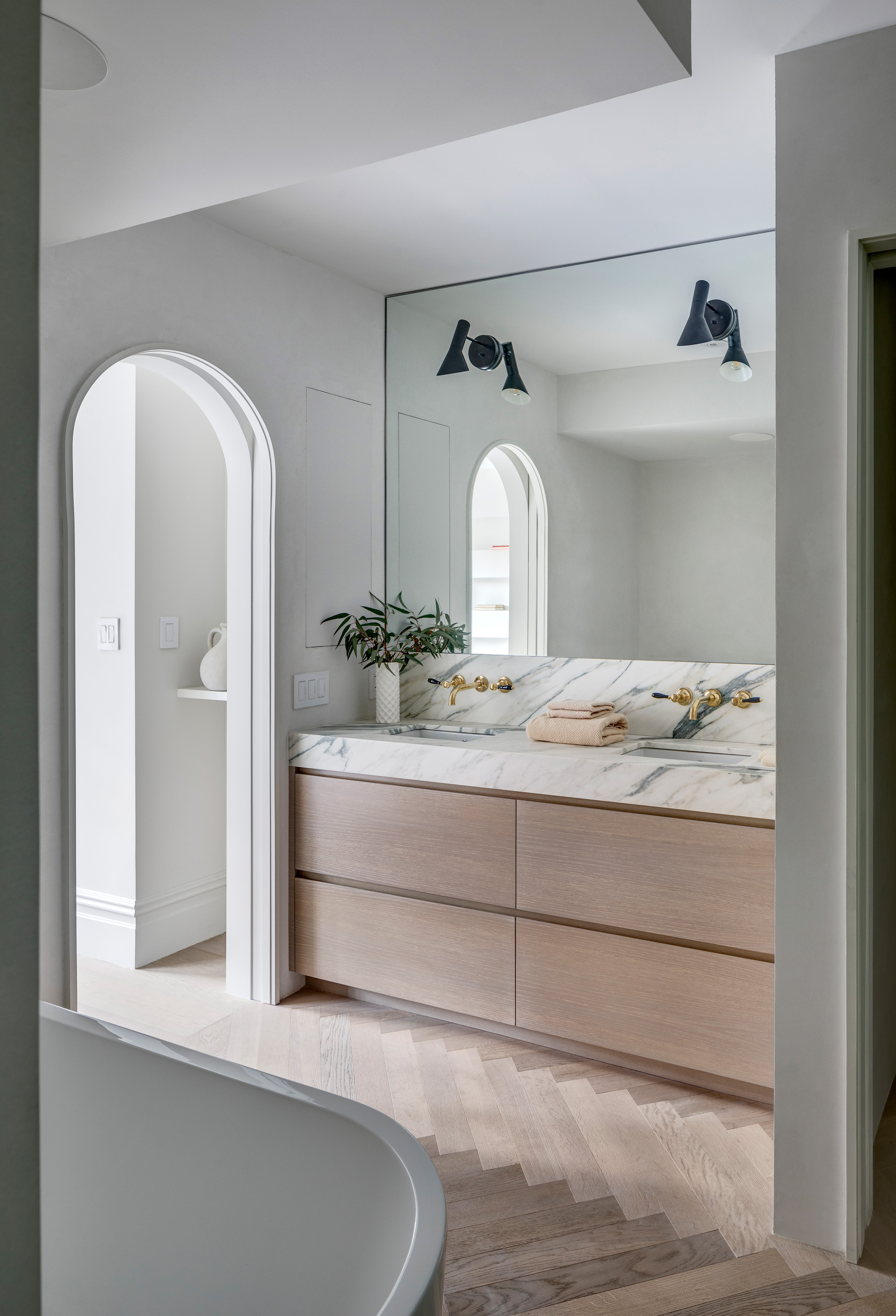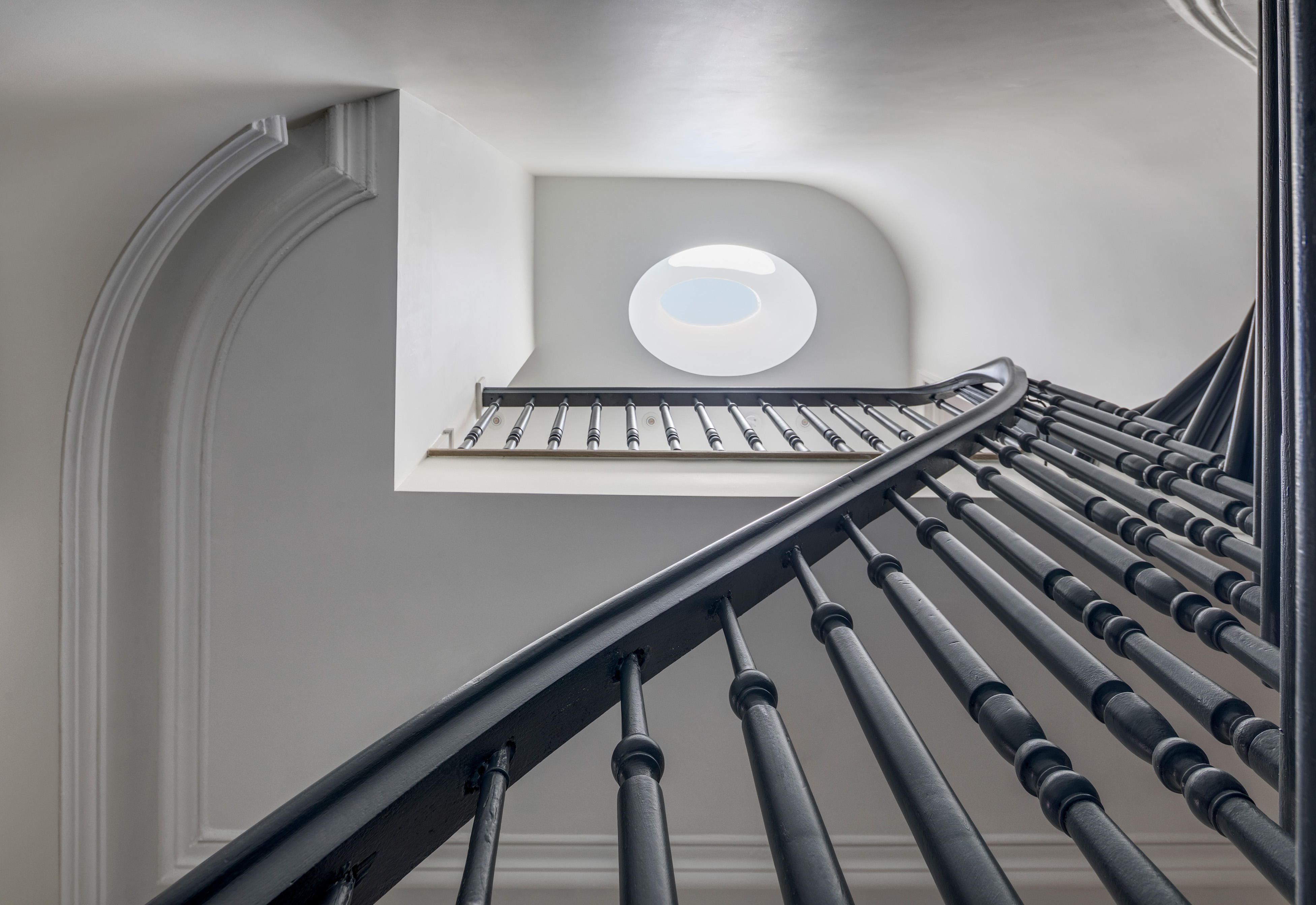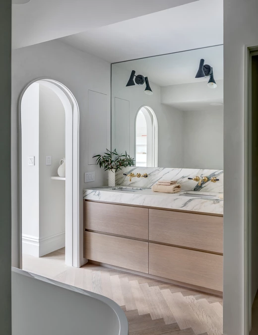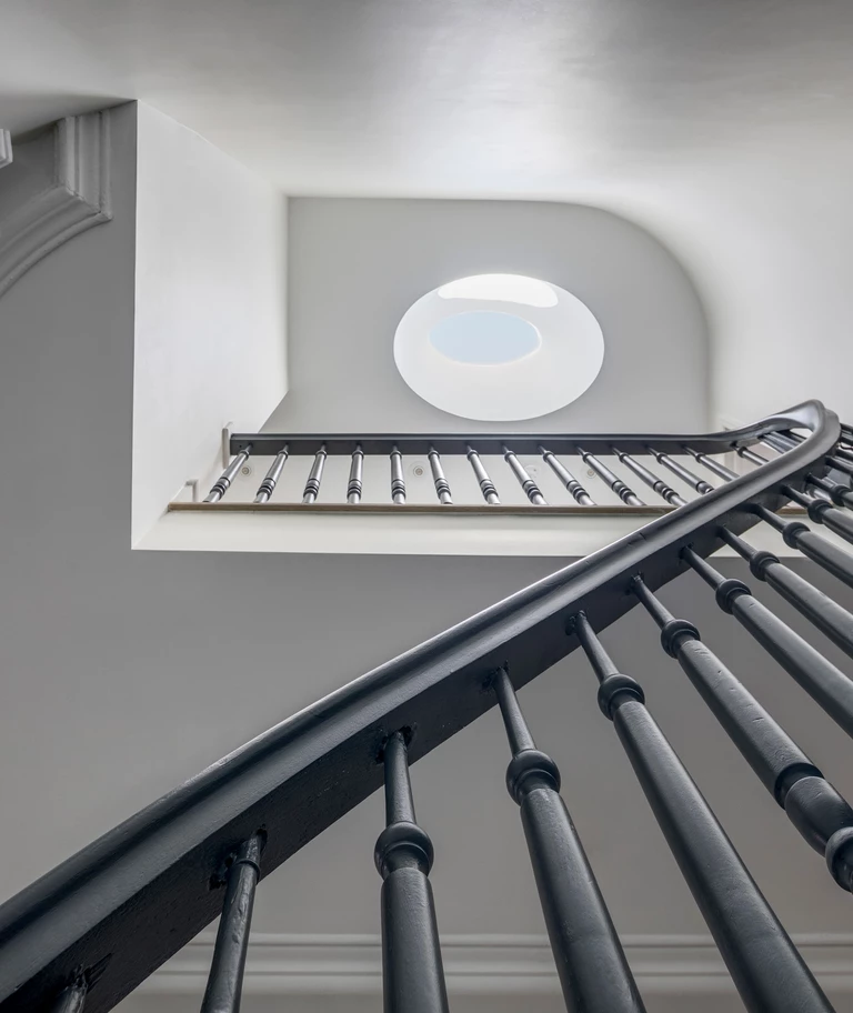 Punktem wyjścia i głównym leitmotivem projektu stał się detal, który od początku definiował charakter budynku – łukowate zwieńczenie drzwi wejściowych i frontowego okna. Architekci z BAAO uczynili z tej formy klucz do przestrzennej narracji, powtarzając ją wewnątrz w postaci nowych, szerokich otworów. Łuk stał się motywem tworzącym płynne, niemal ceremonialne przejścia między foyer, jadalnią a kuchnią, budując wrażenie spójności i wizualnego rytmu. Ta gra z geometrią znajduje swoją kontynuację w owalnym świetliku, który zainstalowano nad odrestaurowanymi, oryginalnymi drewnianymi schodami, idealnie wpisując go w geometrię klatki schodowej.