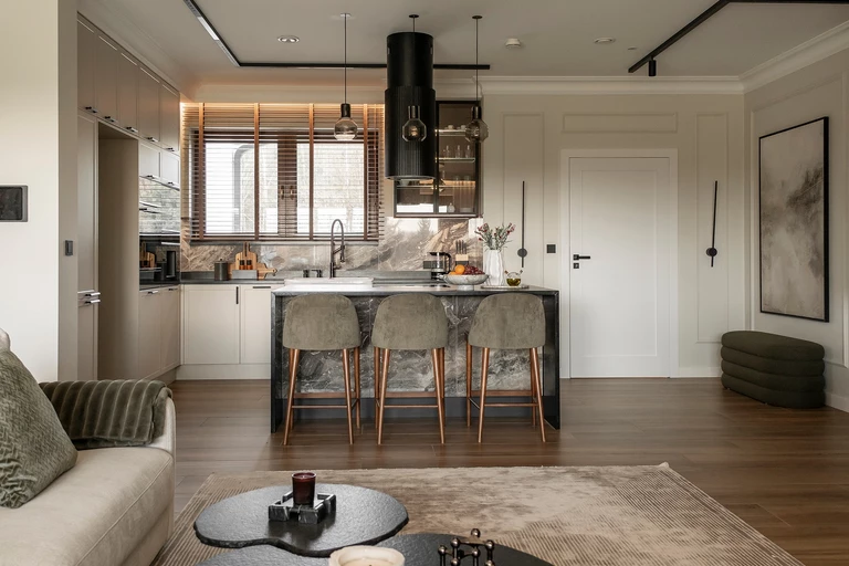 Wnętrze dopracowano w najdrobniejszych detalach, co nadało mu elegancji i spójności. Ważną rolę odgrywają w nim sztuka, rzemiosło i wysokiej jakości materiały. Wiele elementów wykonano na zamówienie – od mebli i łóżek po mural autorstwa Jakuba Bitki, zdobiący ścianę w pokoju chłopców. W jadalni uwagę przyciąga ręcznie wykonany stół z litego dębu od lokalnej firmy Jadik. W kuchni zastosowano granitowy blat Sensa od Cosentino – trwały i estetycznie efektowny. Podłogi dopasowano do potrzeb użytkowników: w strefie dziennej dominują odporne na zarysowania płytki, natomiast w sypialniach i pokojach dzieci – miękka wykładzina.