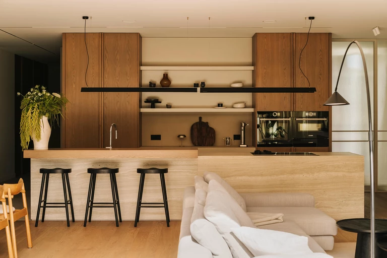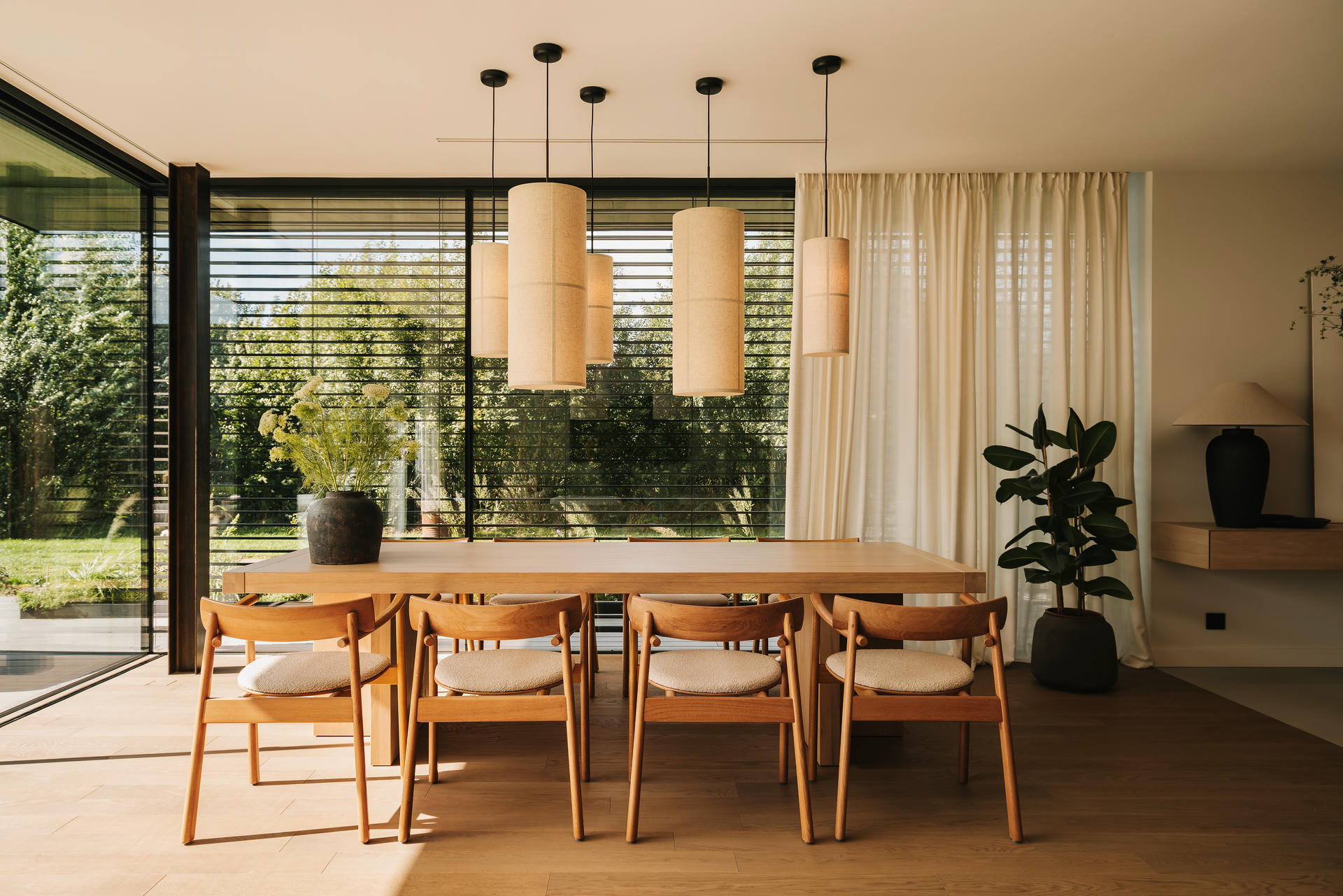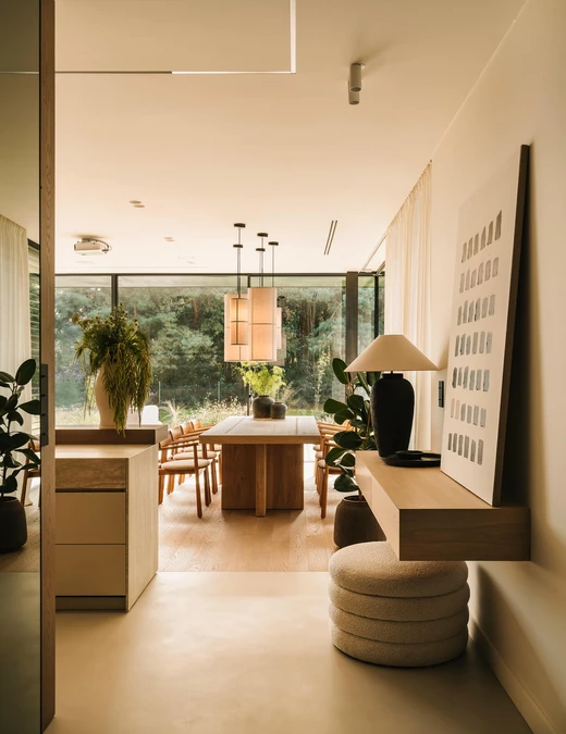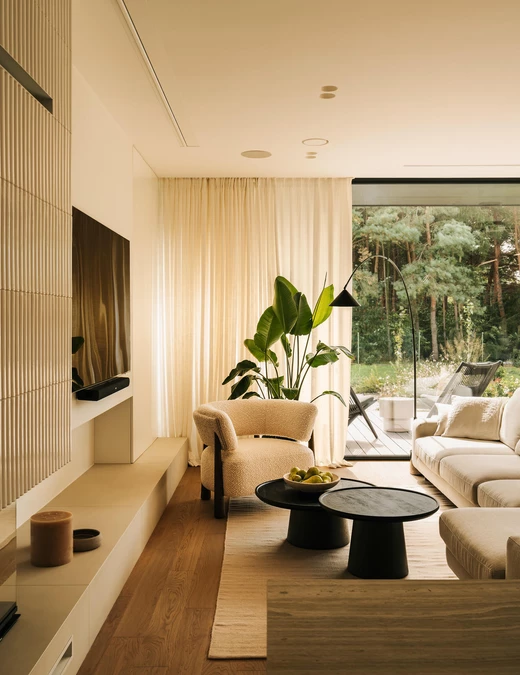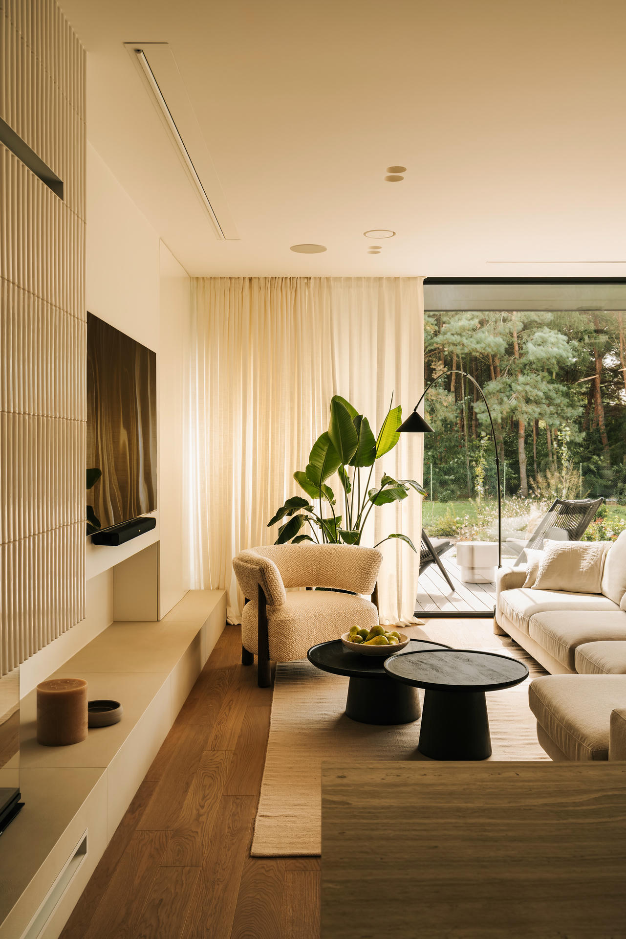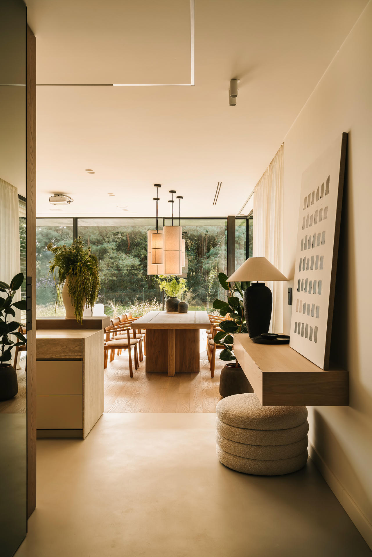 W środku dom opiera się na spójnej palecie naturalnych materiałów: dębowych podłogach, mikrocemencie, spiekach i fornirze. To zestawienie nadaje przestrzeni elegancki, wyciszony charakter.