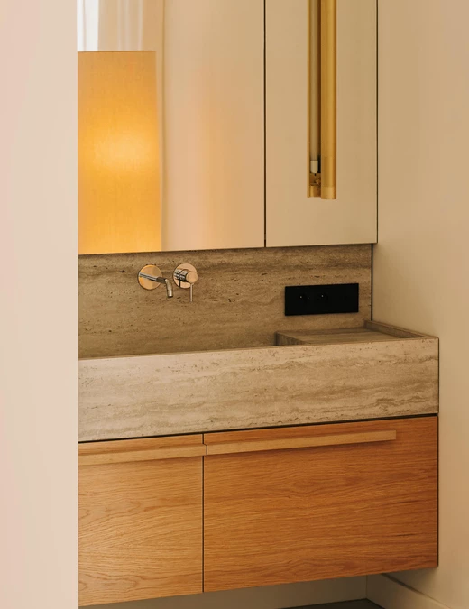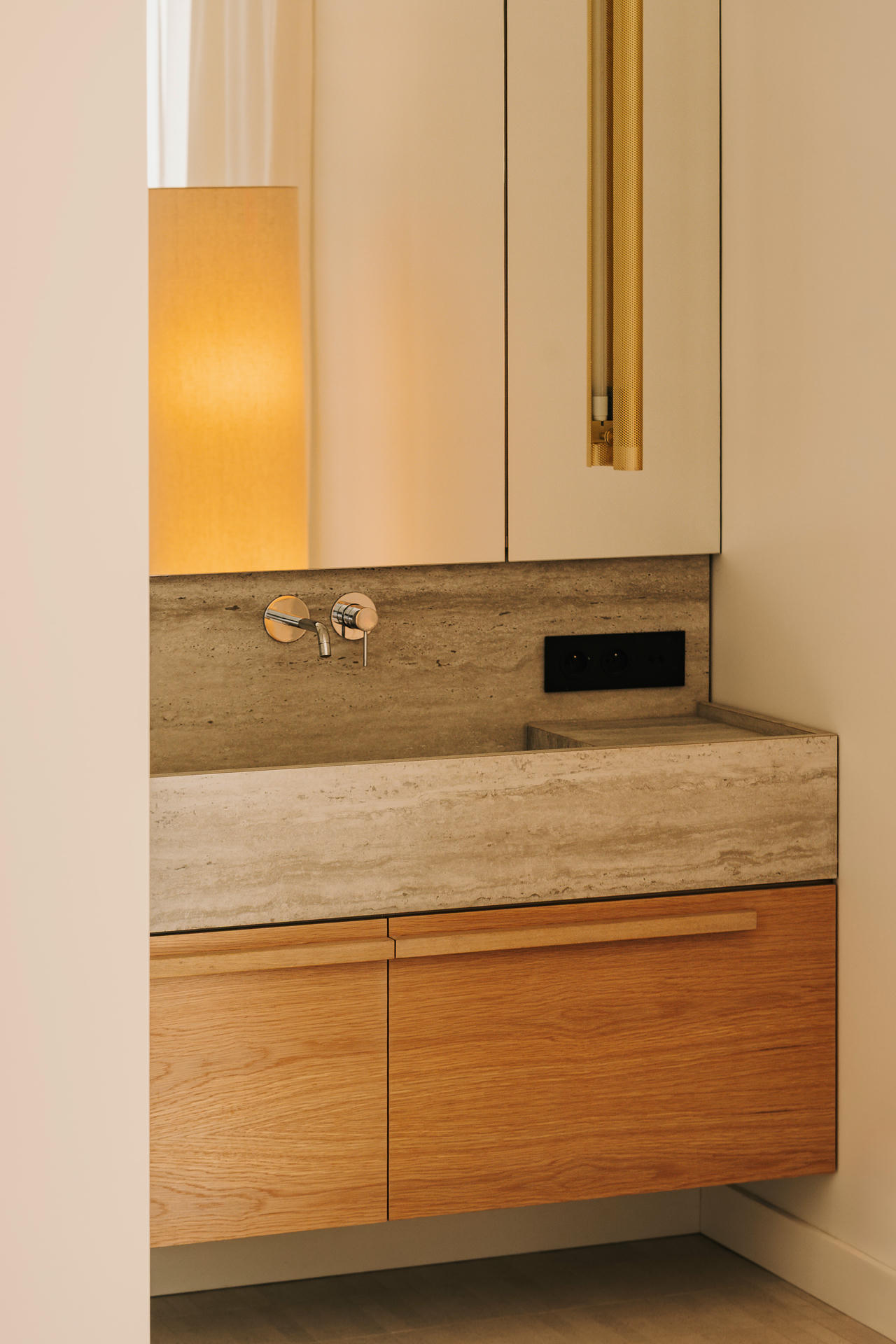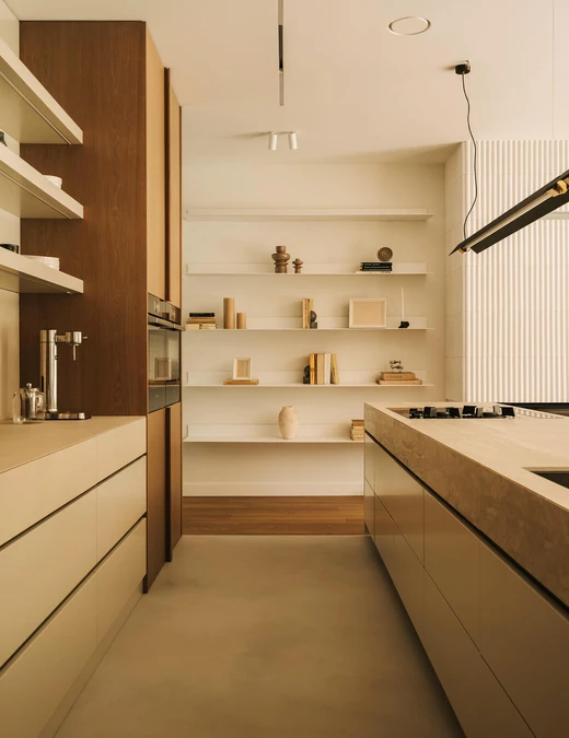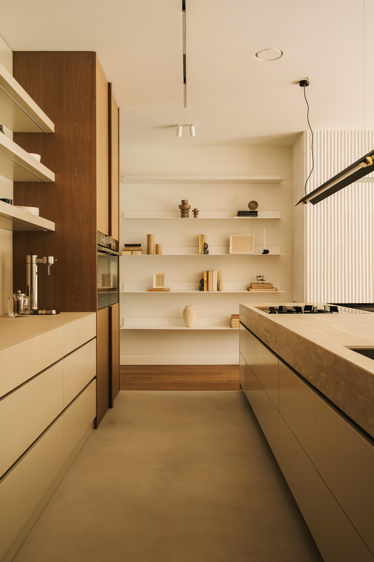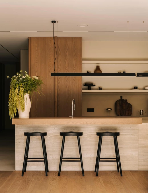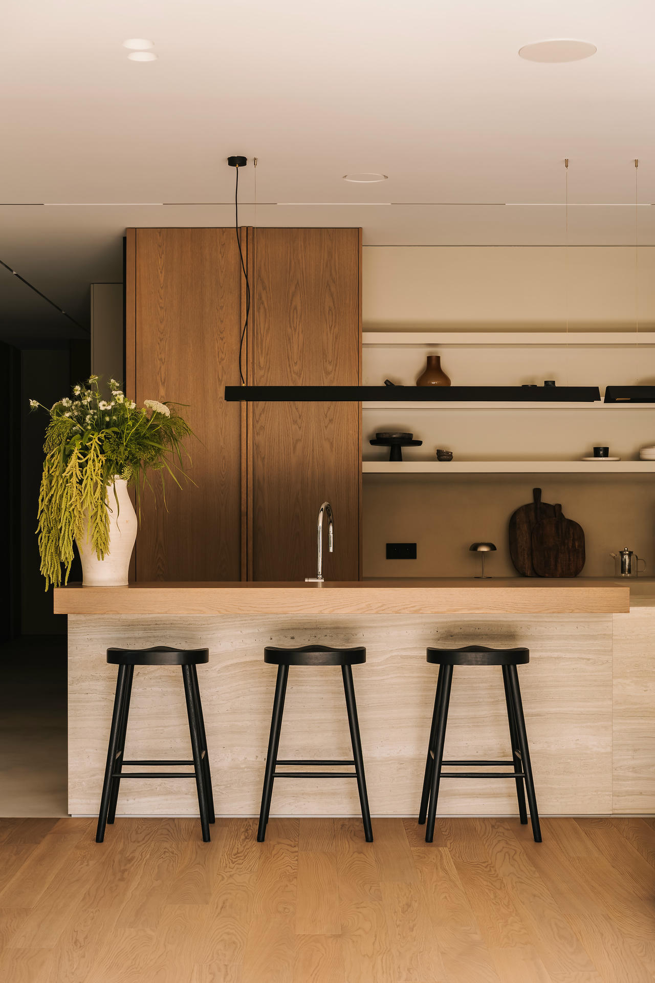 W środku dom opiera się na spójnej palecie naturalnych materiałów: dębowych podłogach, mikrocemencie, spiekach i fornirze. To zestawienie nadaje przestrzeni elegancki, wyciszony charakter.