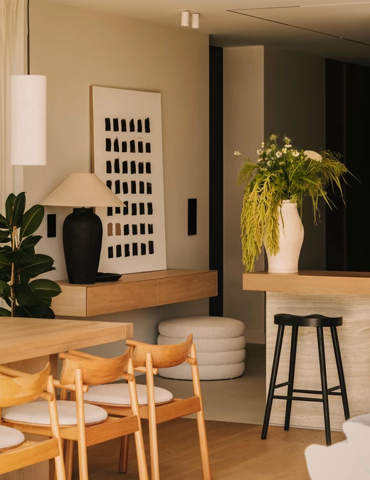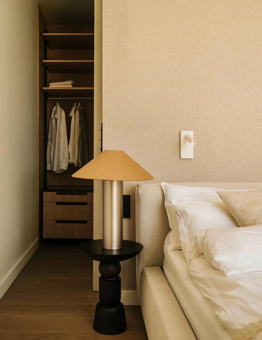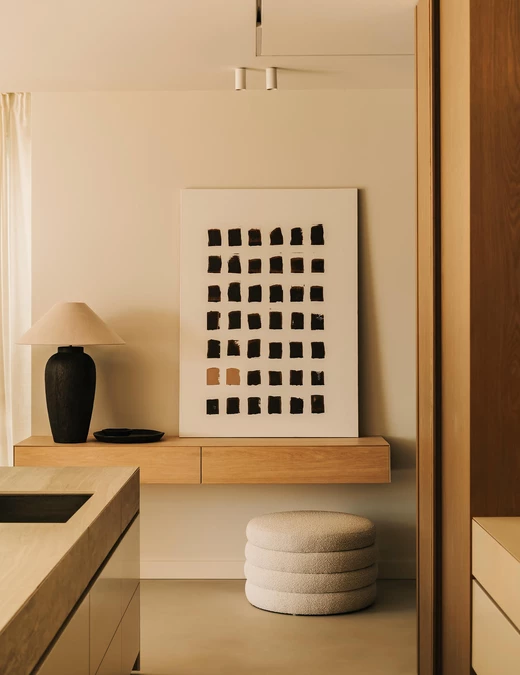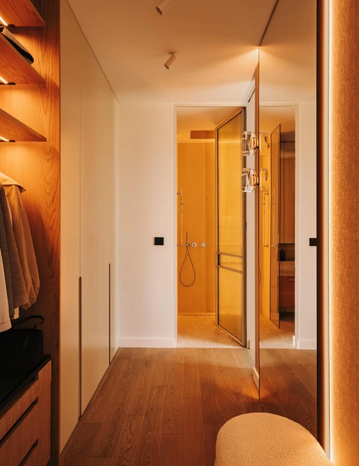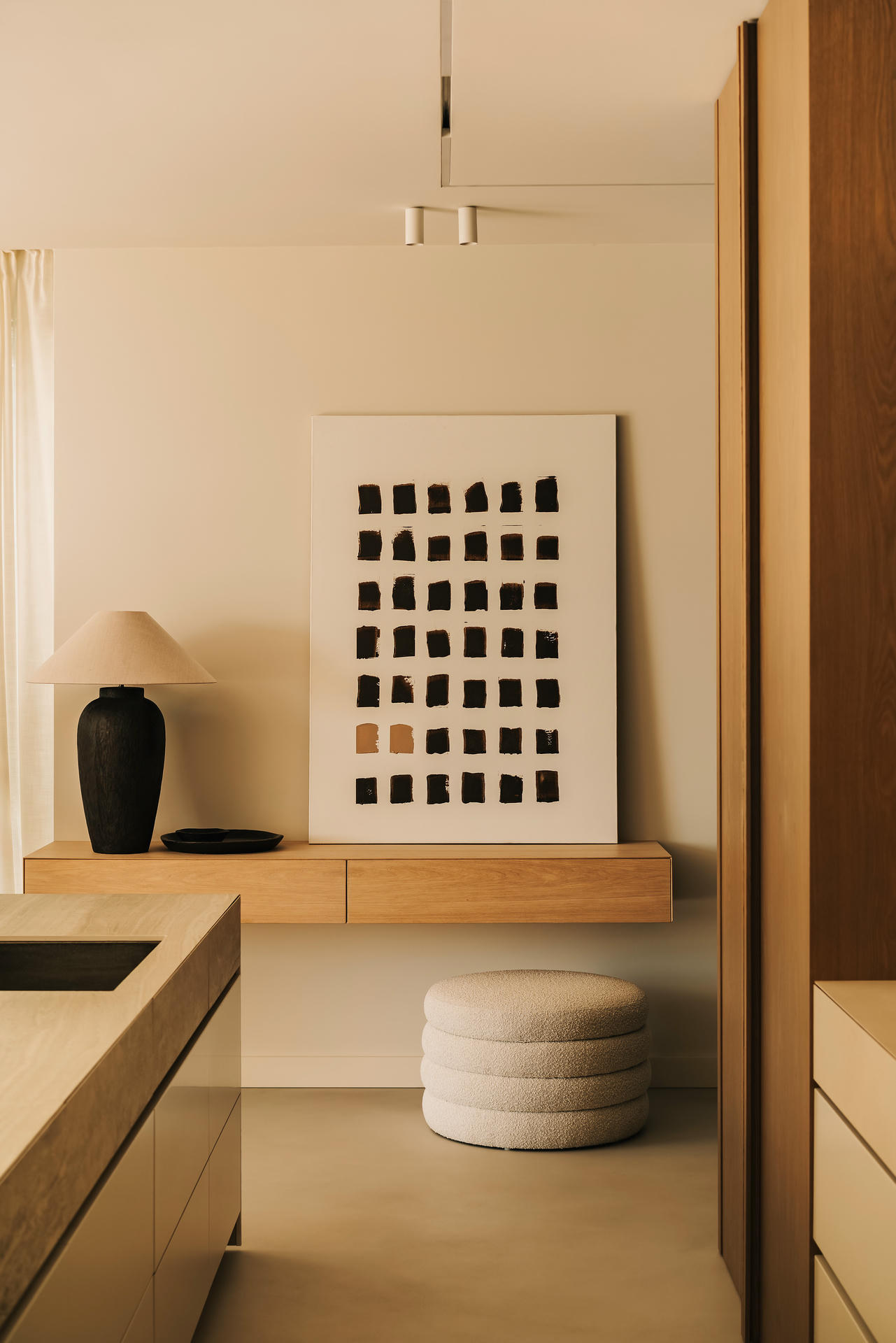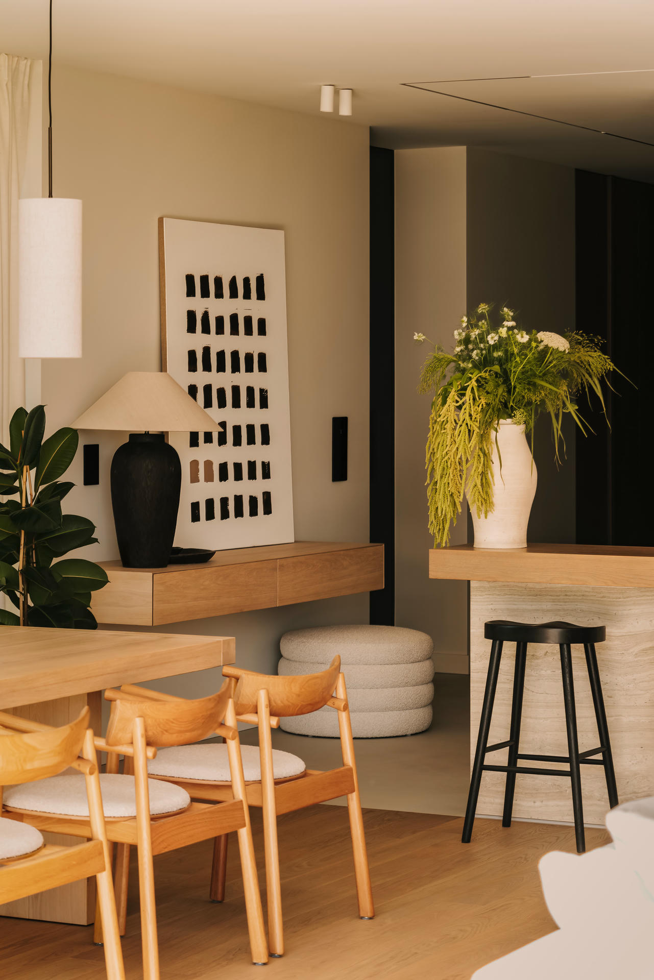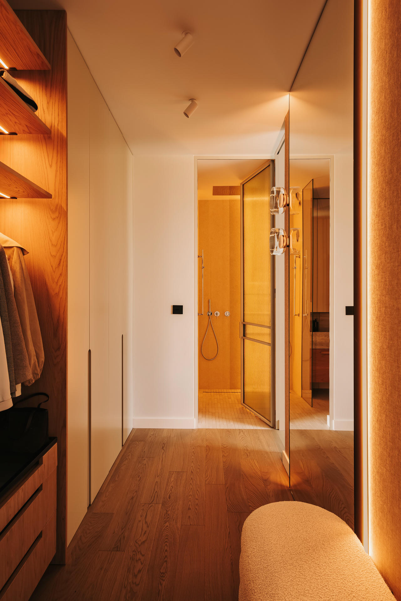 Strefa dzienna została zaprojektowana jako otwarta, czytelna i wyjątkowo komfortowa, z naciskiem na ergonomię oraz swobodę poruszania się – są to kluczowe aspekty dla docelowych użytkowników. Ciepłe światło, obłe formy mebli i starannie dobrane oświetlenie budują atmosferę sprzyjającą codziennemu odpoczynkowi.