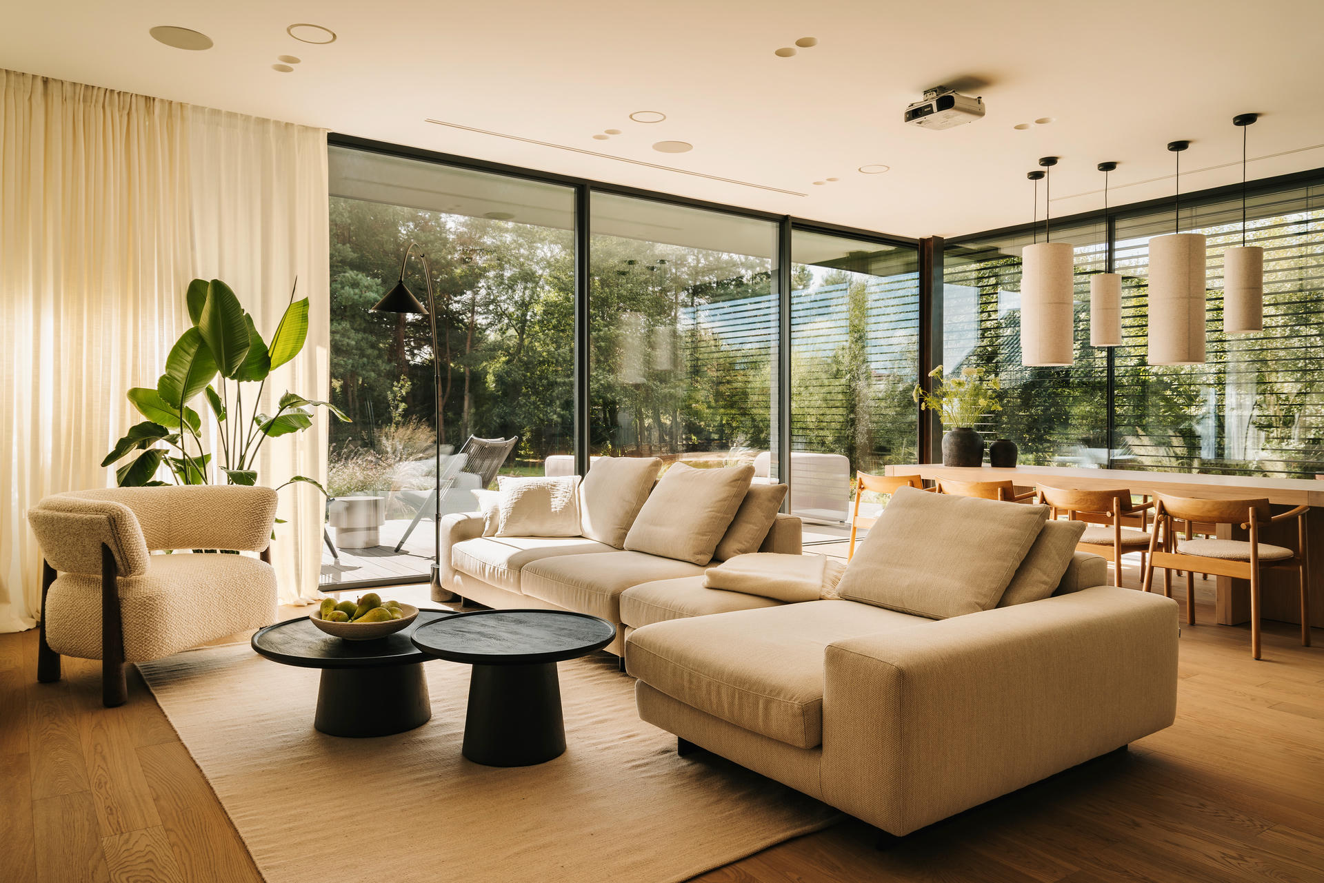 Duże przeszklenia na dwóch ścianach otwierają wnętrze na otaczający las, dzięki czemu zieleń staje się integralnym elementem domu. Taras i ogród pełnią rolę delikatnego tła dla życia domowników, subtelnie rozszerzając przestrzeń i podkreślając ideę przenikania się wnętrza z naturą.