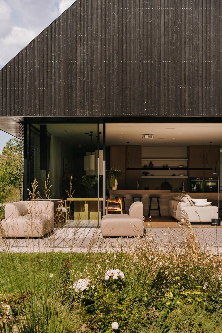 Z zewnątrz bryła została wykończona opalaną na czarno deską. Jej pionowa struktura nadaje architekturze charakteru i tworzy wyrazisty, minimalistyczny kontrast wobec miękkiego i naturalnego wnętrza. Choć forma domu pozostaje prosta, każdy detal został tu pieczołowicie dopracowany.