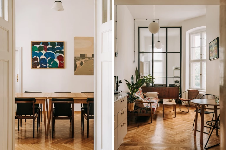 Drewniana podłoga ułożona w klasyczną jodełkę, wysokiej jakości meble, będące przykładami doskonałego dizajnu, oraz sztukaterie dopełniają całości, czyniąc wnętrze niepowtarzalnym.