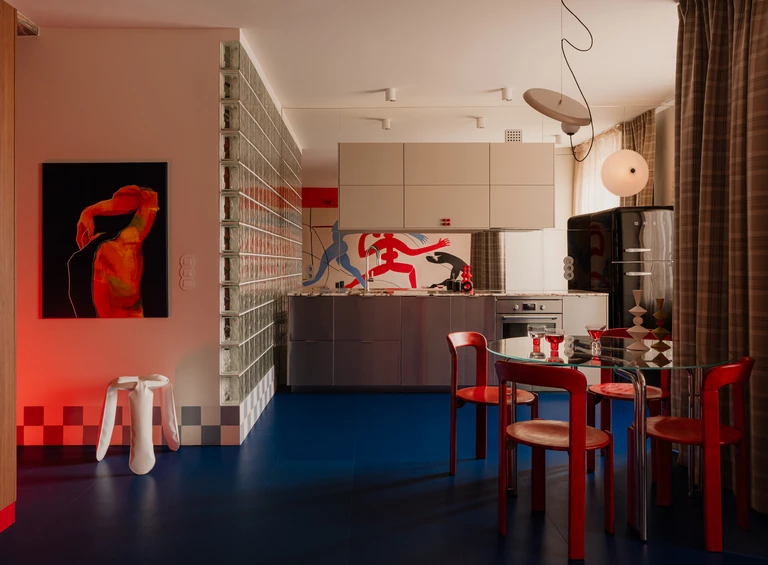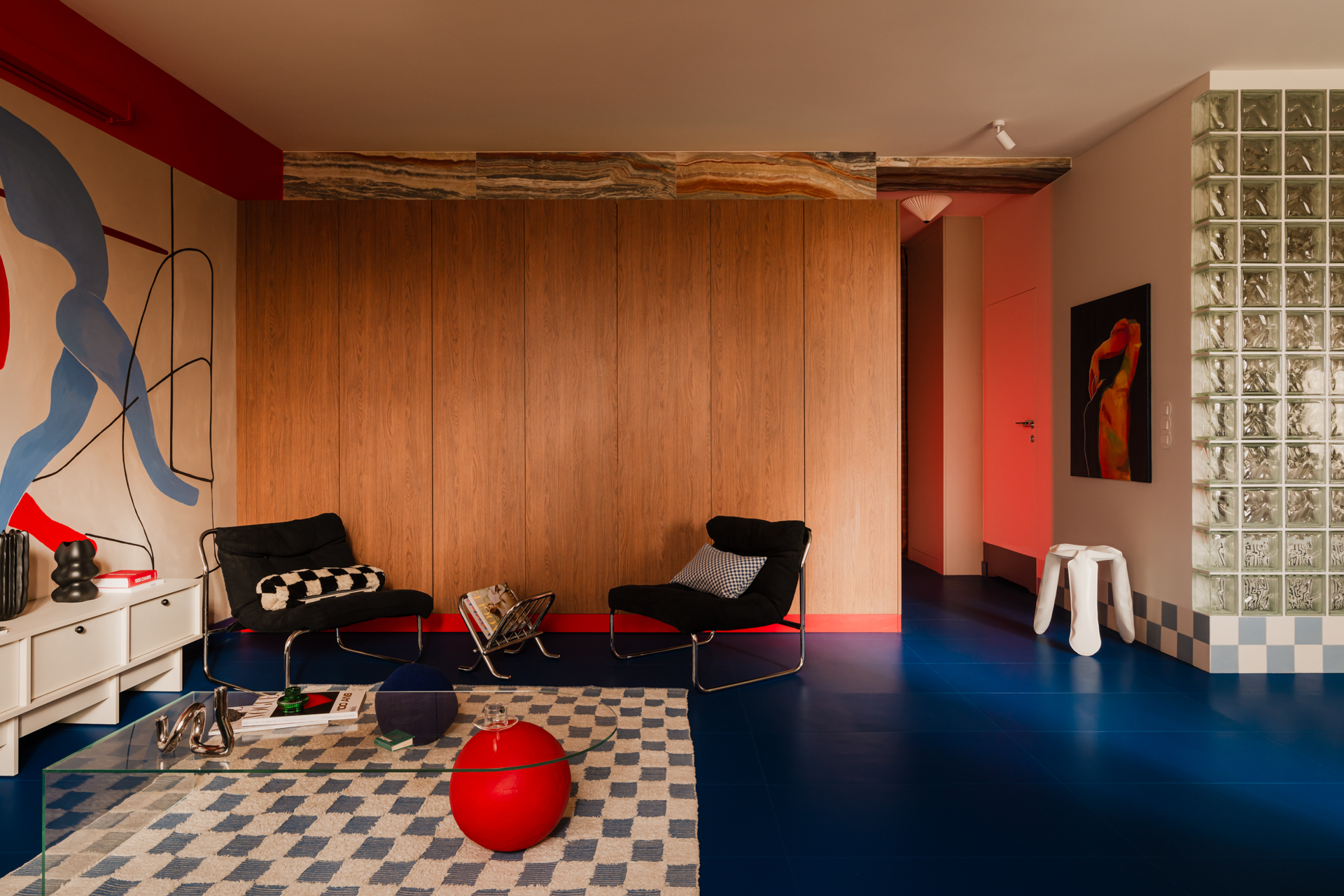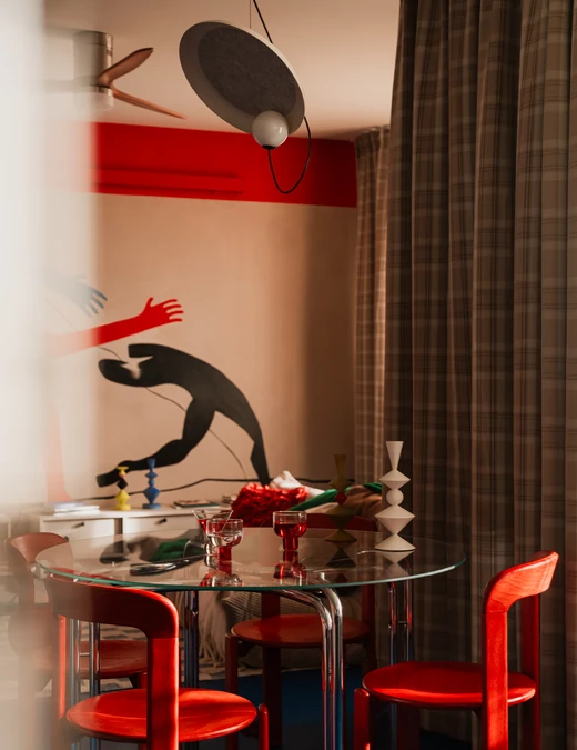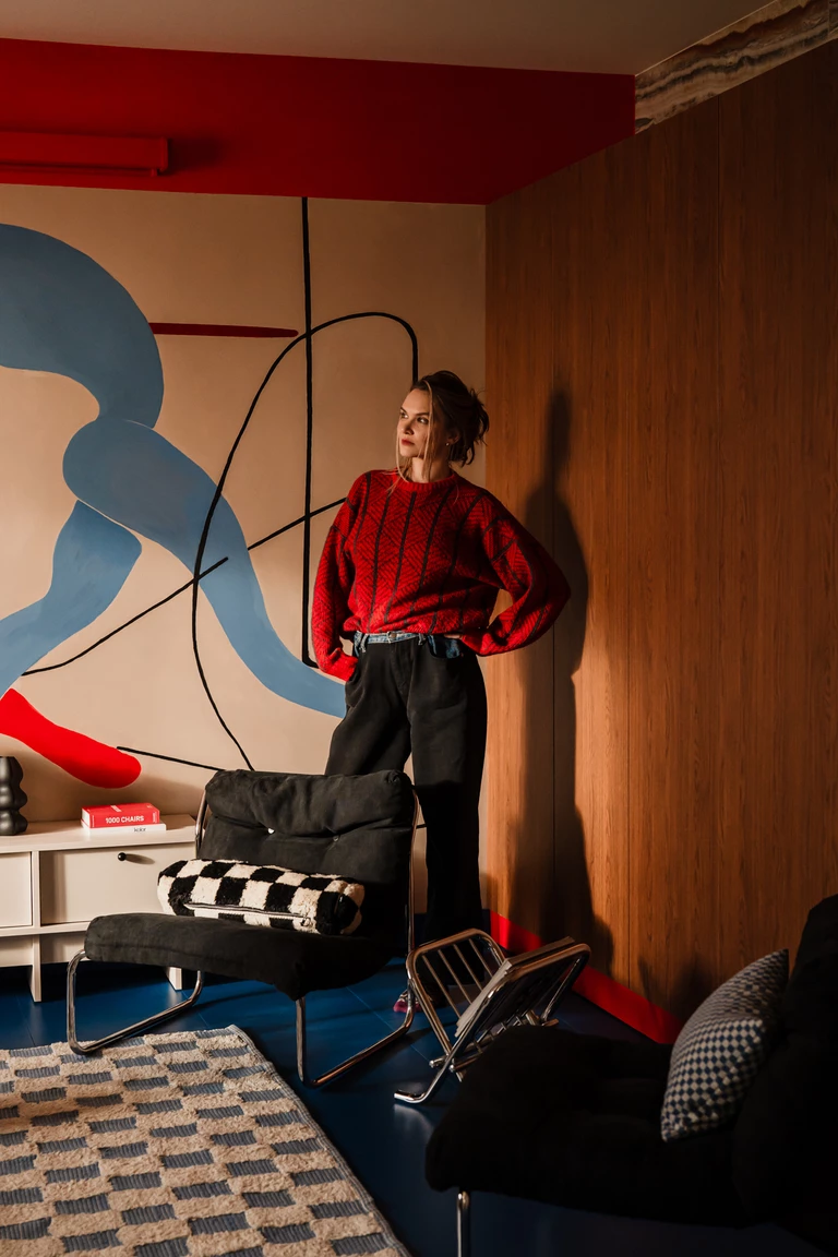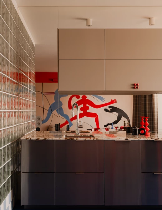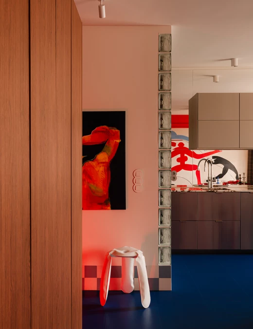 Centralnym punktem salonu jest mural zaprojektowany przez właścicielkę, która zajmuje się nauką tańca. Namalował go Michał Nalewajko. Kompozycja odnosi się do gestu i ekspresji ciała, a motyw sylwetek w czerwieniach i błękitach staje się osią narracji wizualnej całego mieszkania. W korytarzu pojawia się też związana z tematyką cielesności praca warszawskiej artystki Irmy Tylor pod tytułem „Paris is burning II”.