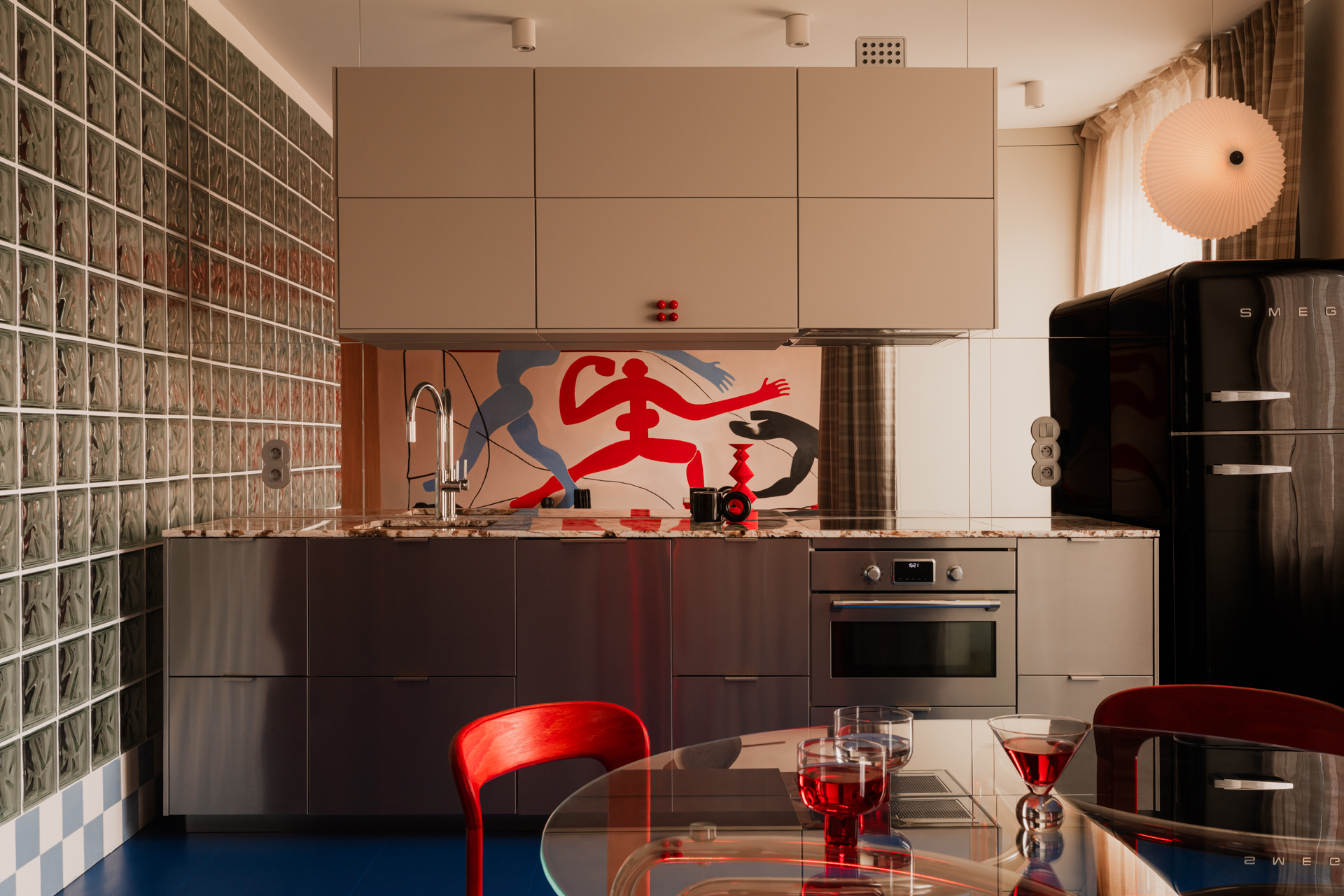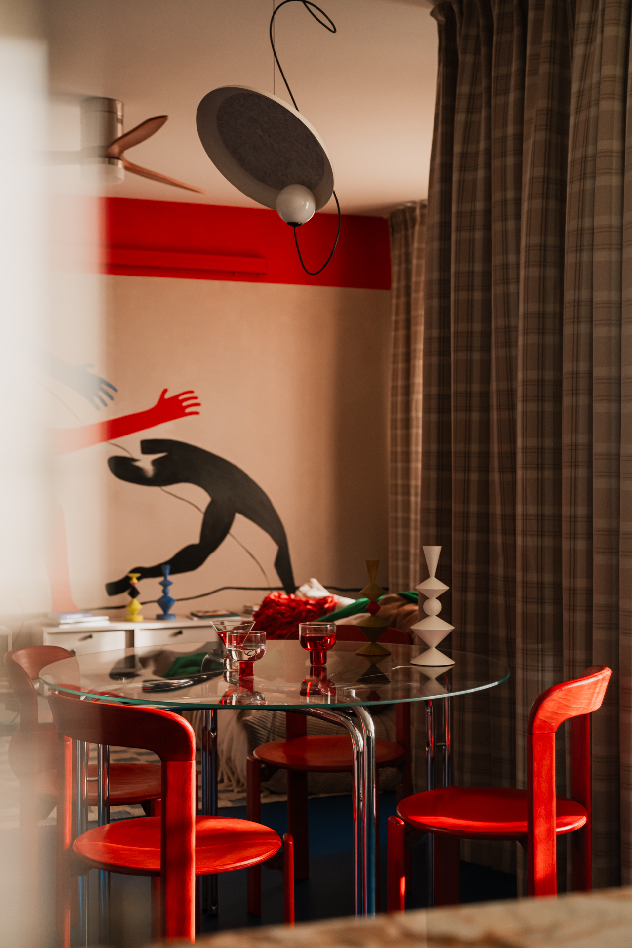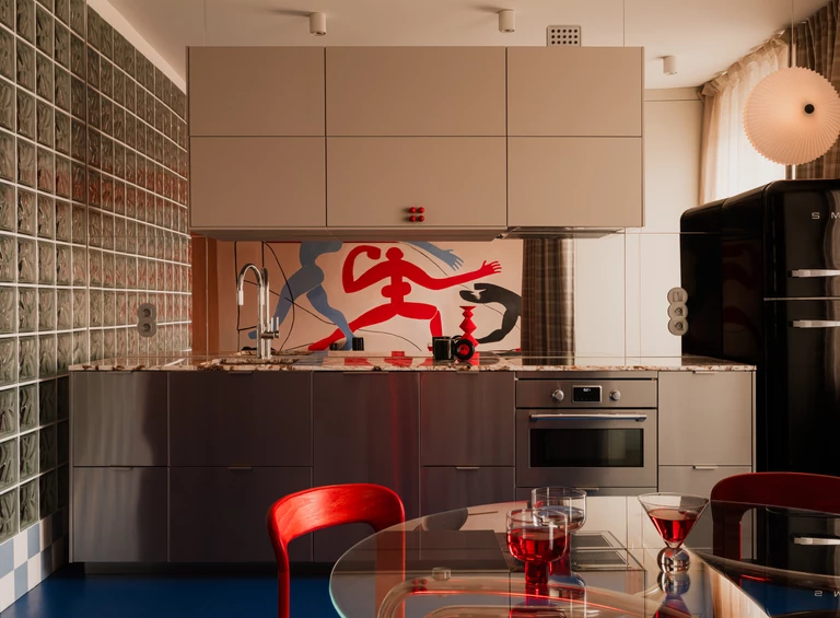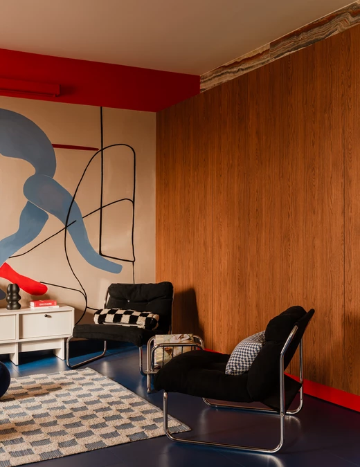 Centralnym punktem salonu jest mural zaprojektowany przez właścicielkę, która zajmuje się nauką tańca. Namalował go Michał Nalewajko. Kompozycja odnosi się do gestu i ekspresji ciała, a motyw sylwetek w czerwieniach i błękitach staje się osią narracji wizualnej całego mieszkania. W korytarzu pojawia się też związana z tematyką cielesności praca warszawskiej artystki Irmy Tylor pod tytułem „Paris is burning II”.