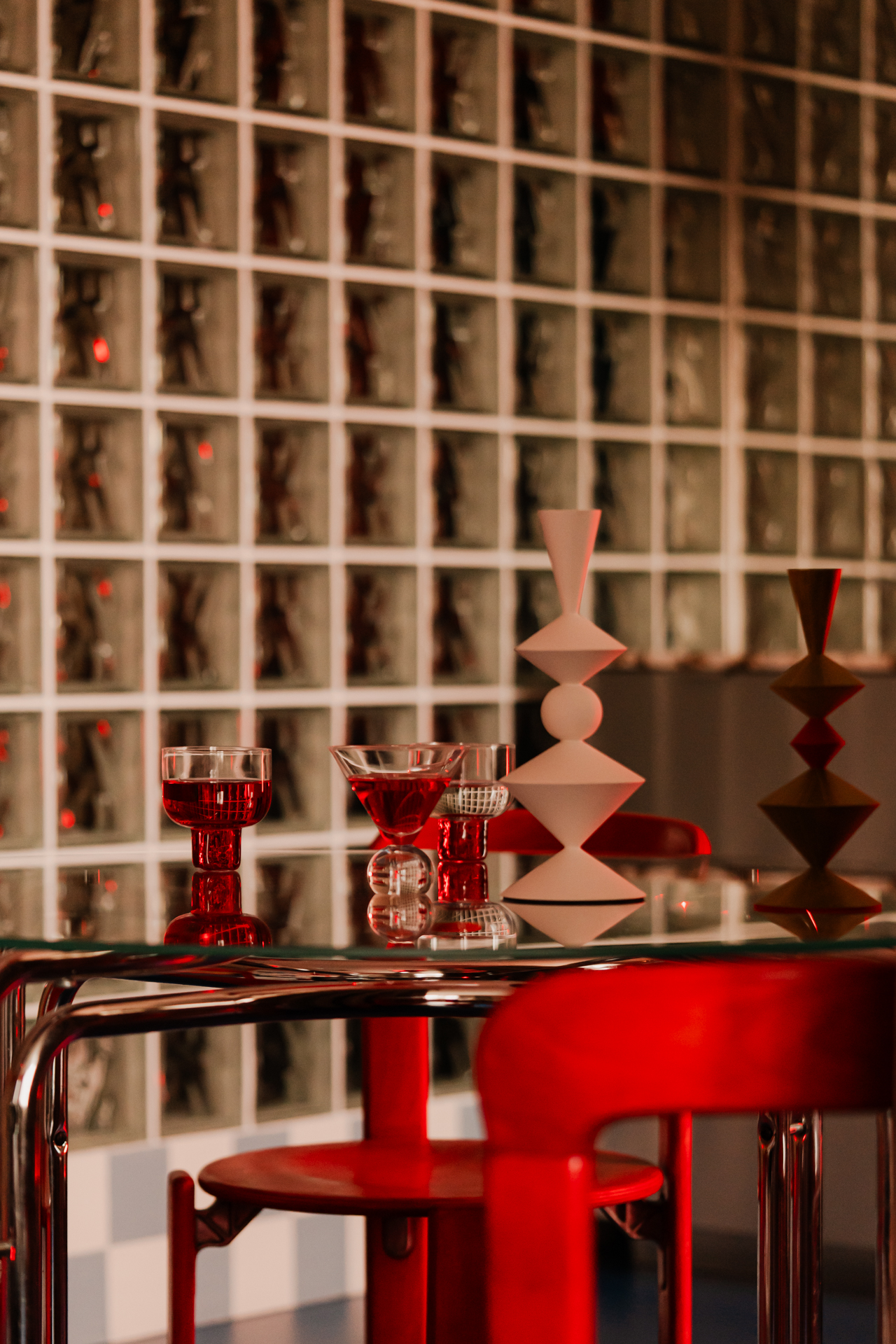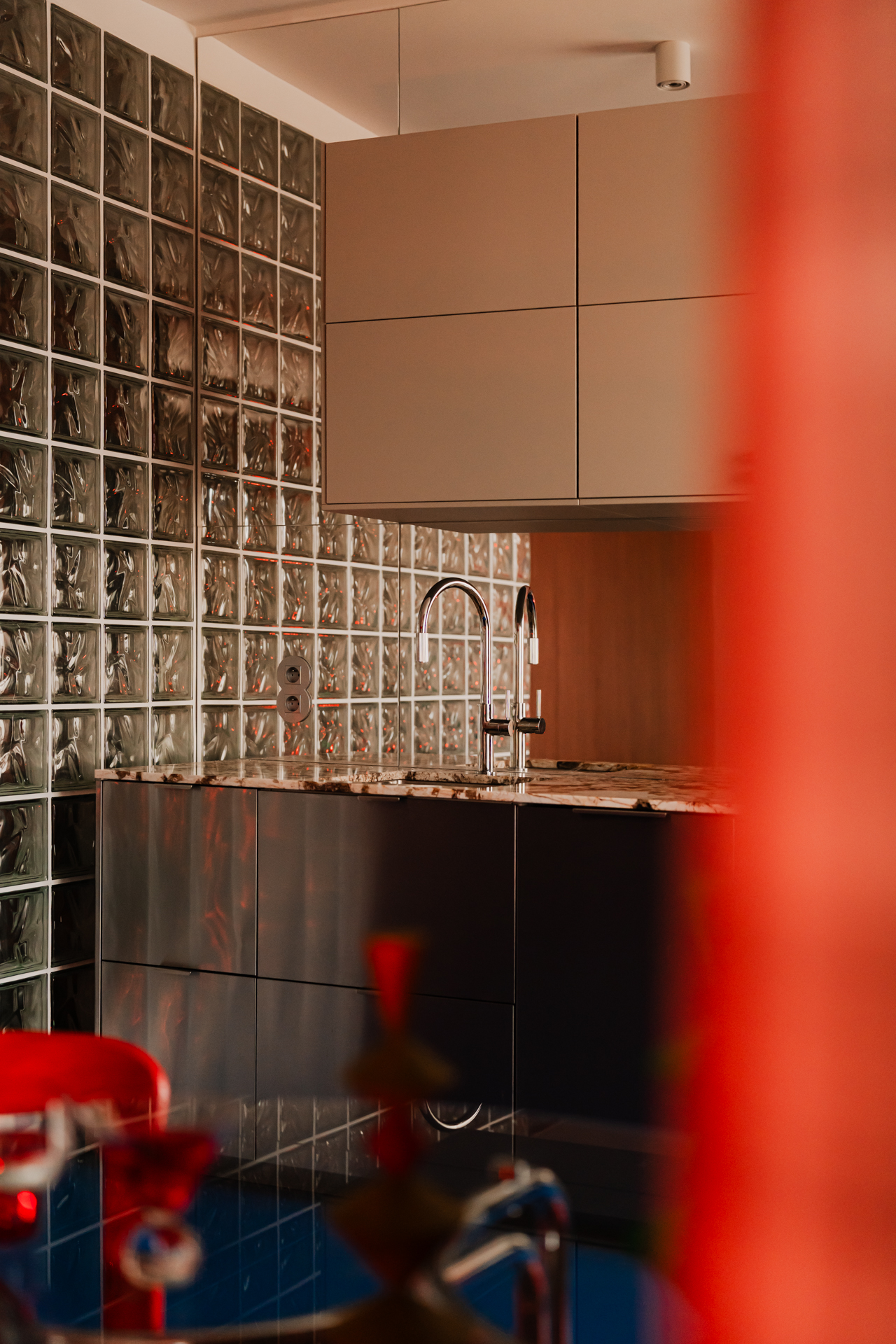 W części dziennej widać również konsekwentnie dobrane rzeźbiarskie wyposażenie wnętrza. W mieszkaniu pojawiają się między innymi owalny stół na metalowej podstawie, lampa z ruchomą oprawą oraz szklany stolik kawowy oparty na dużej betonowej kuli w kolorze intensywnej czerwieni. Do tego dochodzą kolorowe totemy Totem Studio Warsaw oraz praca Oskara Zięty, które wzmacniają kolekcjonerski charakter tej realizacji.