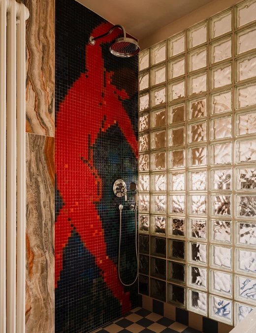 W łazience kontynuowany jest wątek ruchu poprzez mozaikę przedstawiającą czerwoną postać w tańcu, inspirowaną motywem z „Tańca” Henriego Matisse’a. Realizacja wykonana została we współpracy z katowicką manufakturą mozaik szklanych Truf!e. Naturalne światło wpadające przez luksfery rzuca na ściany ruchome refleksy i wzmacnia wrażenie dynamiki.