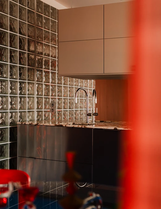 Niespełna 50 metrów kwadratowych projektantka podzieliła na trzy strefy funkcjonalne. Część dzienna łączy salon, jadalnię i otwartą kuchnię. Obok projektantka wydzieliła niewielkie miejsce do pracy. Dalej zaplanowała łazienkę oddzieloną ścianą z luksferów oraz małą sypialnię. Układ jest prosty, a narrację wnętrza prowadzą kolory i detale.