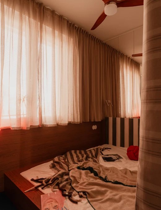 W odróżnieniu od intensywnej części dziennej, sypialnię projektantka zaprojektowała jako miejsce do wyciszenia. Na ciepłej drewnianej podłodze osadziła nisko łóżko, które zajmuje całą szerokość pomieszczenia. Ścianę wezgłowia wykończyła panelami z aksamitu w zielono-kremowe pasy oraz pionowymi lustrami, które optycznie powiększają niewielką przestrzeń i rozpraszają światło.