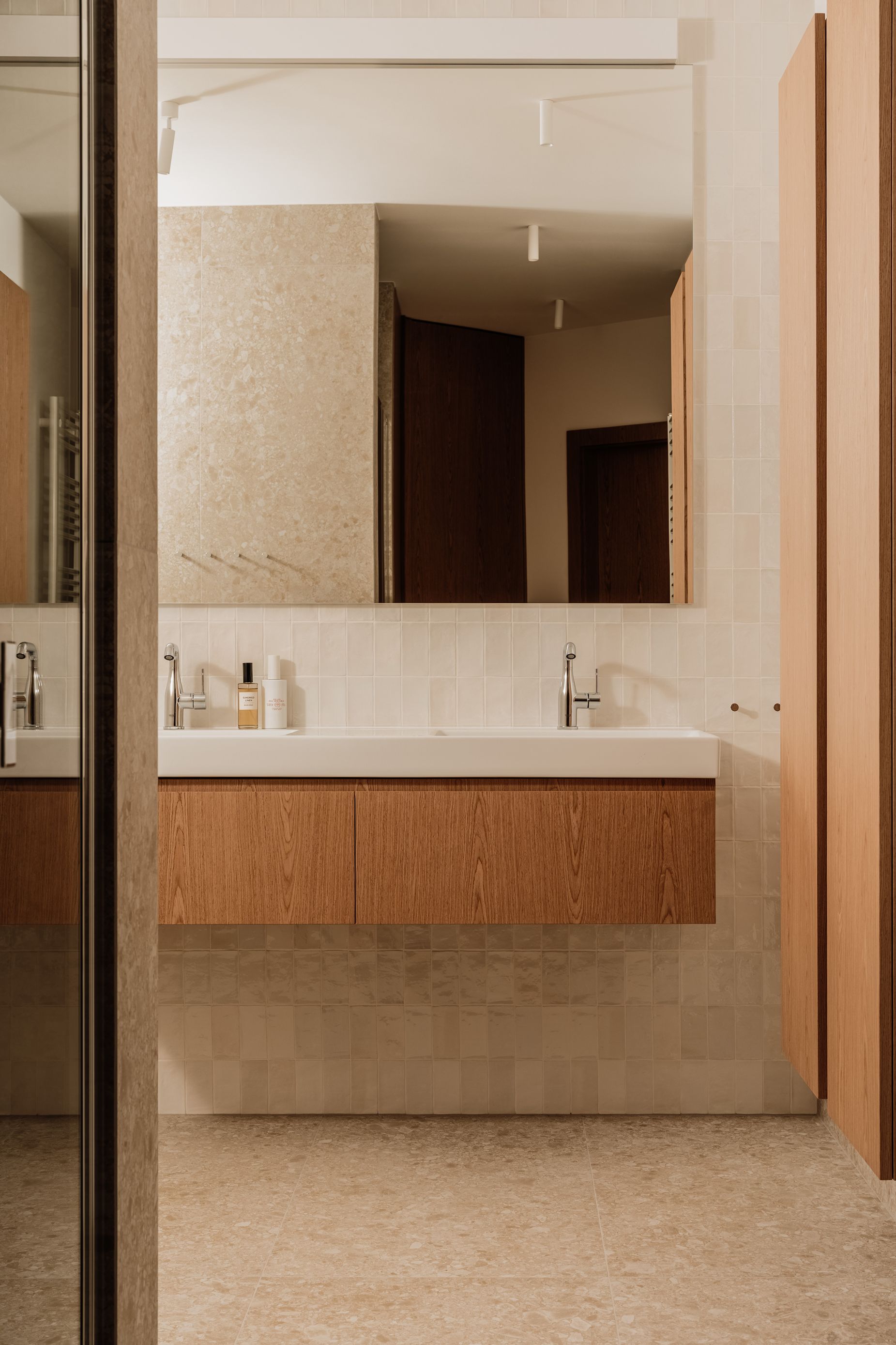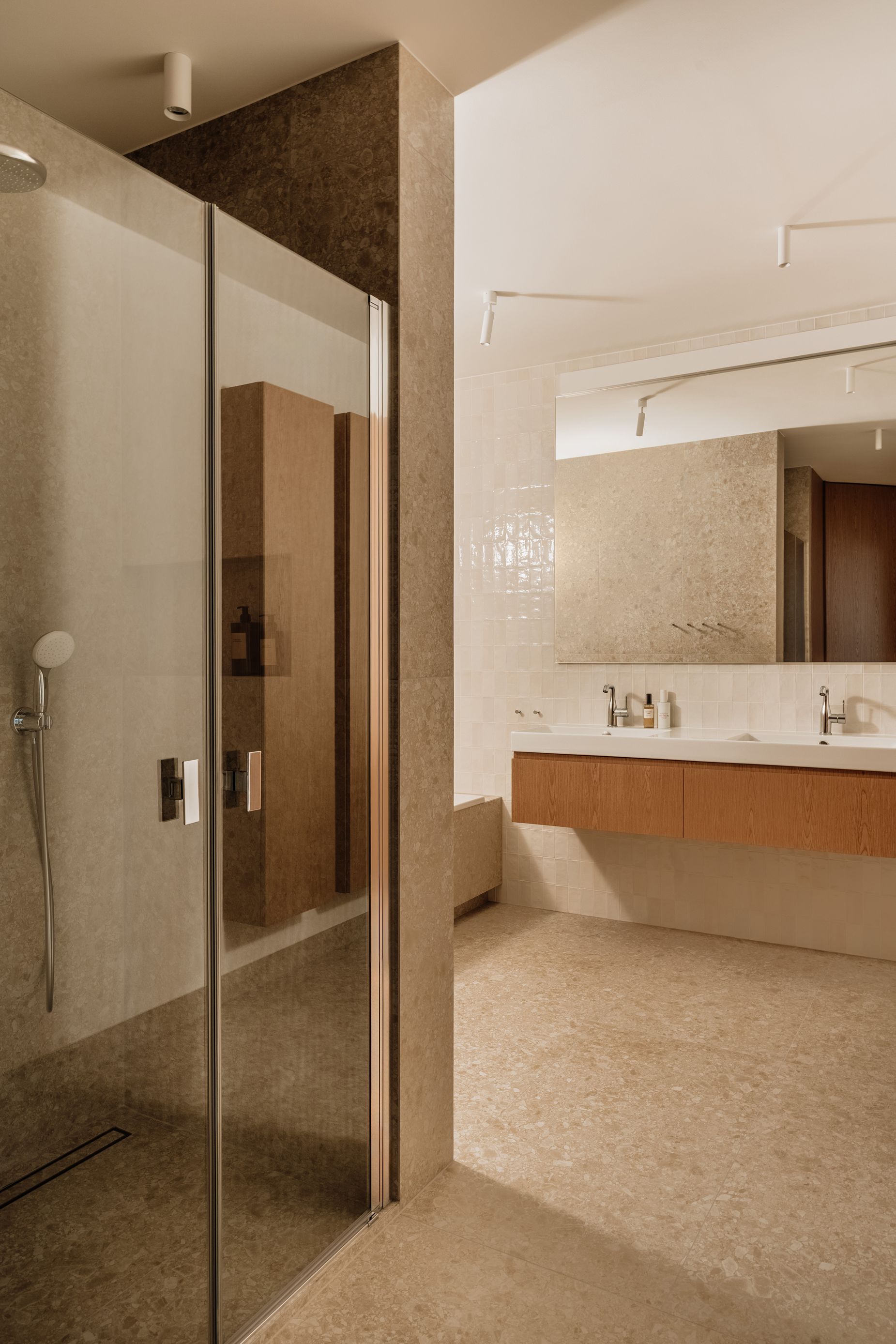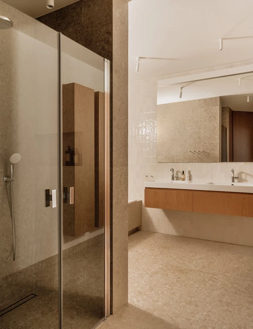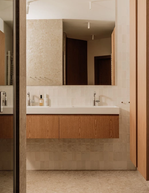 Łazienka, podobnie jak pozostałe pomieszczenia, została zaprojektowana w duchu konsekwencji materiałowej i spokojnej elegancji. To duża, komfortowa przestrzeń utrzymana w jasnych, neutralnych barwach, które nawiązują do tonacji całego mieszkania. Zestawienie naturalnego drewna z matowymi i błyszczącymi wykończeniami tworzy wyważoną kompozycję.