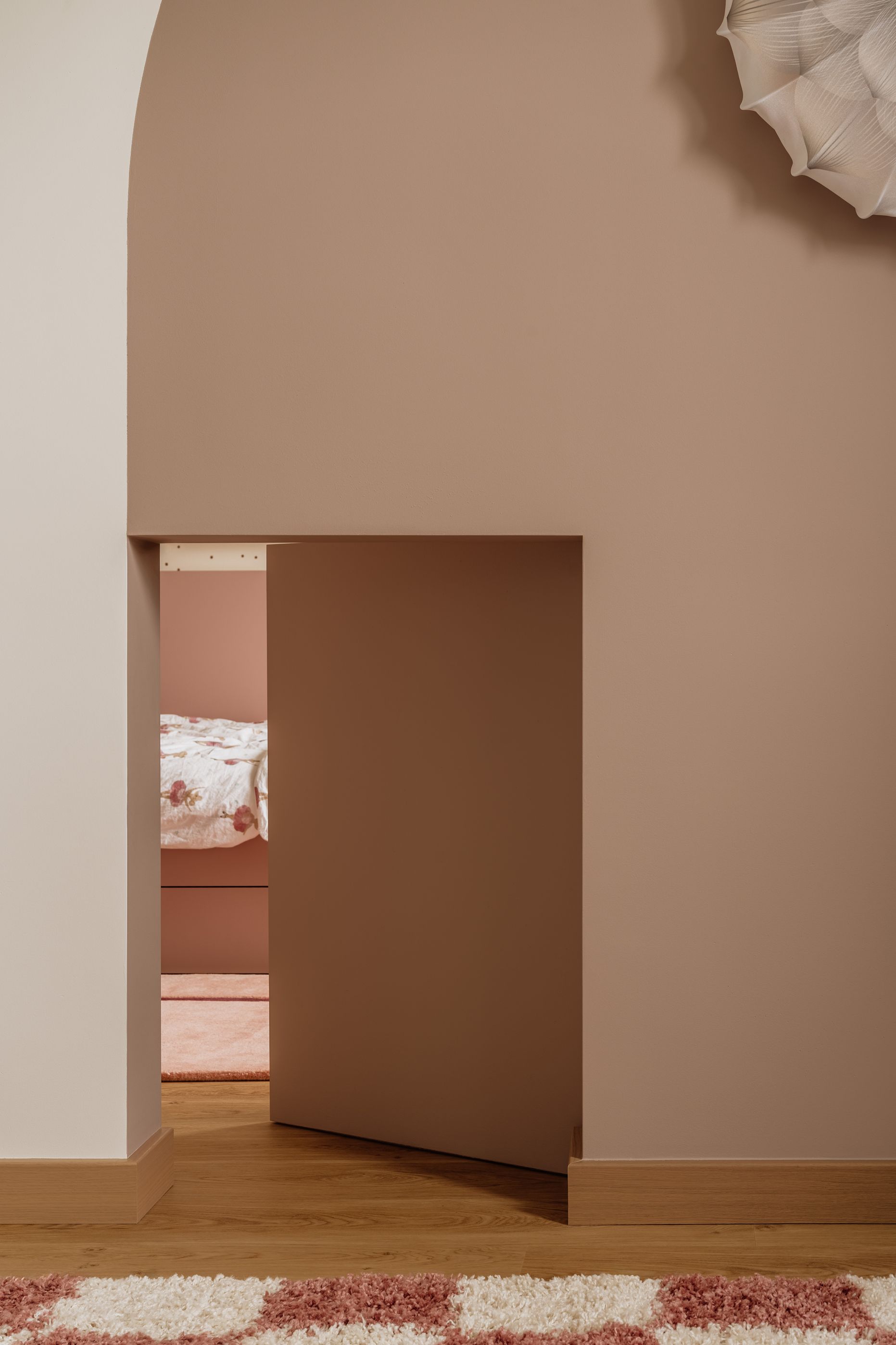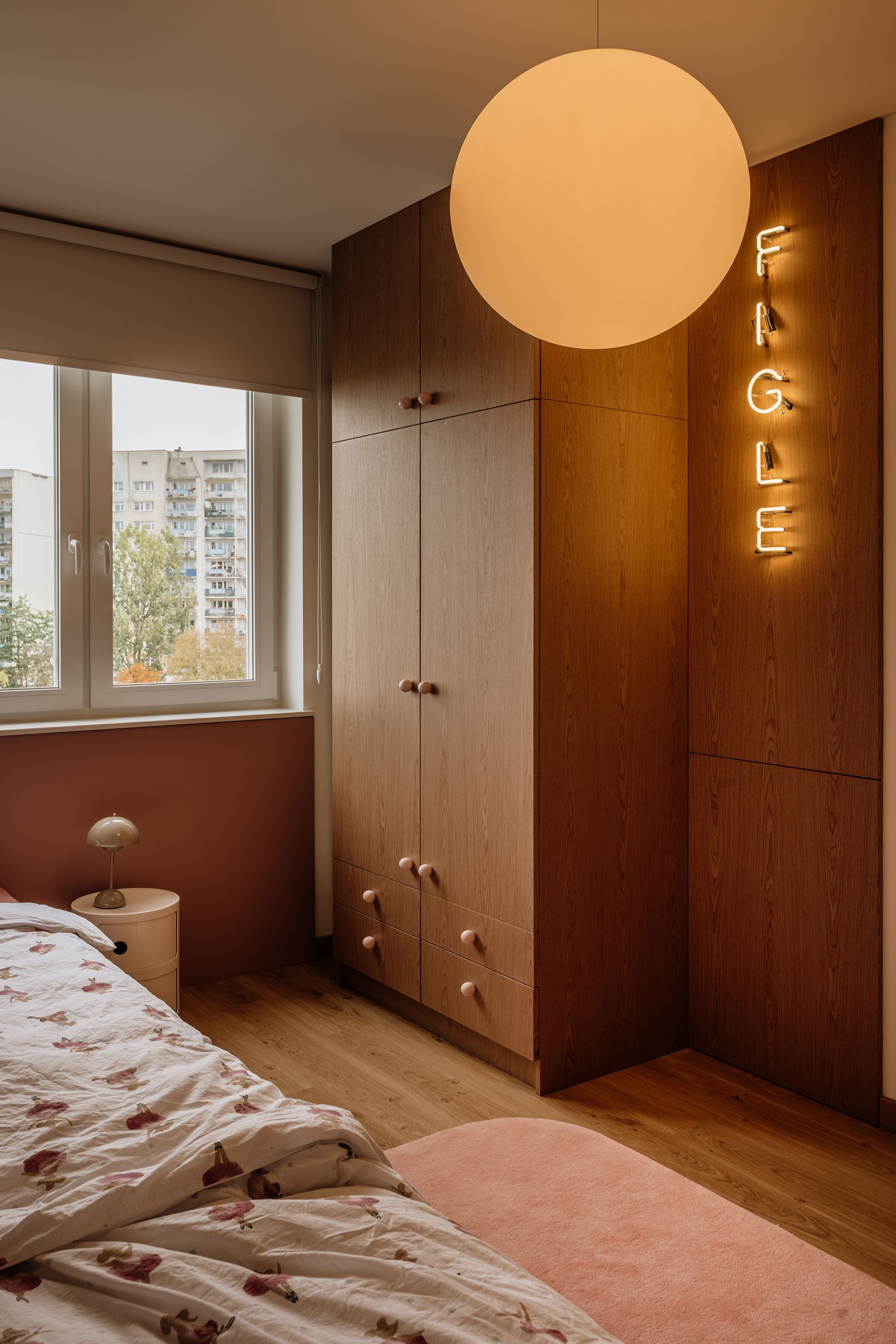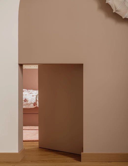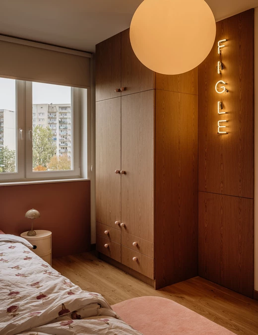 Z kolei strefa dziecięca to najbardziej swobodny fragment projektu. Połączenie pokoju z bawialnią otwiera przestrzeń na różnorodne aktywności, a pastelowe kolory, miękkie struktury i neon „FIGLE” nadają jej energii i lekkości.