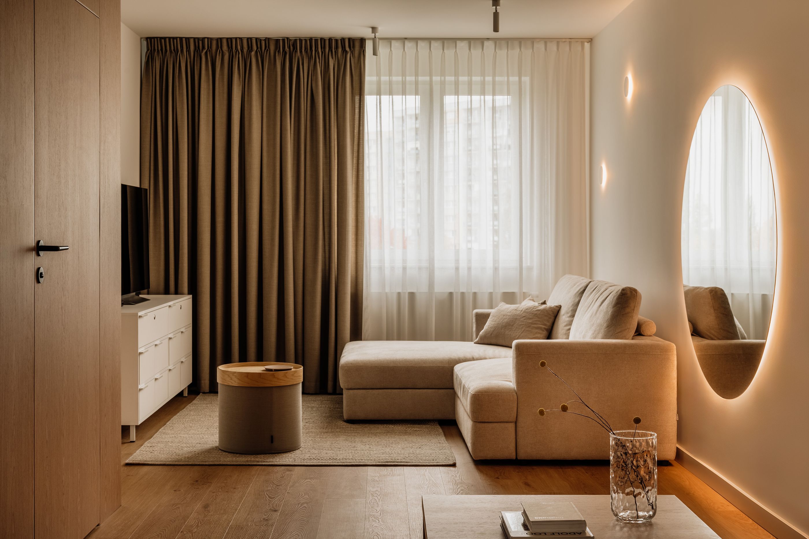 Na parterze widać to szczególnie wyraźnie. Salon, jadalnia i kuchnia są ze sobą optycznie i materiałowo powiązane, choć każda strefa pełni inną funkcję. W salonie głównym akcentem jest duże, okrągłe lustro z podświetleniem, które odbija przestrzeń i działa jak świetlny punkt orientacyjny, dodając całości lekkości i głębi.