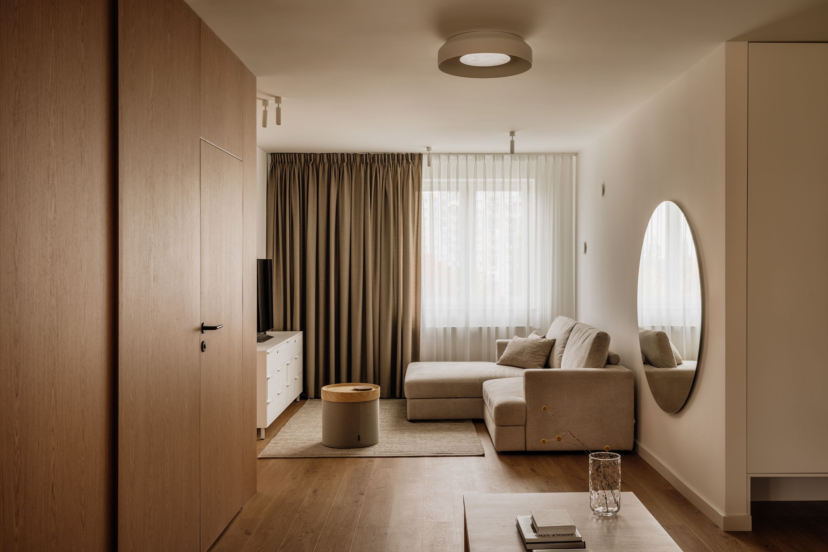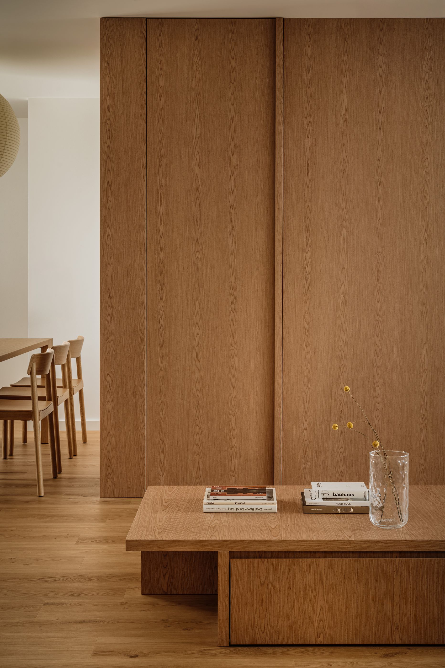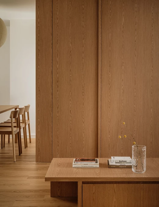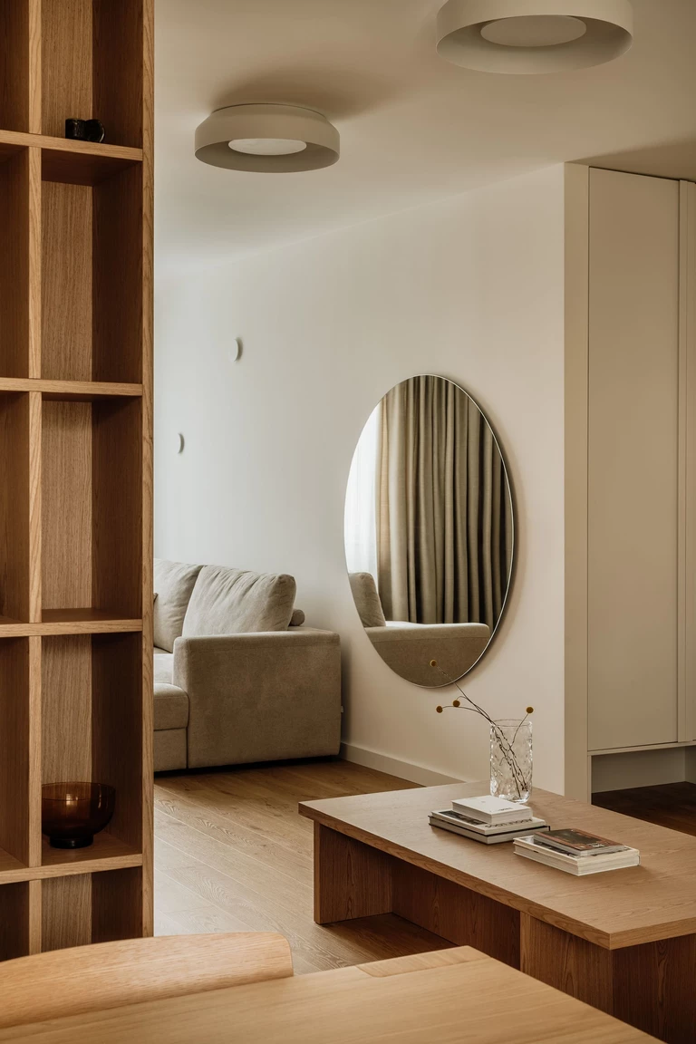 Już od progu czuć, że nowy układ nadał mieszkaniu świeży rytm, znacznie bardziej adekwatny do współczesnych potrzeb. Wspólnym mianownikiem projektu stał się naturalny dąb, który obecny jest w zabudowach, drzwiach, posadzce, półkach i meblach. Jego ciepły, spokojny odcień tworzy estetyczny fundament wnętrza, porządkując przestrzeń i nadając jej ponadczasowej spójności.