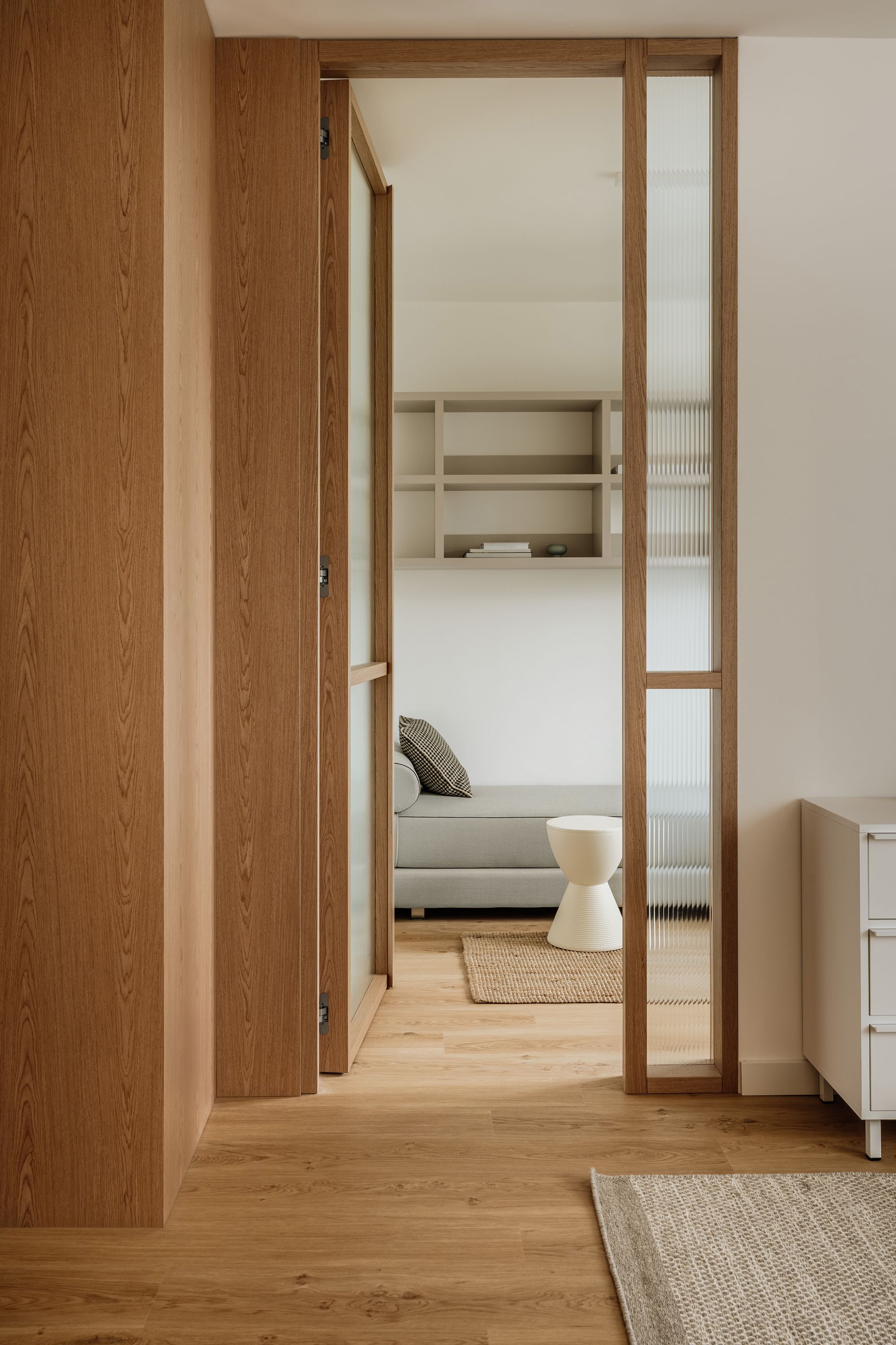Istotnym detalem parteru są drzwi z ryflowanym szkłem Flutes, wykonane na zamówienie. Oddzielają salon od otwartego gabinetu, filtrując światło i wprowadzając subtelną granicę między przestrzeniami. W gabinecie stanęła leżanka duńskiej marki Softline.