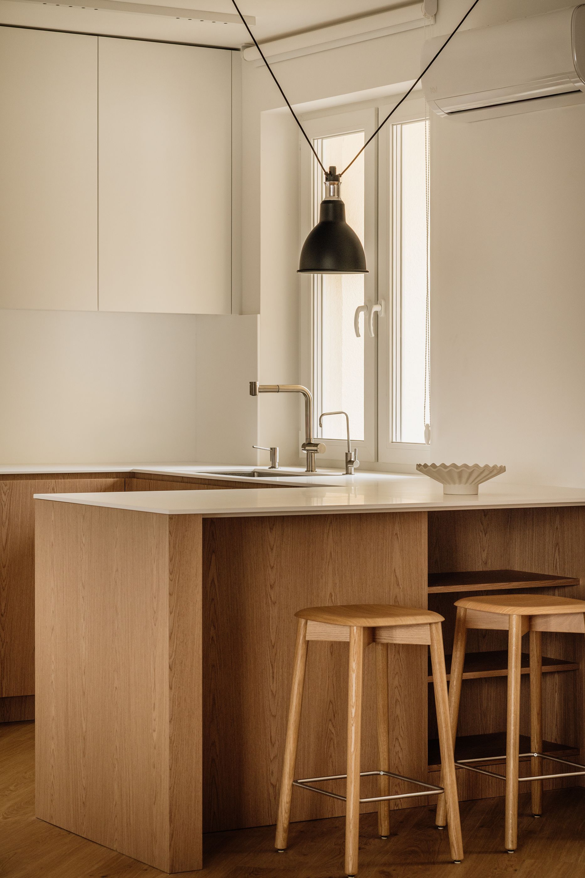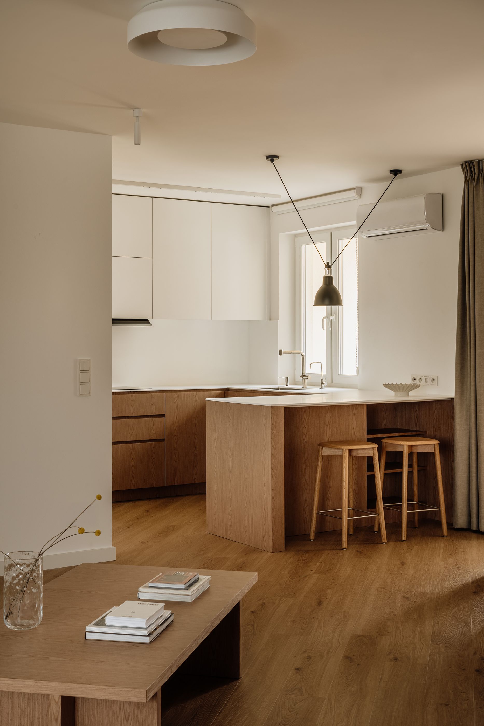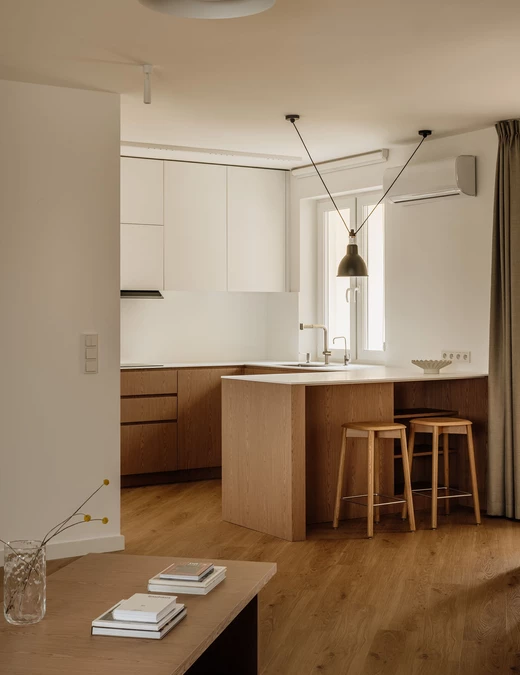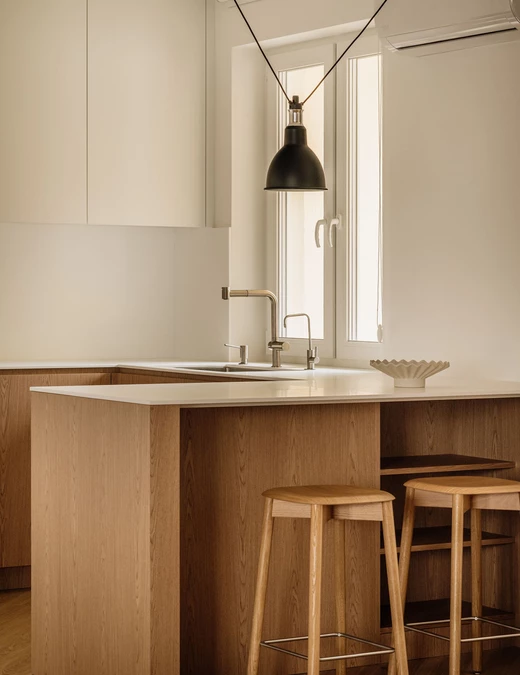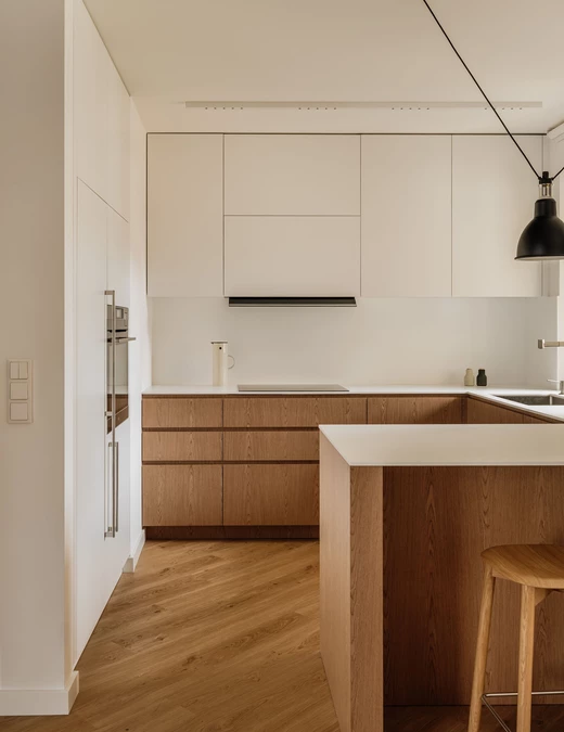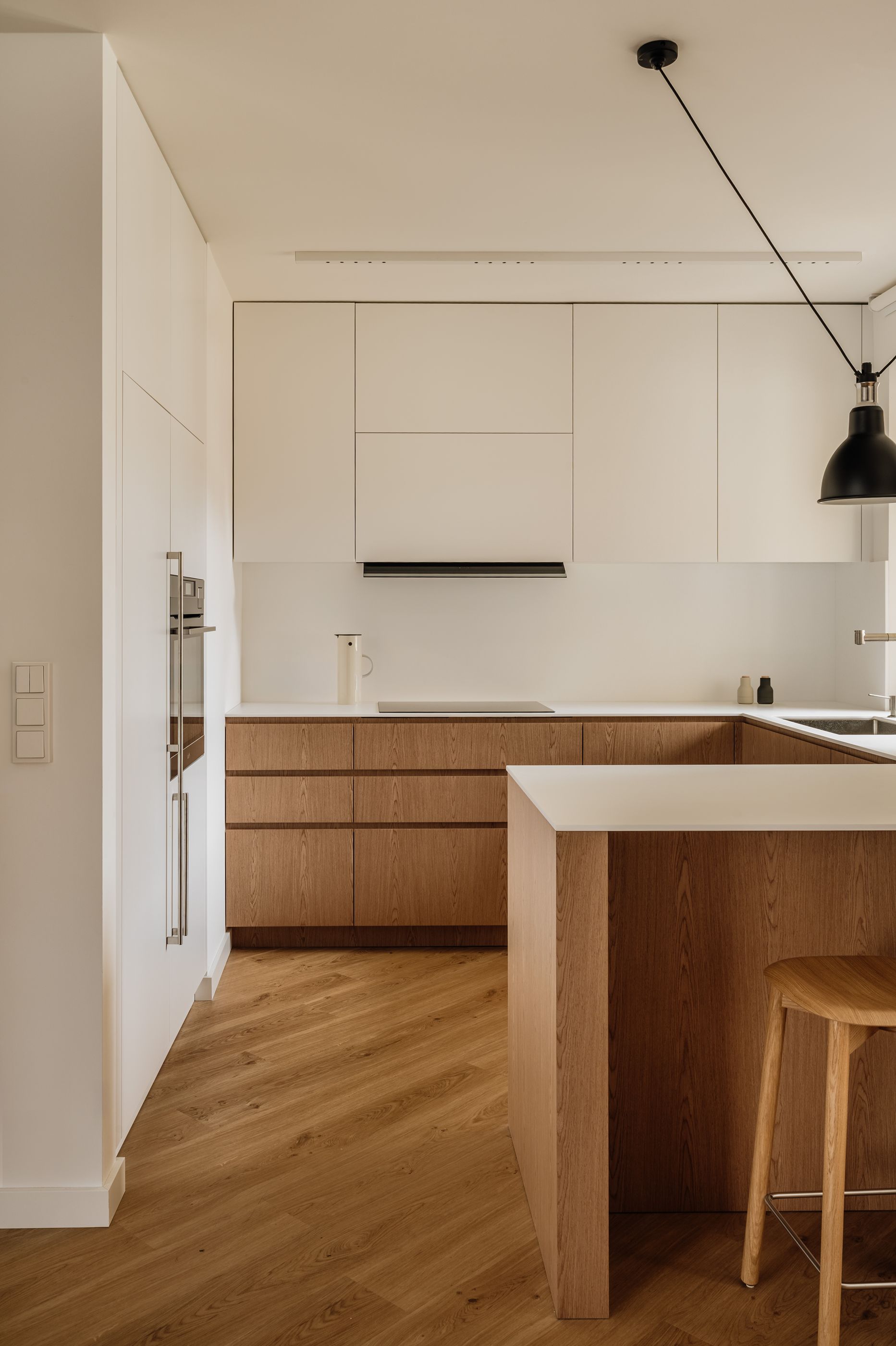 Kuchnię zaprojektowano w duchu funkcjonalnego minimalizmu. Akrylowe blaty podkreślają nowoczesny charakter, a zestawienie jasnych górnych szafek z dębowym fornirem dolnej zabudowy buduje harmonijną całość. Sercem kuchni stała się wyspa, której towarzyszą lekkie w formie hokery HAY, a nad całością zawisła modułowa, modernistyczna lampa DCW Grass.