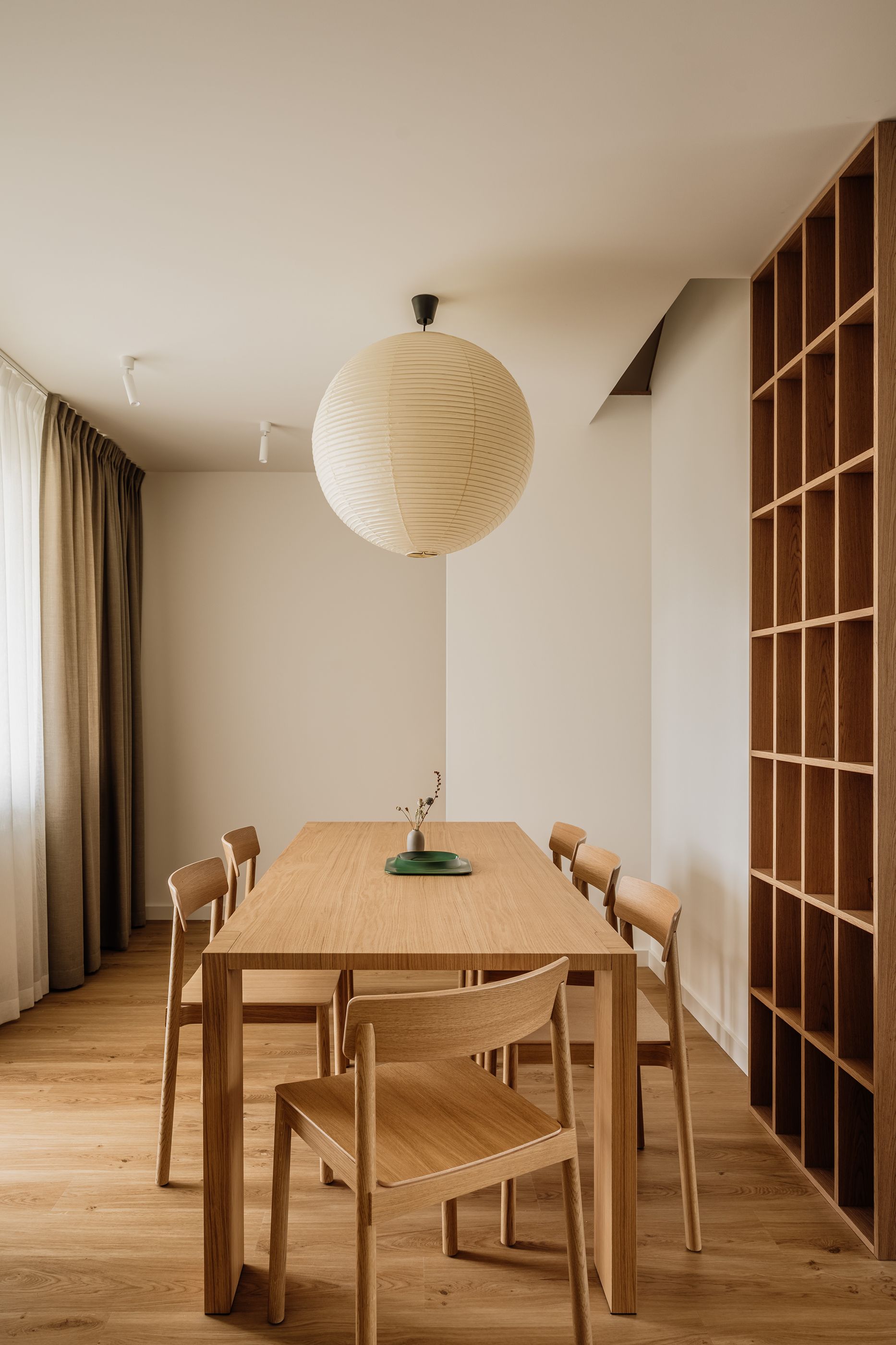 W jadalni króluje dębowy stół polskiej marki Lawaform, otoczony krzesłami Betty od &tradition. Nad nim zawisła ikoniczna lampa Vitra Akari, która swoim miękkim światłem subtelnie ociepla wnętrze i wprowadza artystyczny ton. To połączenie klasyki designu z naturalnym materiałem tworzy elegancję opartą na świadomych, przemyślanych wyborach.