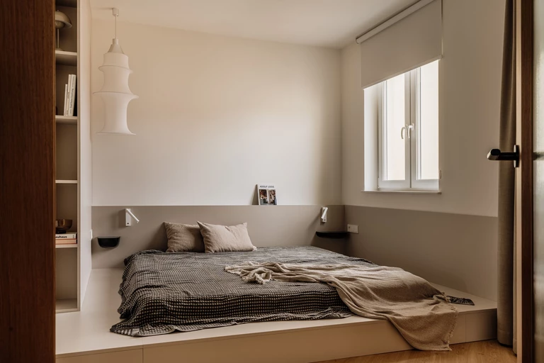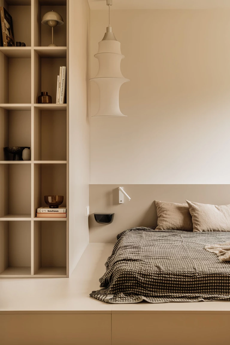 Piętro kontynuuje materiałowy i formalny charakter parteru, jednak operuje znacznie intymniejszym tonem. Sypialnię zaprojektowano w duchu skrajnego wyciszenia: dominuje jasna zabudowa, niska platforma łóżka inspirowana japońskim minimalizmem oraz dyskretne, punktowe oświetlenie. Atmosferę dopełnia klasyczna lampa Artemide Falkland o delikatnej, tekstylnej formie.