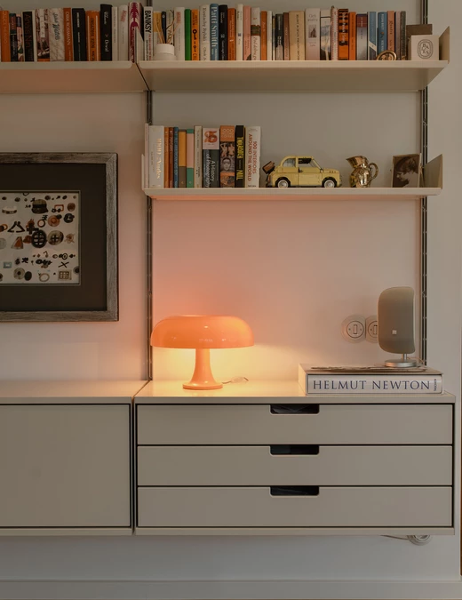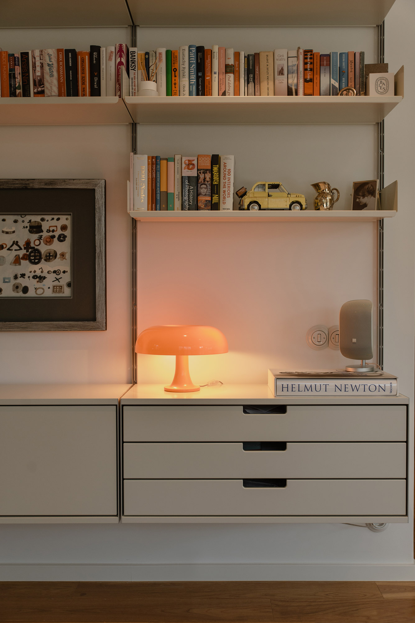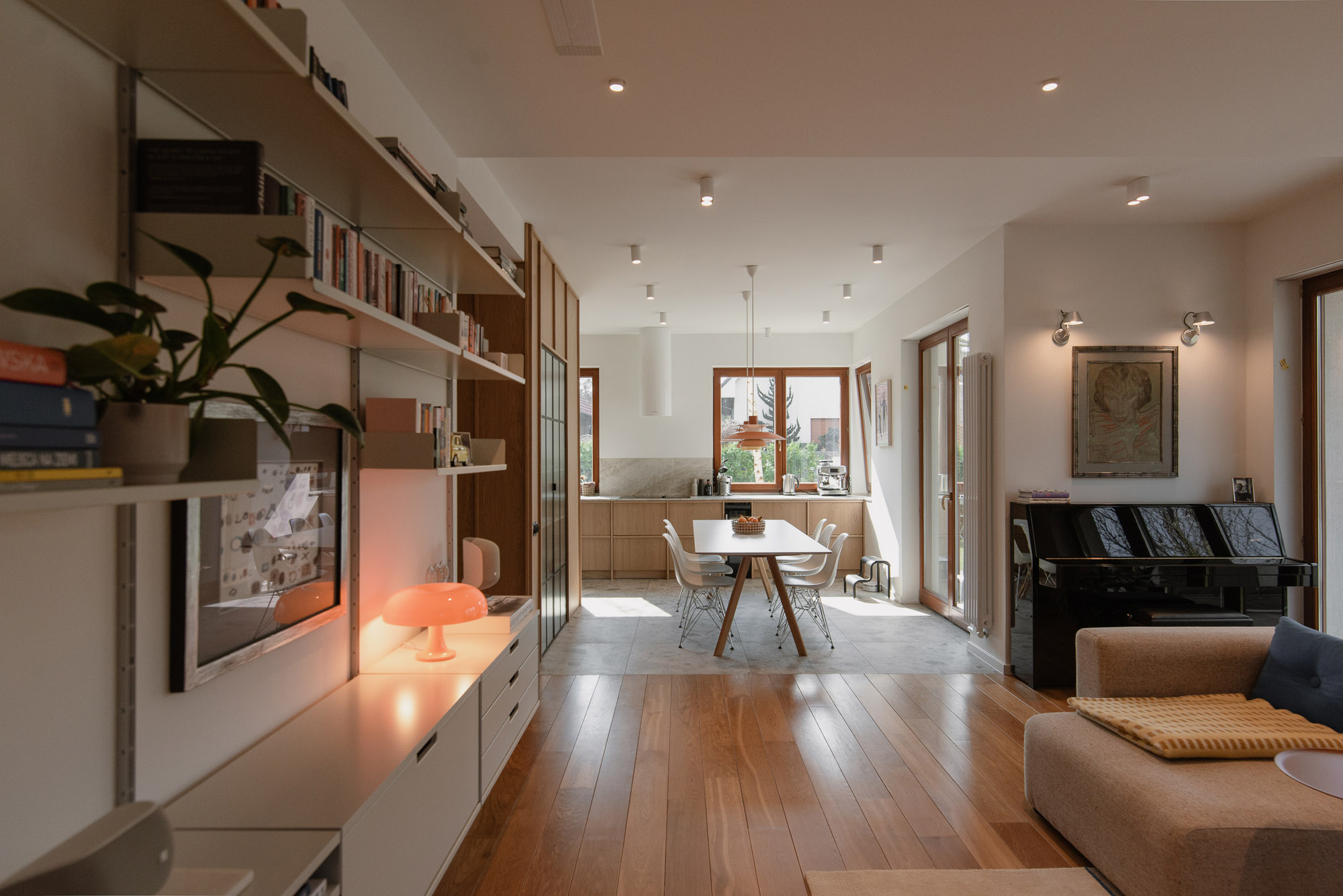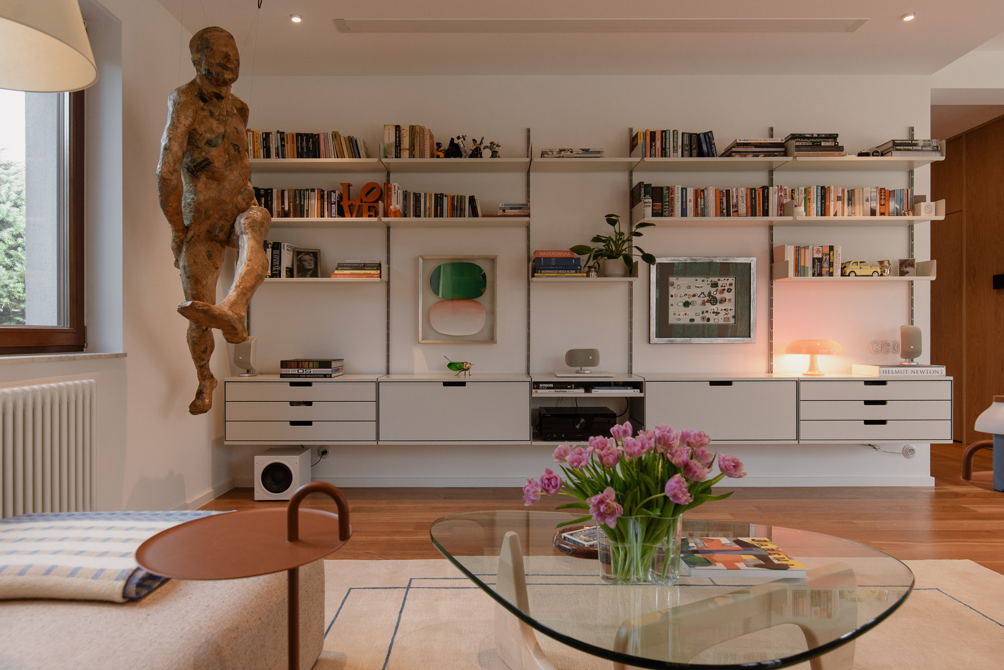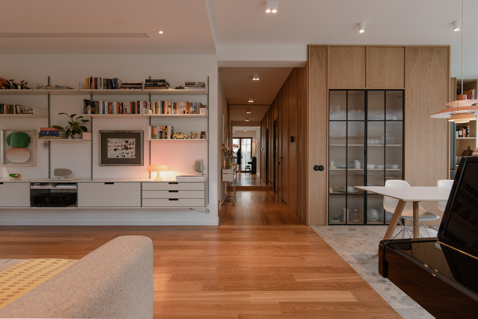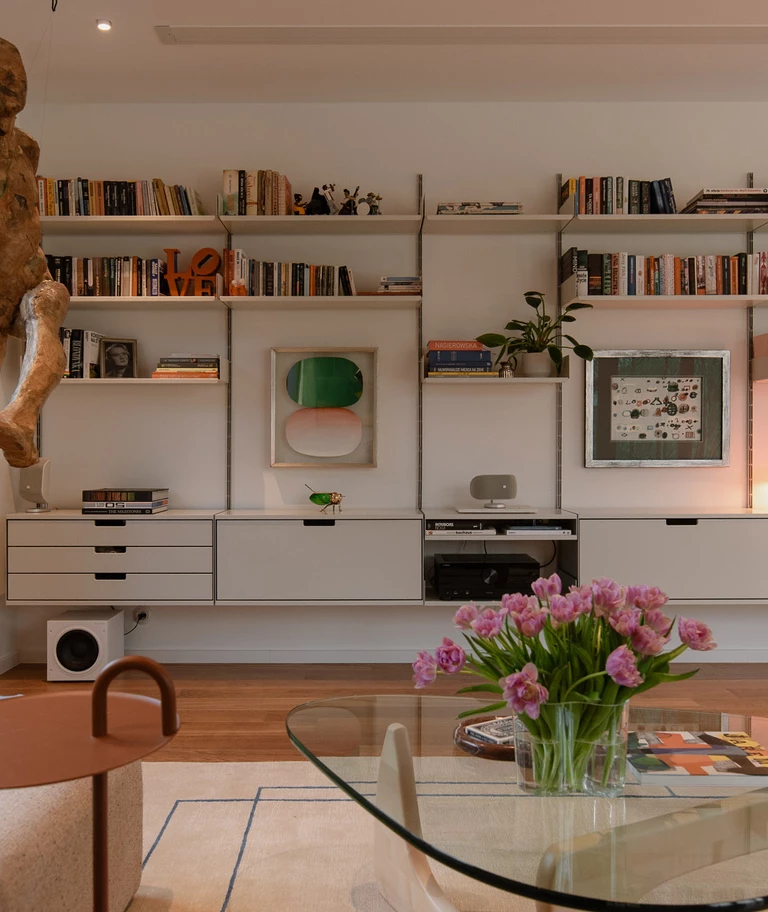 Wnętrze uzupełniają design-ikony: krzesła Vitra Eames, lampy Louis Poulsen, sofa Muuto, kinkiety Artemide czy modułowa komoda USM w holu. Neutralne tło daje nam swobodę zmiany ekspozycji bez rewolucji we wnętrzu – wyjaśnia autorka projektu Kinga Kin.