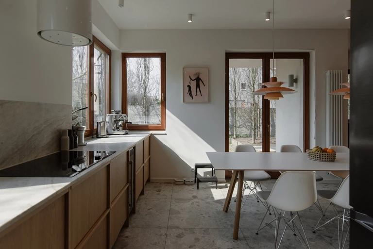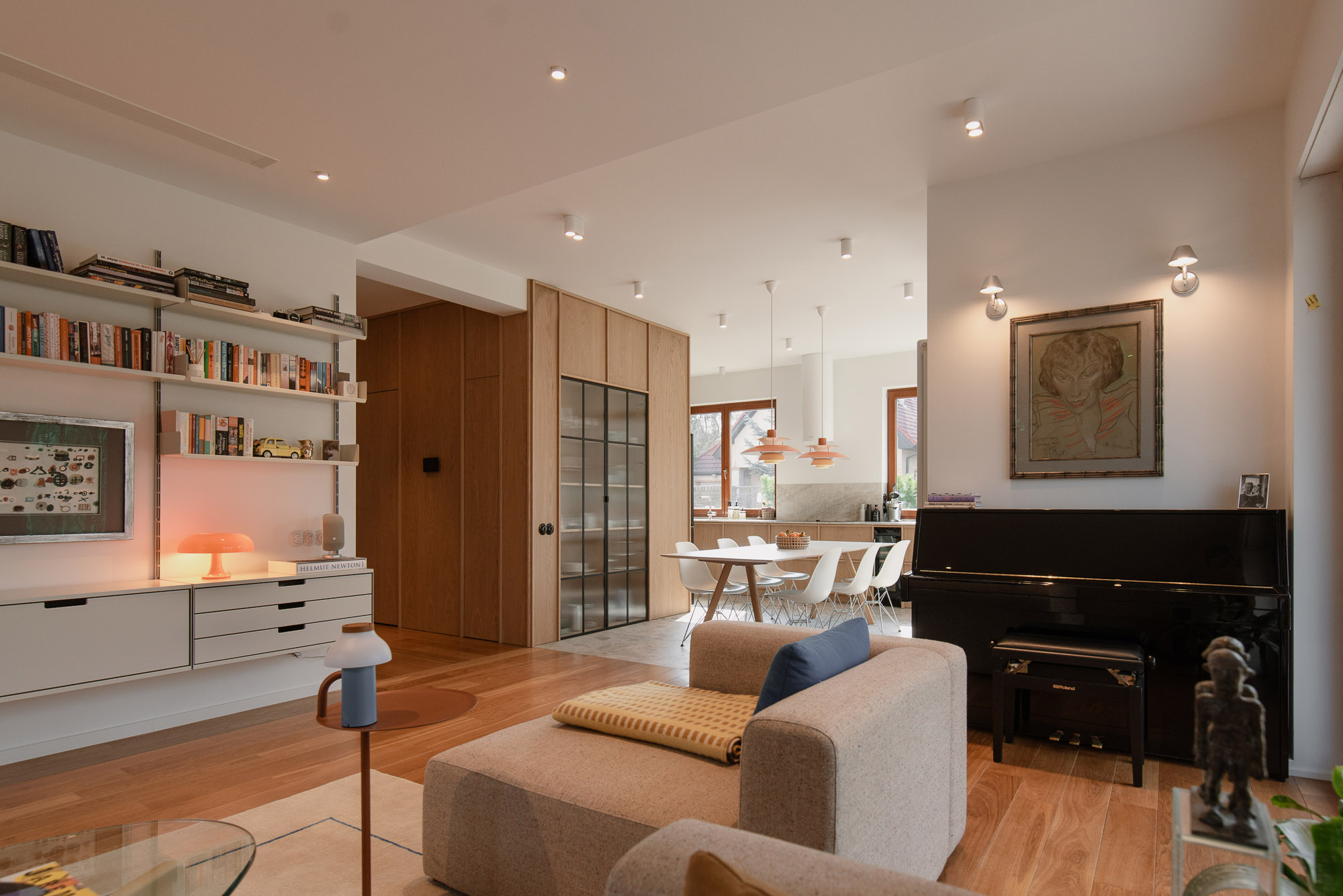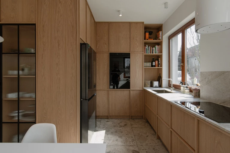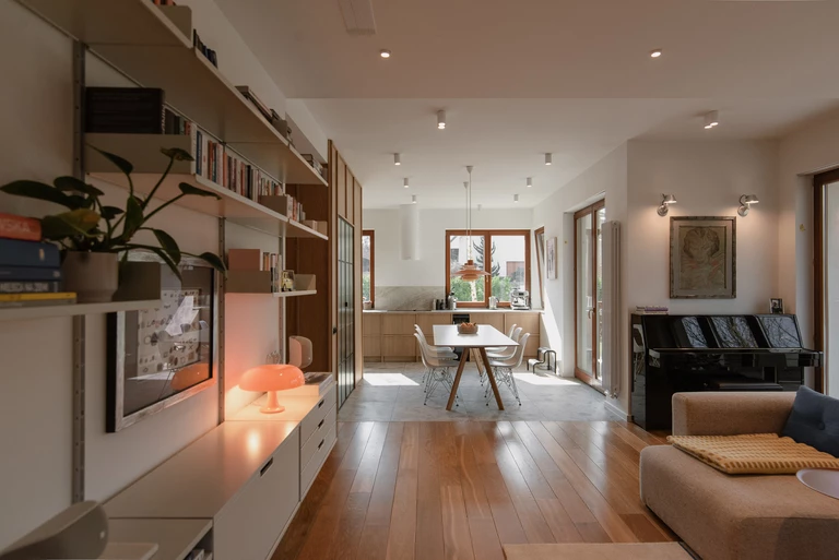 Program domu jest prosty i czytelny. Parter obejmuje przedsionek, łazienkę gościnną, salon oraz otwartą kuchnię z jadalnią wychodzącą na ogród. Na piętrze znalazły się sypialnia główna z garderobą i łazienką, kompaktowa łazienka dzieci, siłownia oraz gabinet. Miejsca do przechowywania sprytnie ukryto w ścianach, dzięki czemu wnętrze domu pozostaje lekkie, spokojne i gotowe na zmieniającą się ekspozycję sztuki.