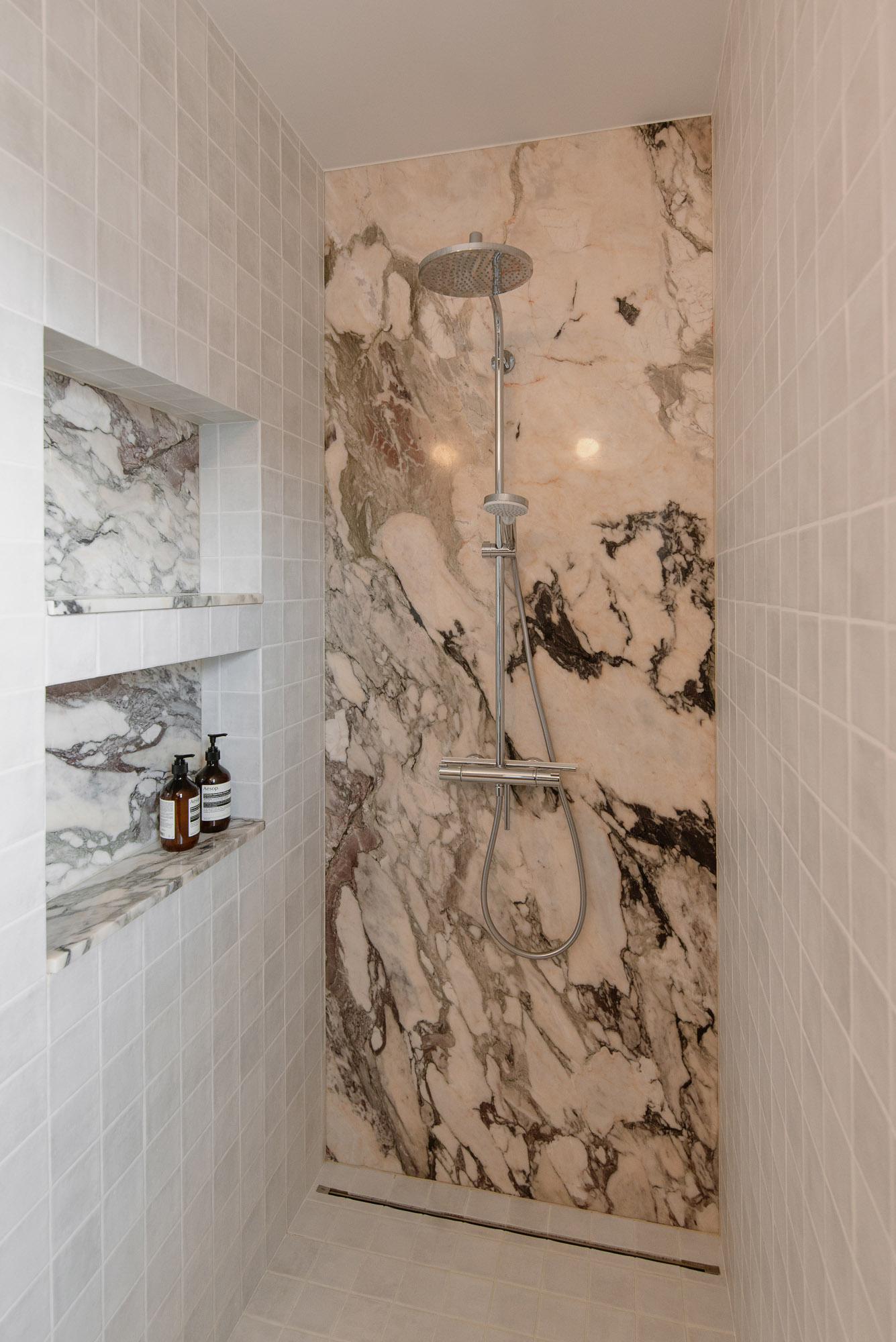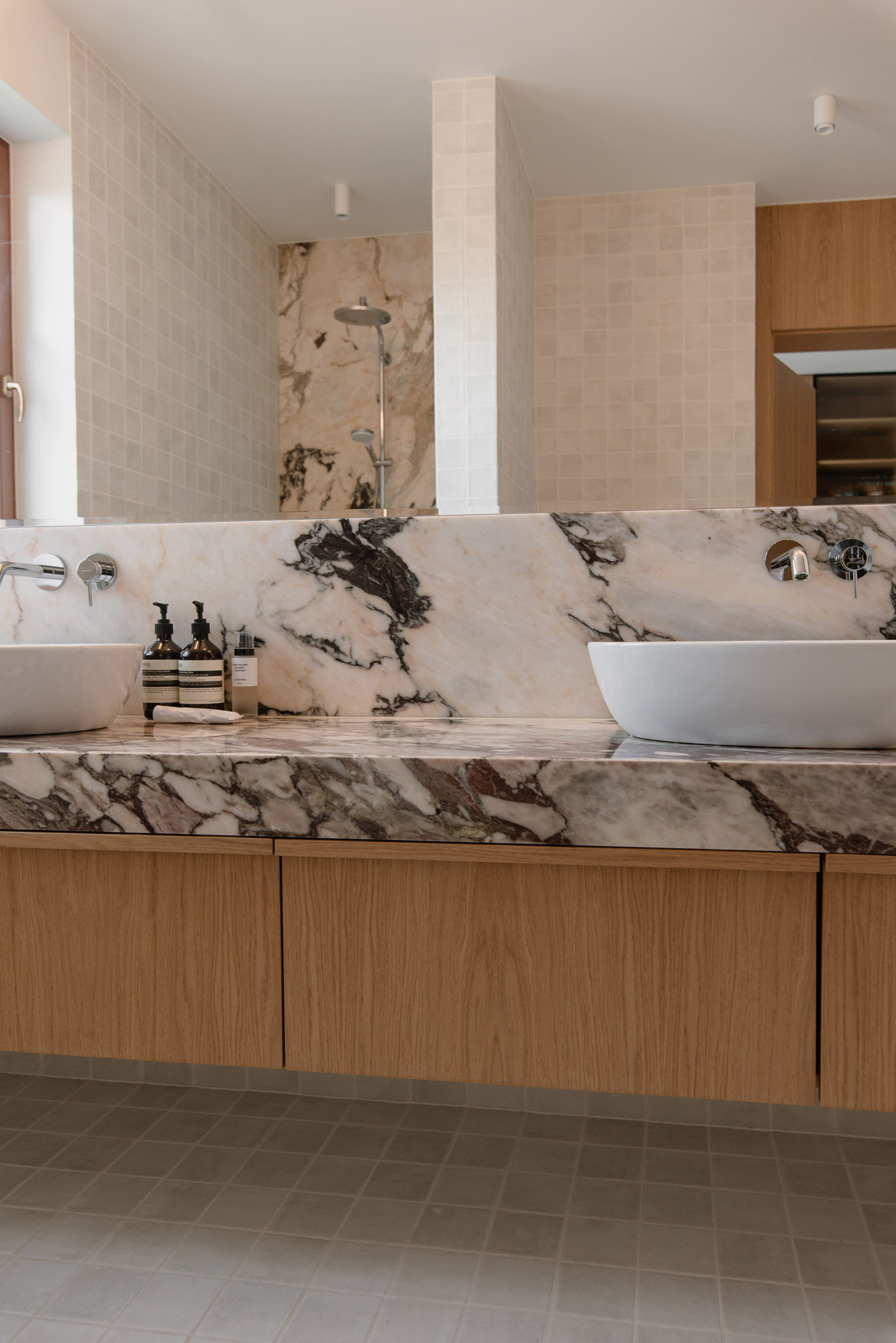 Granice funkcji wyznaczają tu posadzki. W częściach suchych na podłodze zastosowano dąb lakierowany, w strefach roboczych i przy wejściu płytki w dużych formatach.