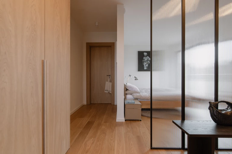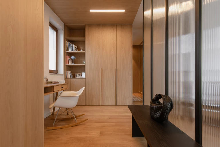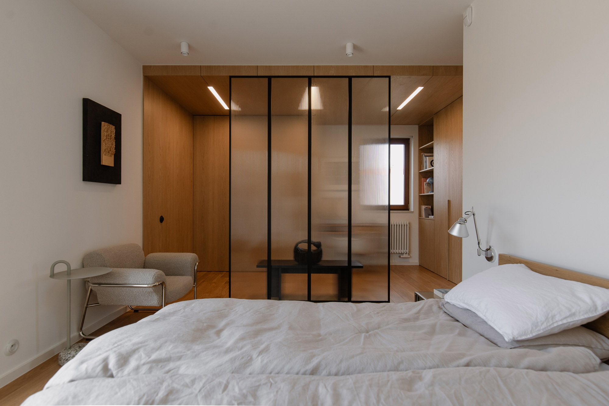 Część prywatna zlokalizowana jest na piętrze. Sypialnię połączono z miejscem do makijażu i kameralnym kącikiem do pracy. Podobnie jak na parterze, dodatkowe funkcje ukryto w drewnianym kubiku oddzielonym ryflowanym szkłem, które zapewnia intymność, nie zabierając jednocześnie światła.