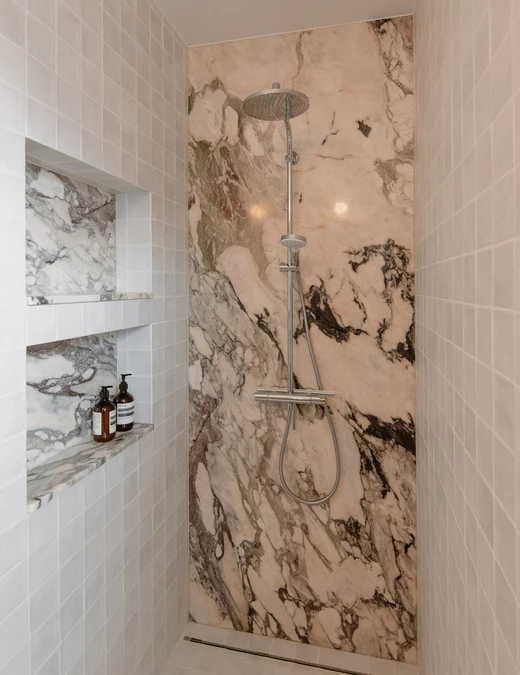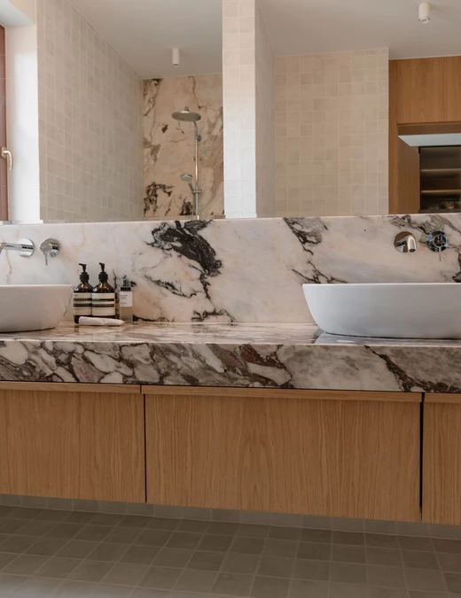 Tuż obok zaplanowano łazienkę gospodarzy, w której króluje kamień – wykonano z niego zarówno blat, wysoki pas za umywalkami, jak i ścianę kabiny prysznicowej. Resztę dopełniają matowe drobne płytki i dębowa szafka.